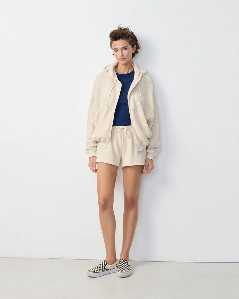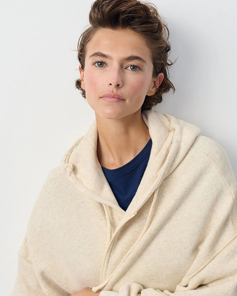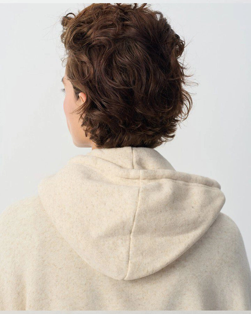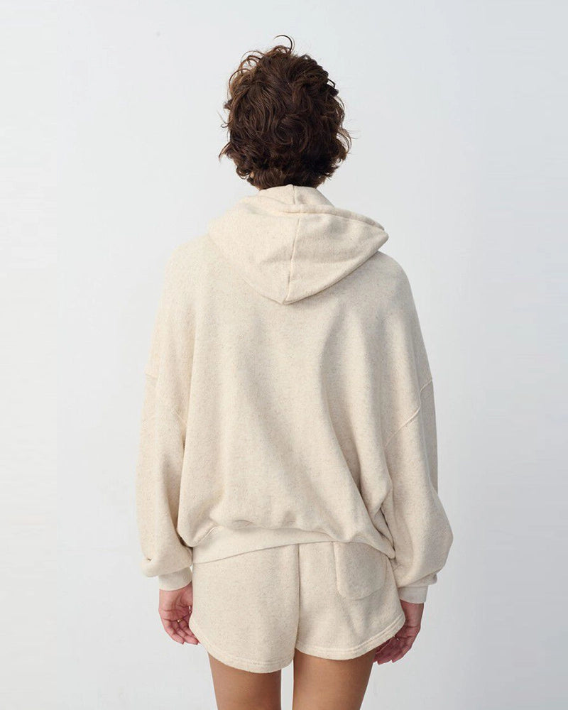 Loose-fitting hoodie. Fastened with a zipper. The sweatshirt has two pockets and is finished with cuffs.