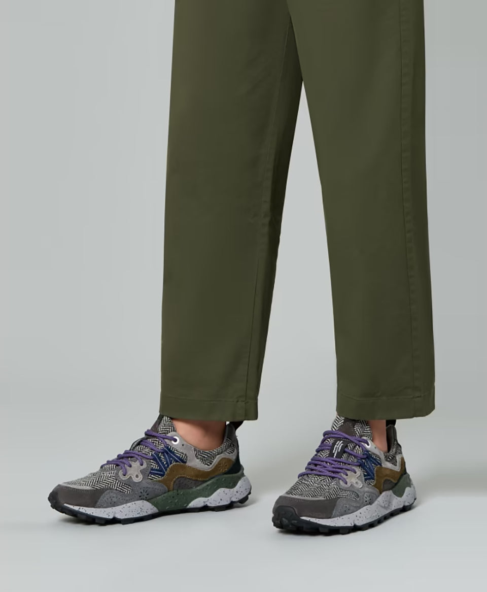 The YAMANO 3 sneakers from Japanese brand Flower Mountain feature a lightweight sole with a rubber, tractor-like bottom. They're made of technical fabric and colorful suede elements decorated with small, openwork patterns. They fasten with hiking-inspired laces. Inside, they feature an antibacterial, natural cork insole.