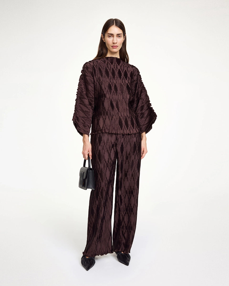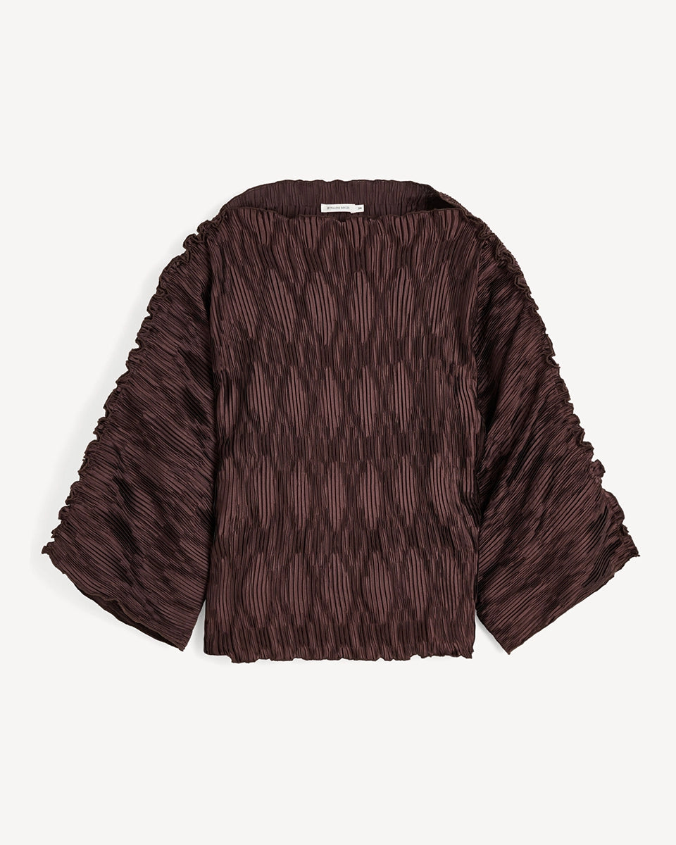 This elegant Tralluman By Malene Birger blouse features a boat neckline and wide 3/4 sleeves. It has a straight cut and a relaxed fit. Crafted from a satin, pleated fabric, it pairs beautifully with elegant, flowing trousers and jeans. Create the perfect evening ensemble by pairing the blouse with Letitia trousers.