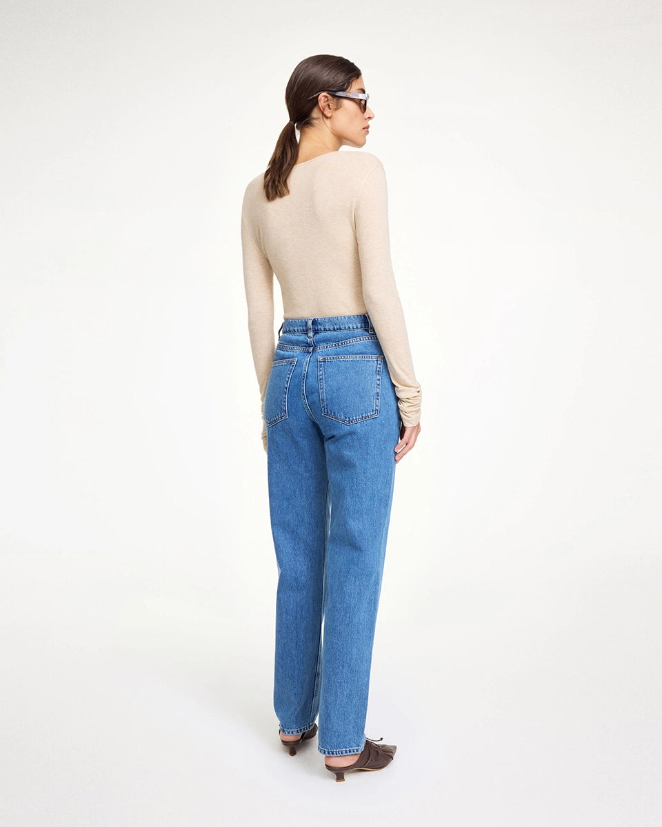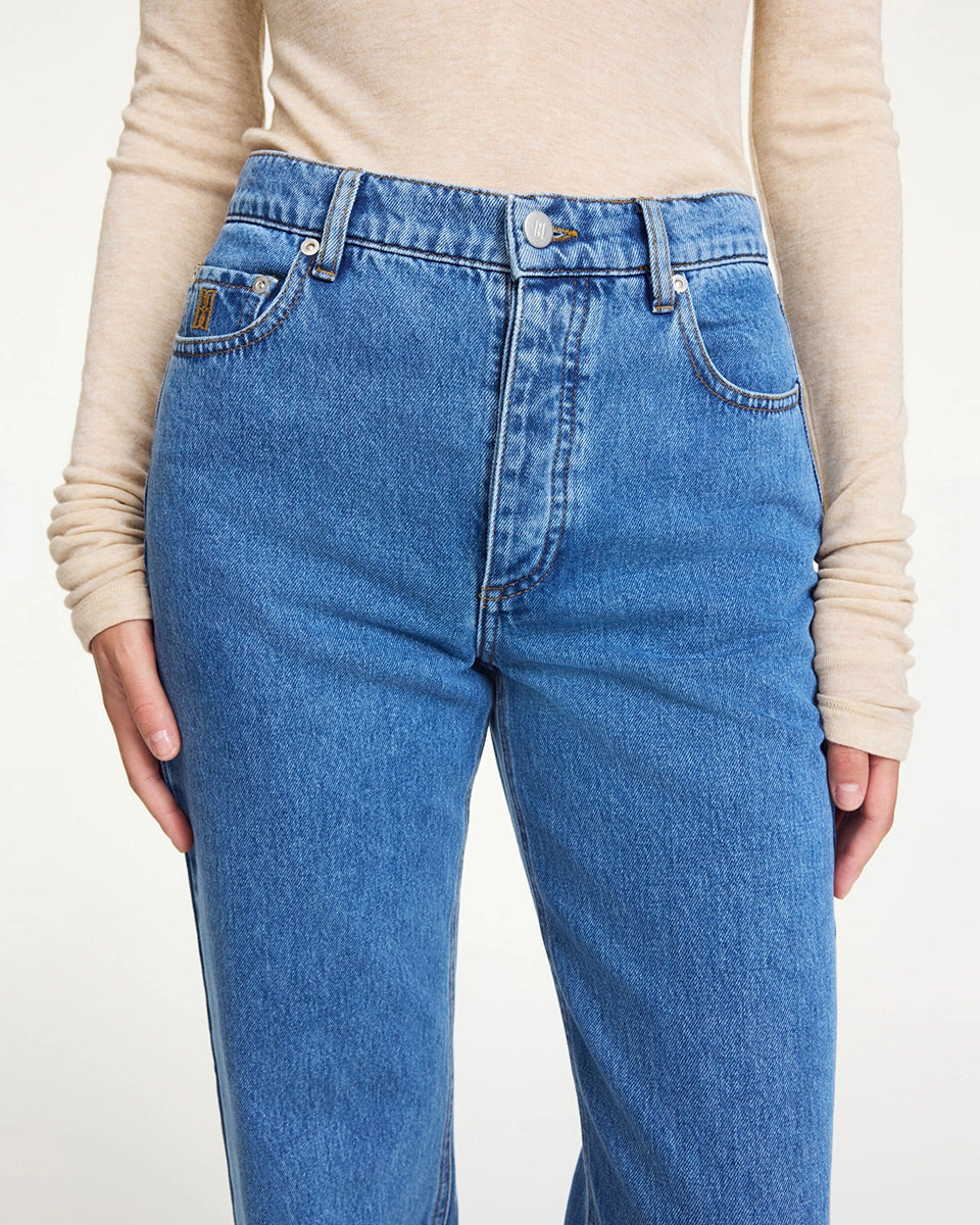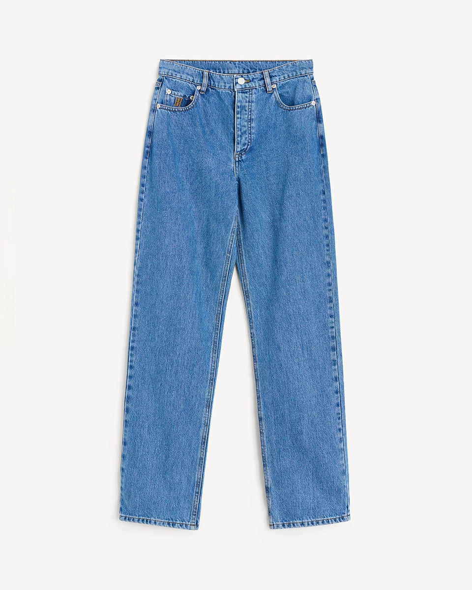 Classic blue Chicago By Malene Birger jeans with a high waist and straight leg. They fit snugly through the hips and feature a five-pocket design. The smallest pocket on the right side features a small, embroidered brand logo. Made of organic cotton.