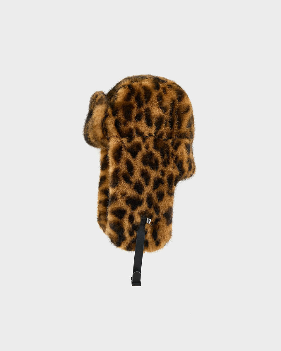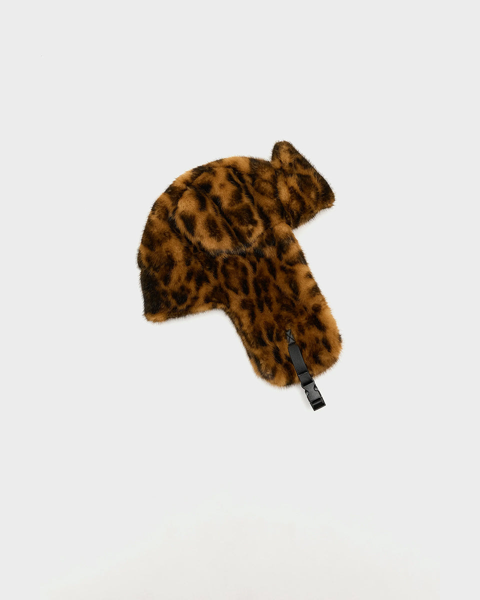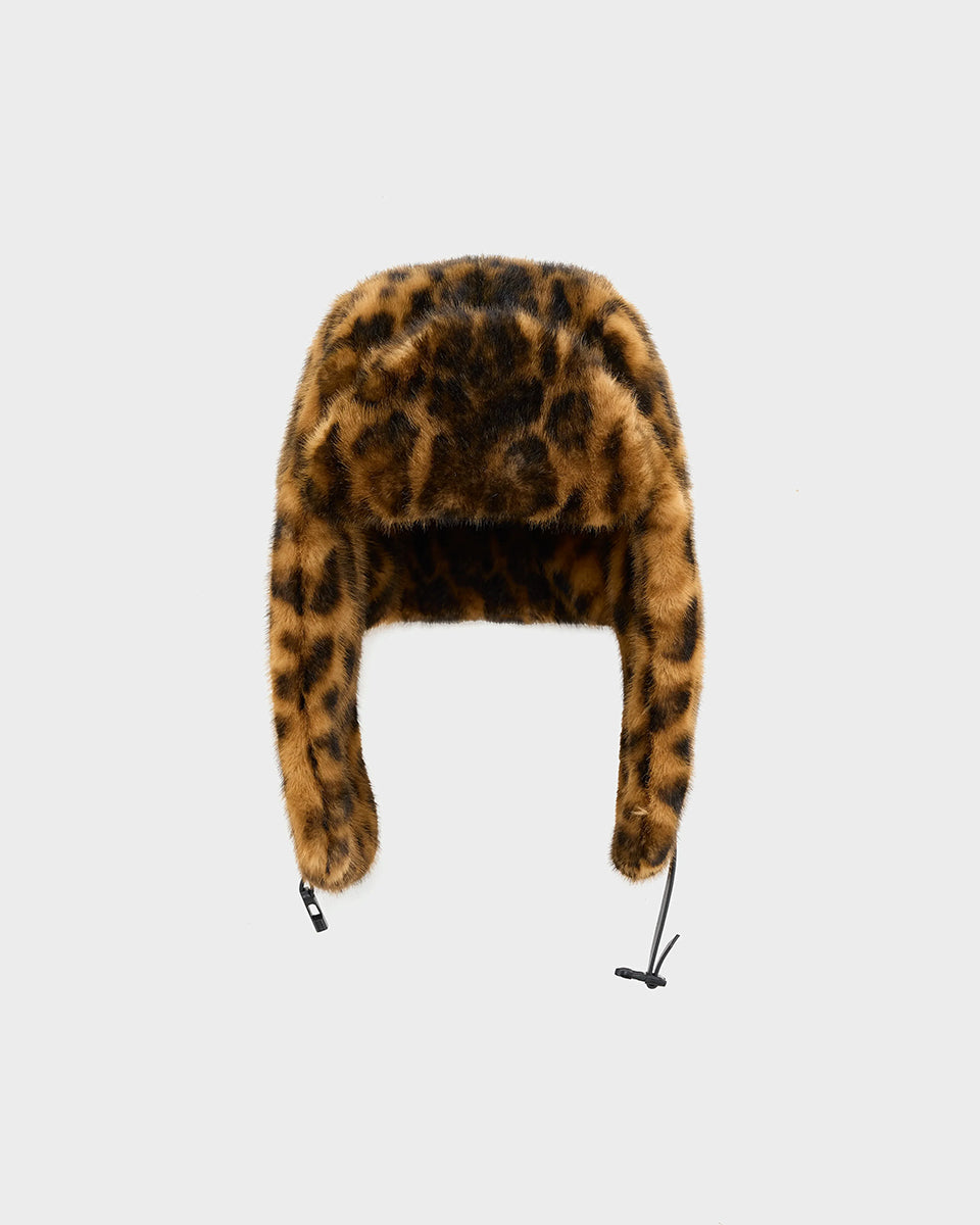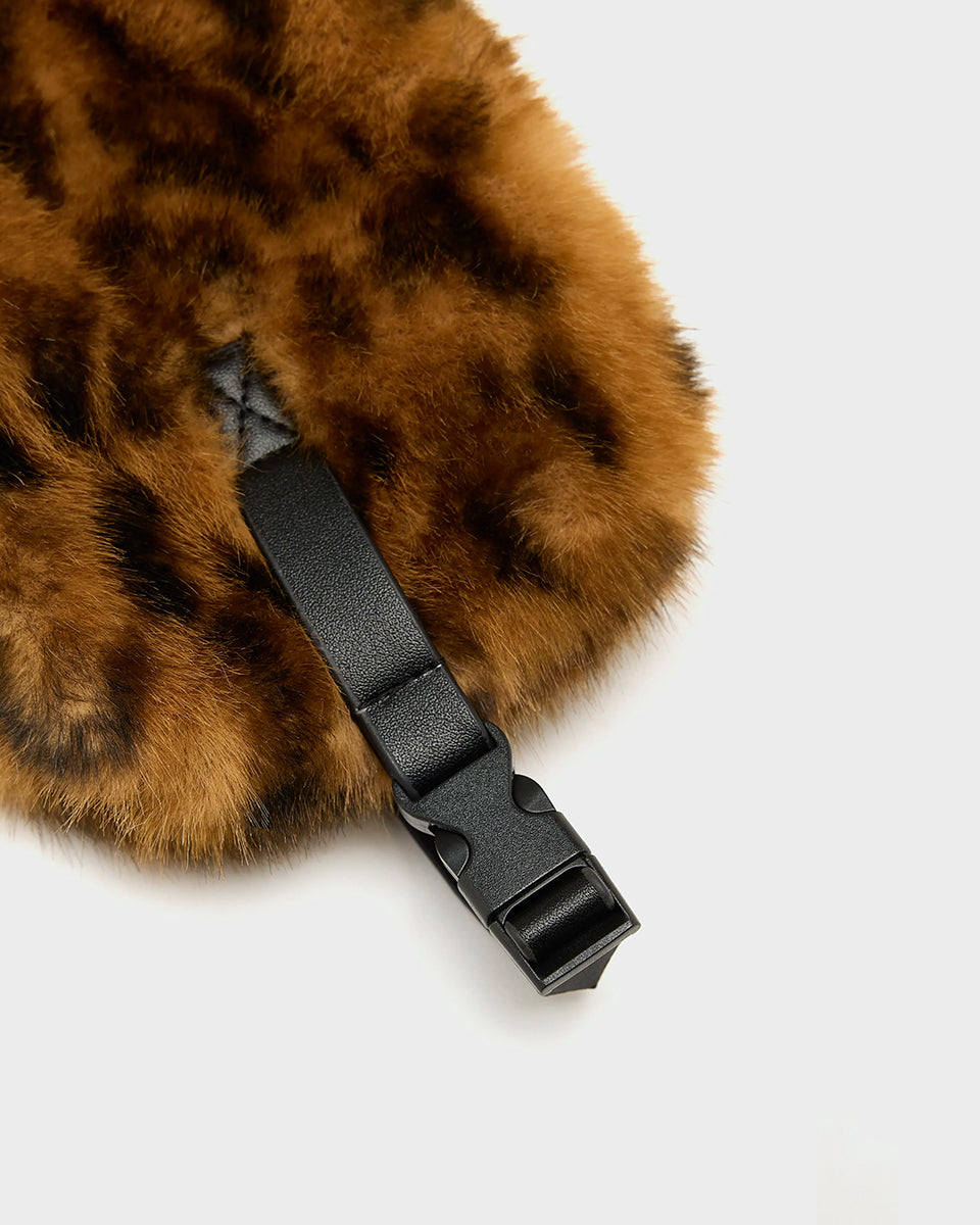 The Epka Bellerose earflap hat is made of soft, faux fur with a leopard print. It fastens at the neck with a leather strap.