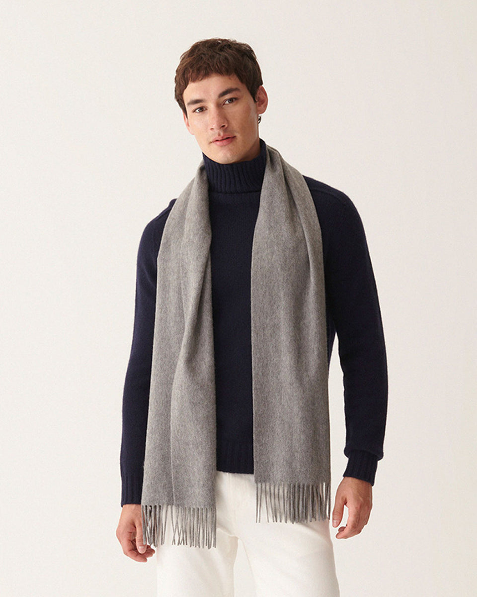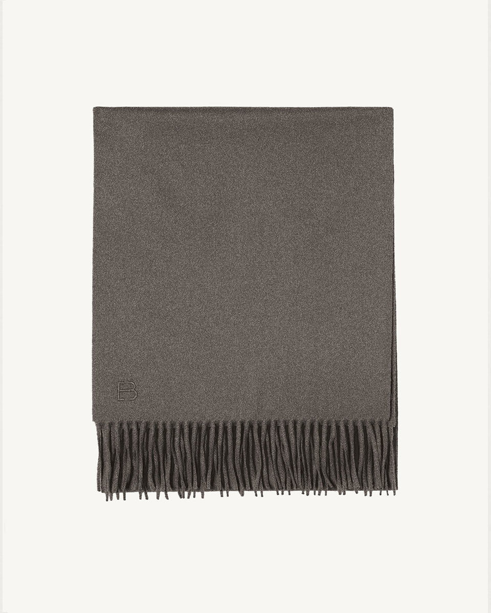 A classic A1B U ERIC BOMPARD Gris Meteori scarf in caramel with fringe detailing. The brand's logo is embroidered at the hem. Made of 100% cashmere.