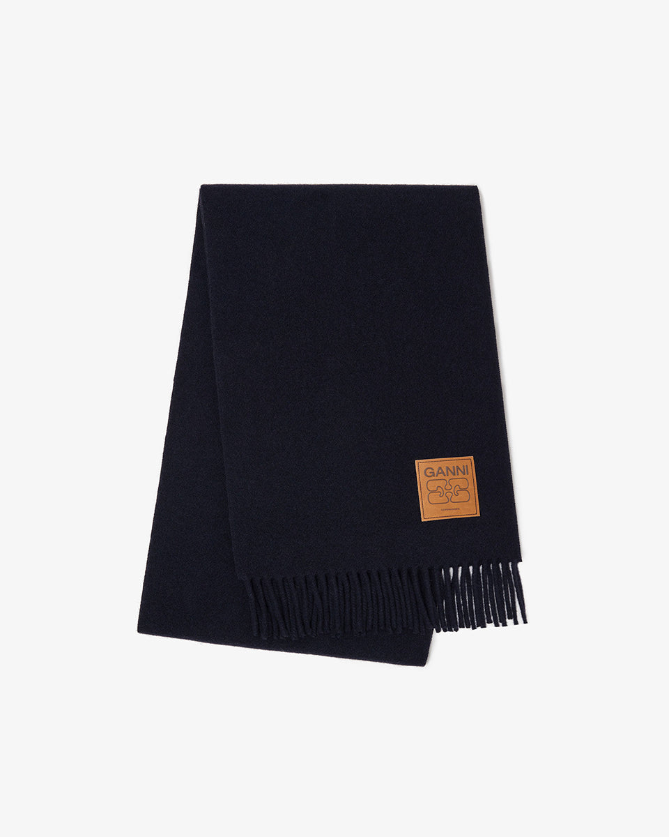 The 6931 Ganni Sky Captain is a warm, knitted scarf in navy blue with fringe at the hem and a brand logo patch. Made of wool.