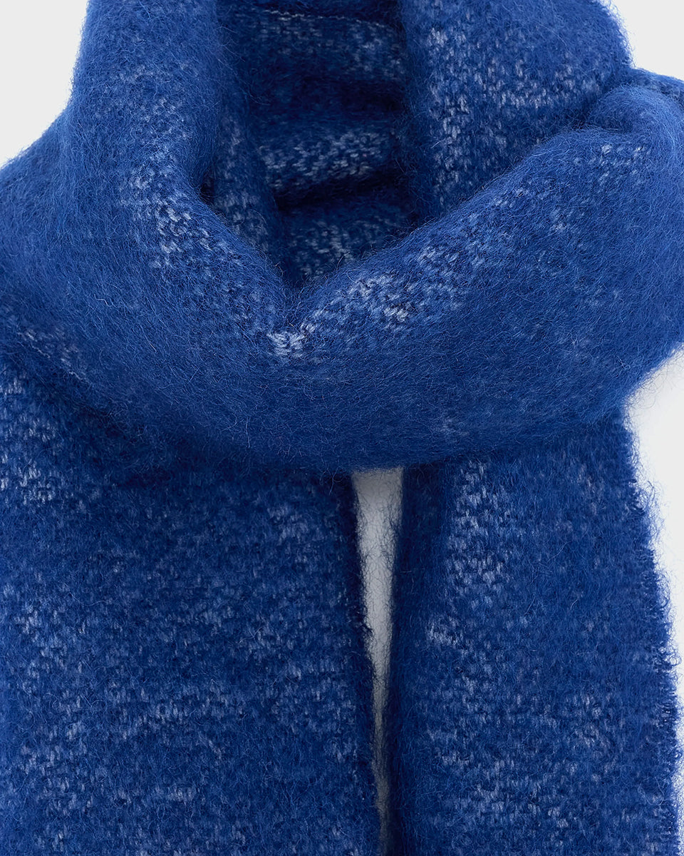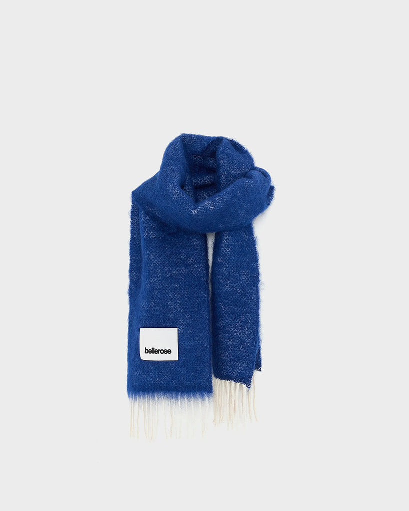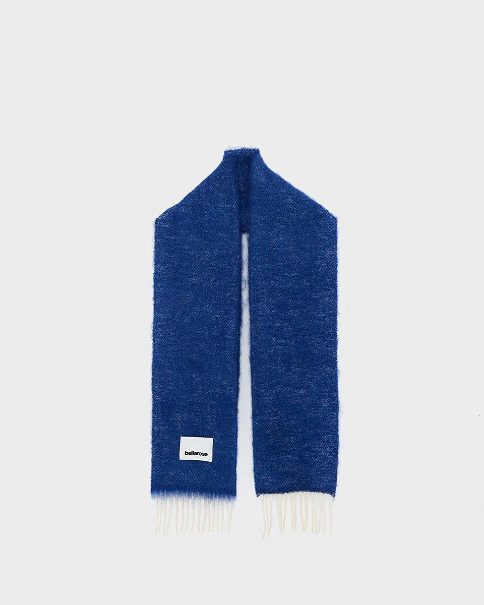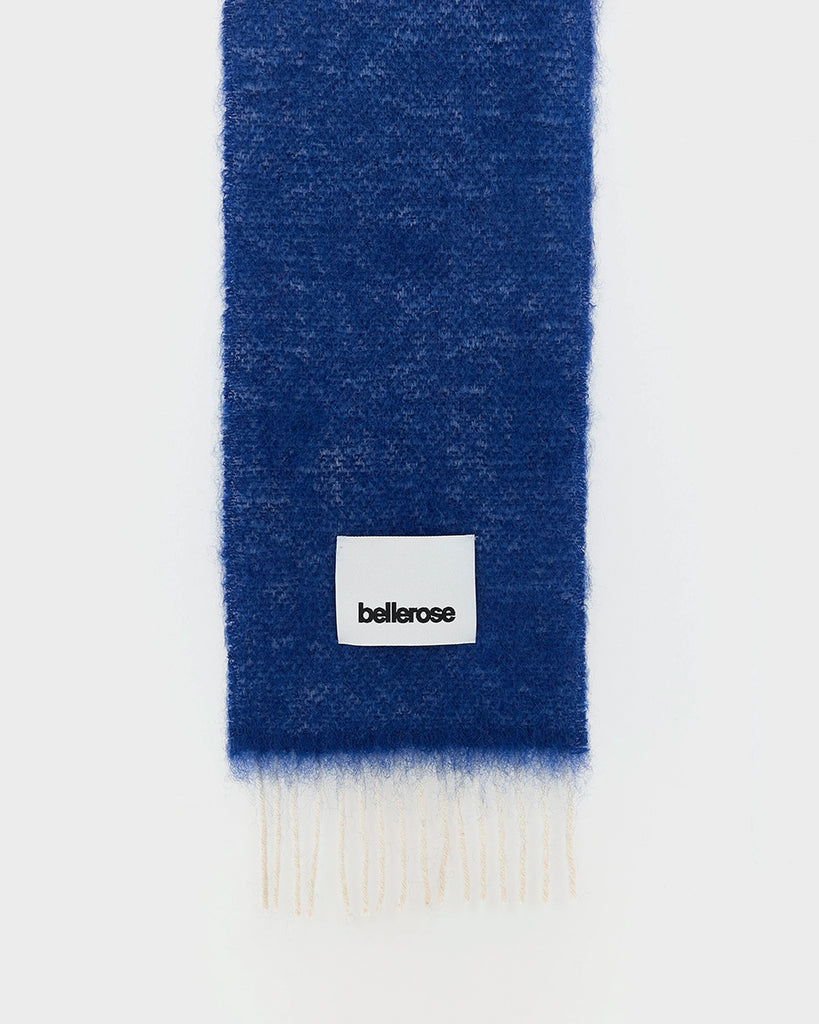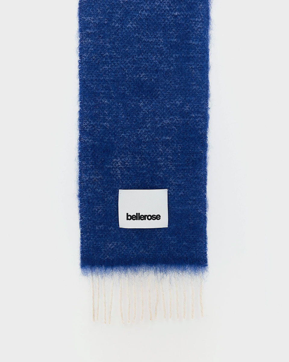Myllem Bellerose's warm, oversized navy scarf features contrasting fringe. It features a large brand logo patch. Crafted from a soft wool and mohair blend.