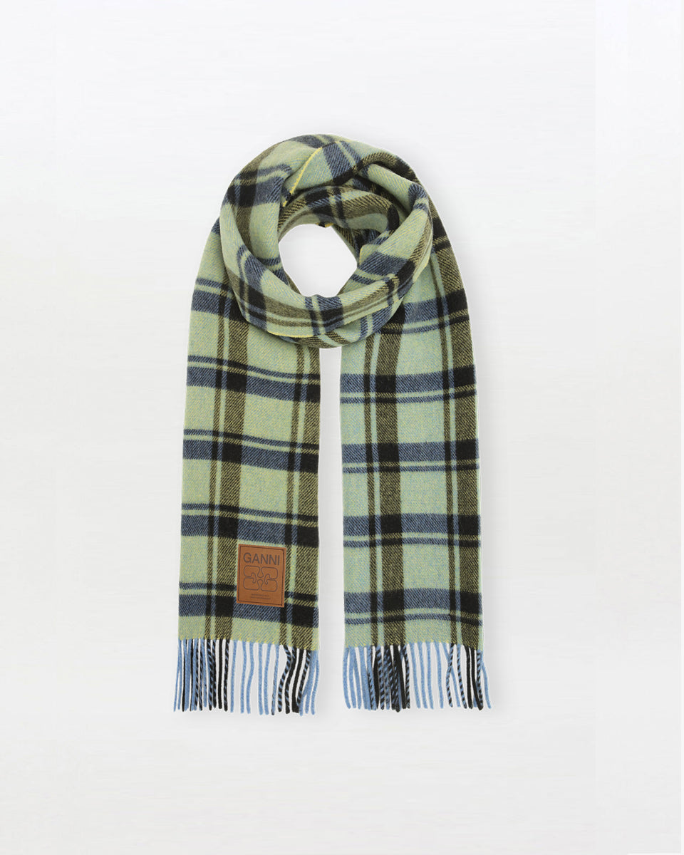 Obszerny, dwustronny, wełniany szalik 6935 GANNI Yellow Pear o szczotkowanym splocie, w kratę. Zakończony frędzlami. U dołu posiada naszywkę z logo marki. Wykonany w całości z wełny.