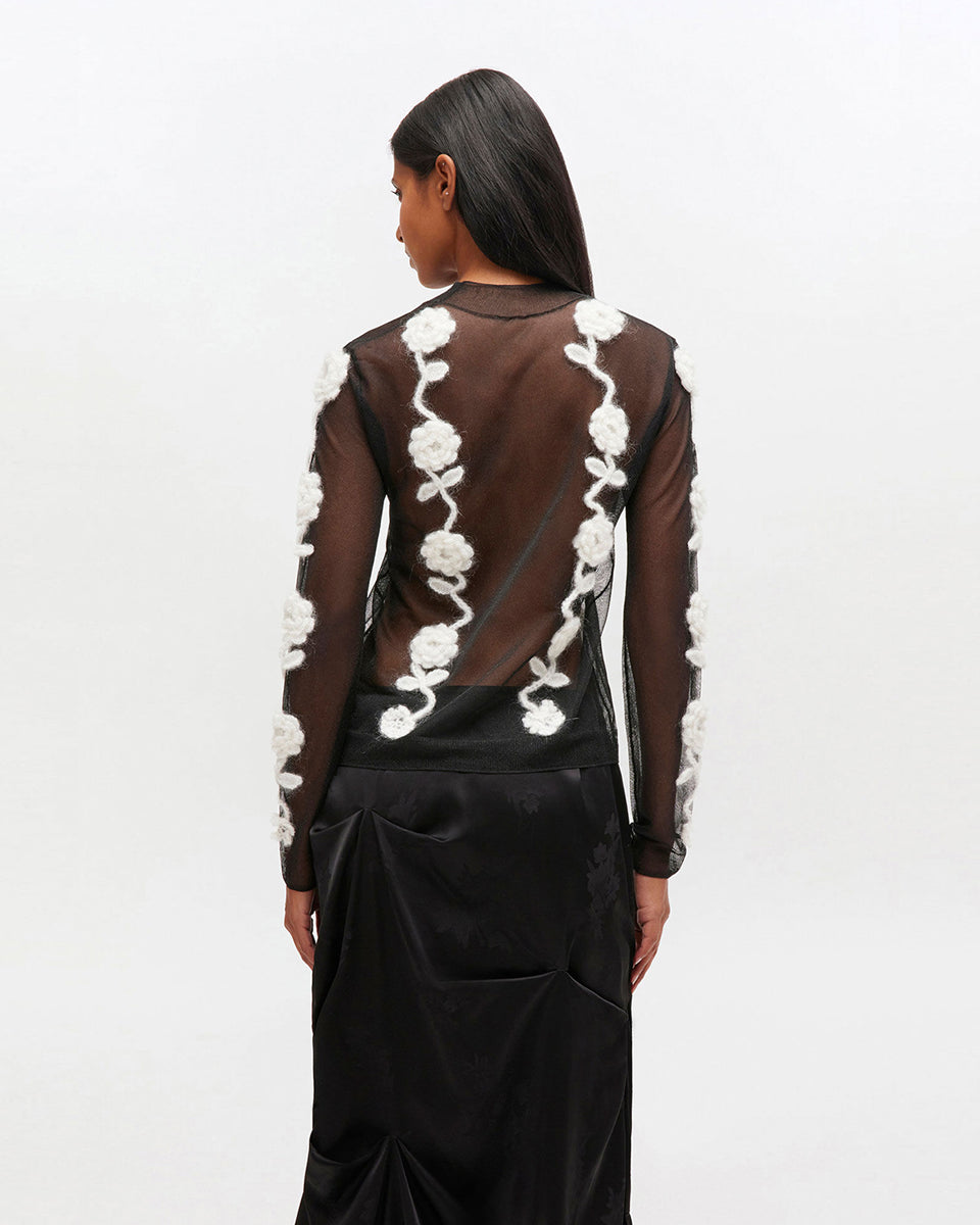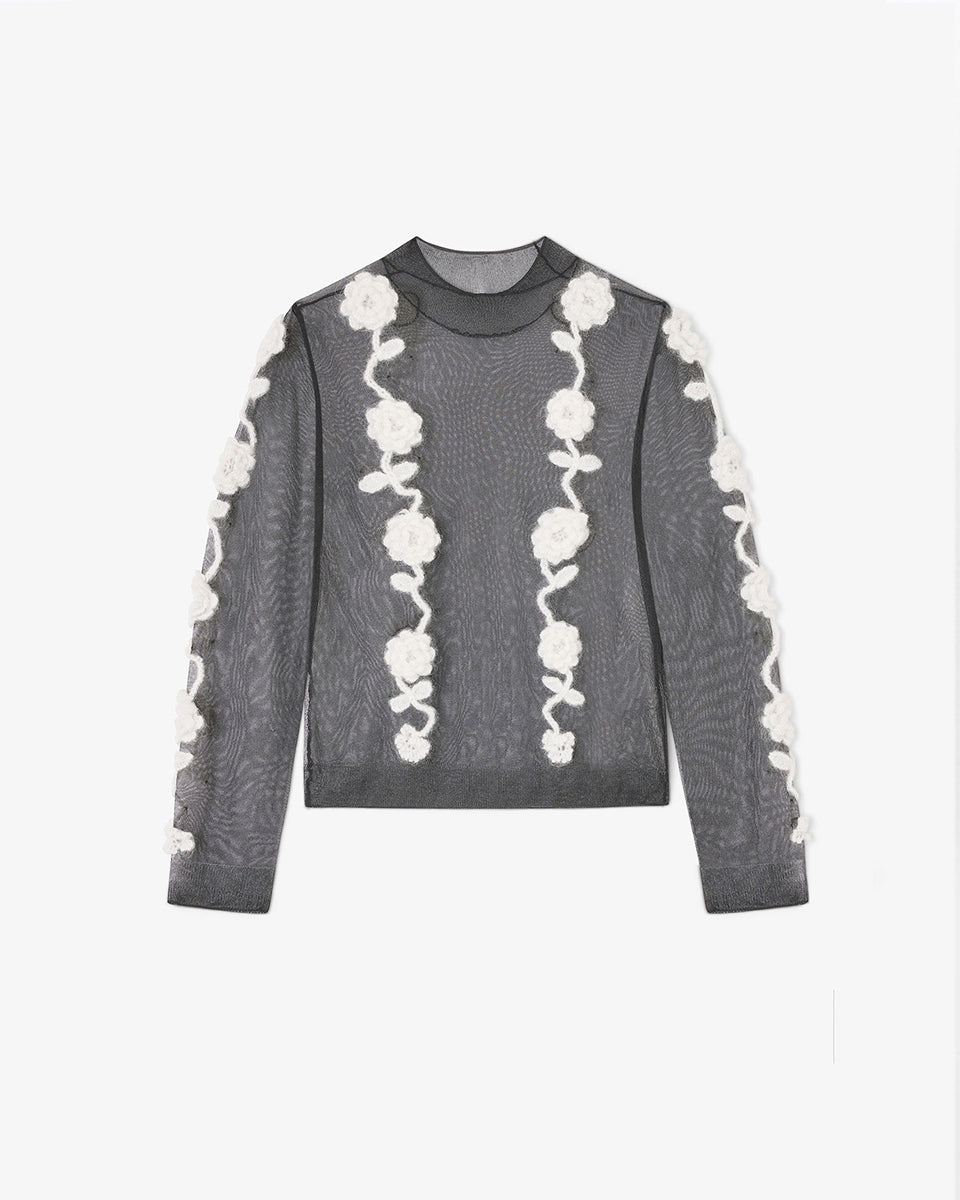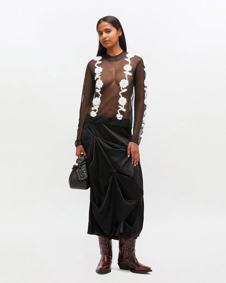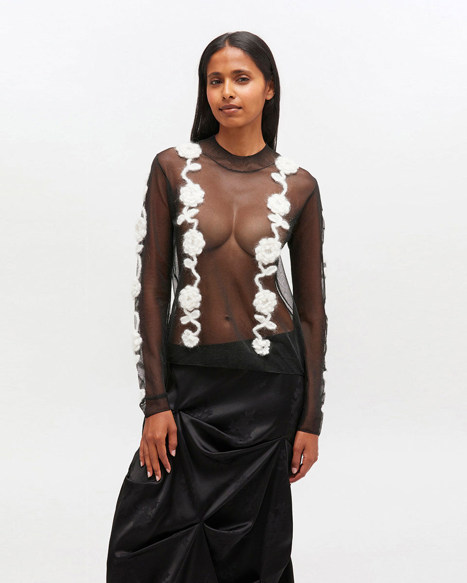 The 2649 Ganni Black sheer top features long sleeves and a high, rounded collar. It features crocheted floral embellishments. Perfect for pairing with a long skirt for elegant occasions.