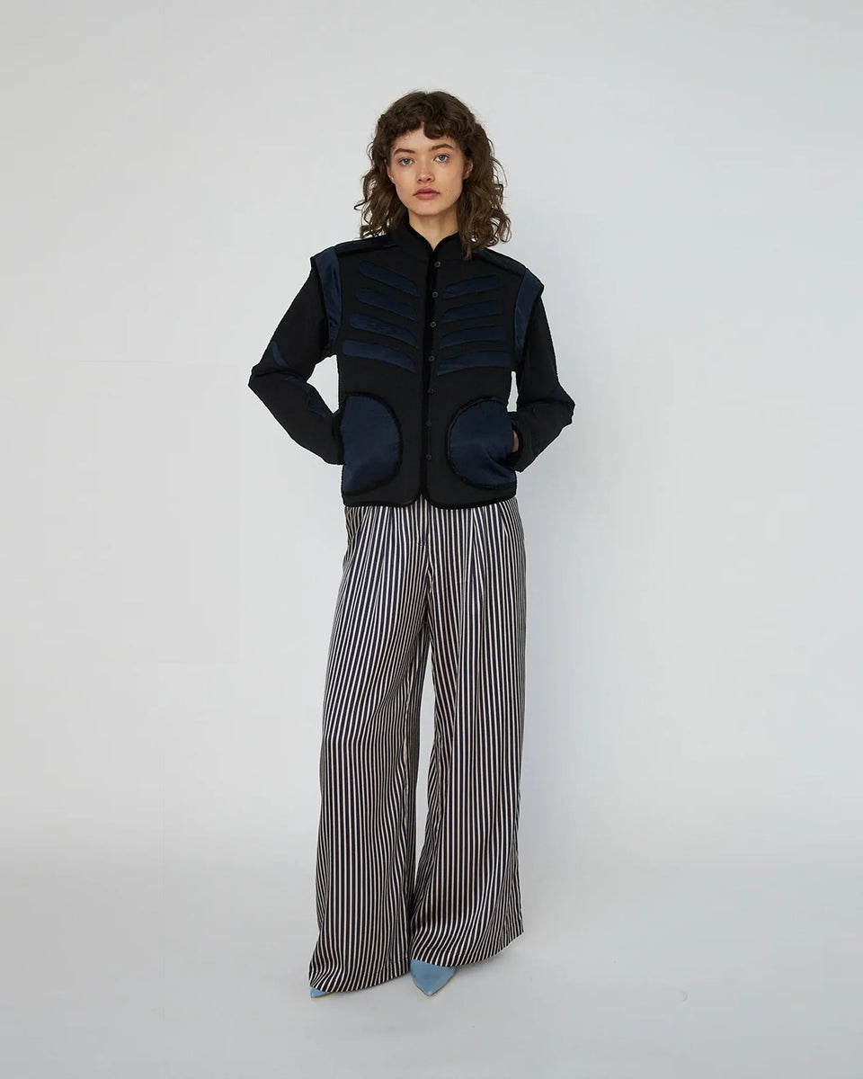This short, black and navy Moon&Star Embroidered jacket by STELLA NOVA features a geometric cut, a high stand-up collar, and a button-front closure. It features contrasting inserts on the chest, shoulders, and large, semi-circular pockets. The back features star and moon embroidery. The silhouette is simple, yet the structure and detailing create a very architectural and fashionable look. Crafted from organic cotton.