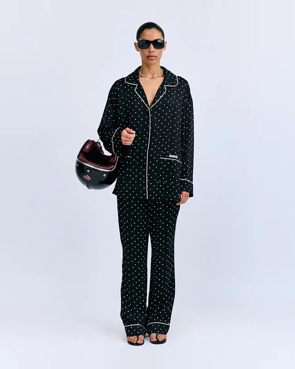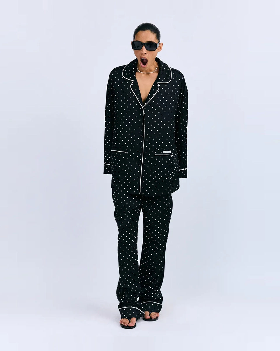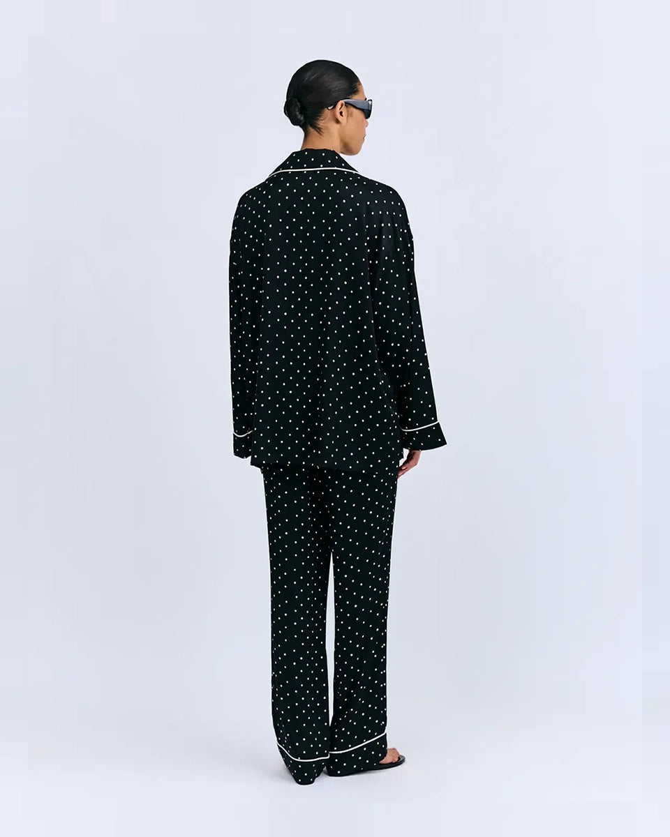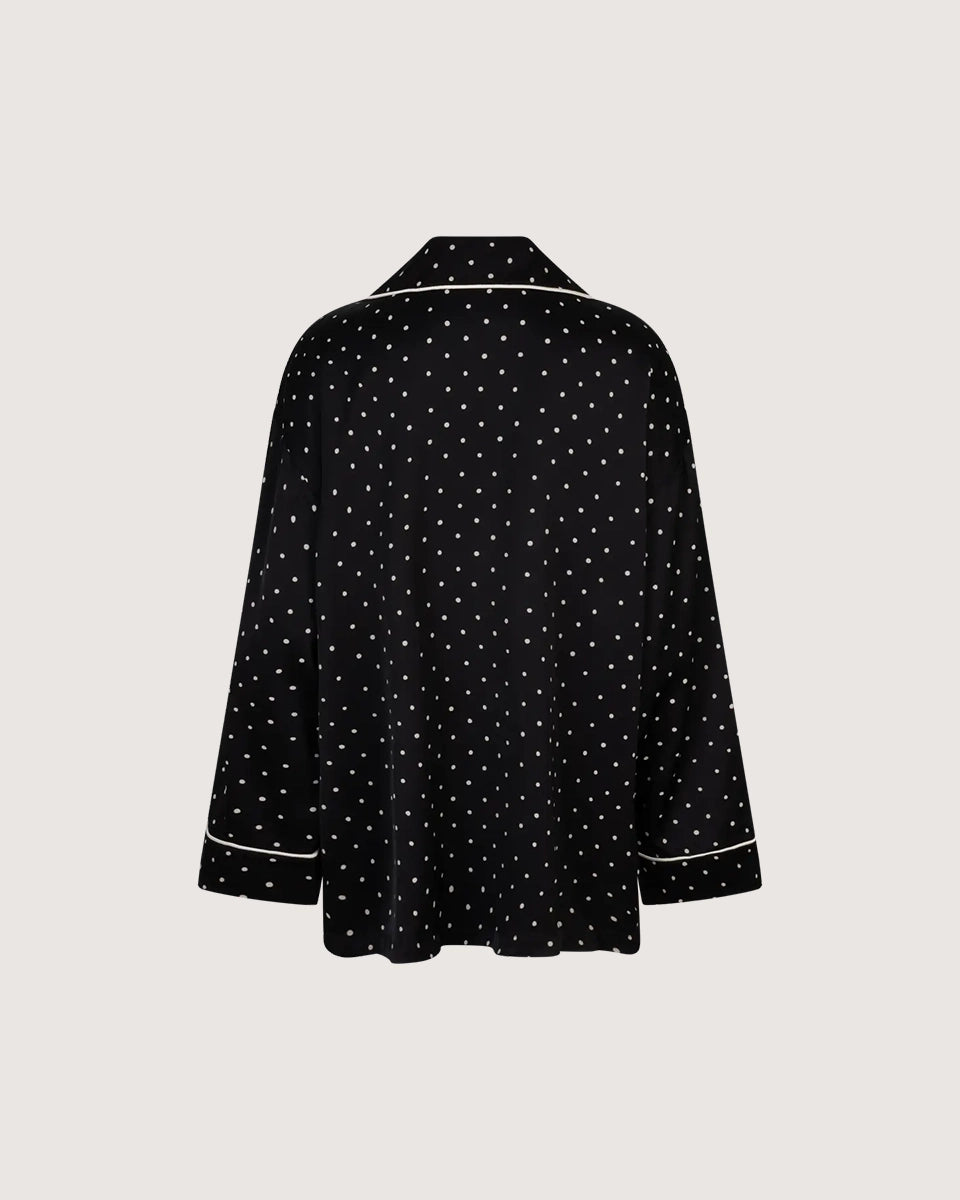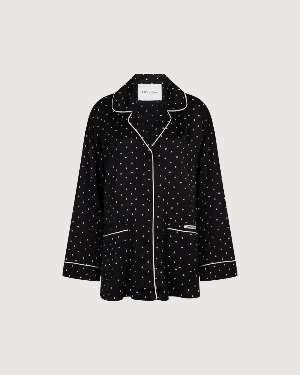 This oversized Cedric Love Stories pajama shirt is made of flowing satin fabric with a polka dot print. It features a V-neck, a collar, and wide, long sleeves. It fastens with buttons and is trimmed with thin white piping. The shirt has two front pockets. A small brand logo patch is located on the right pocket.