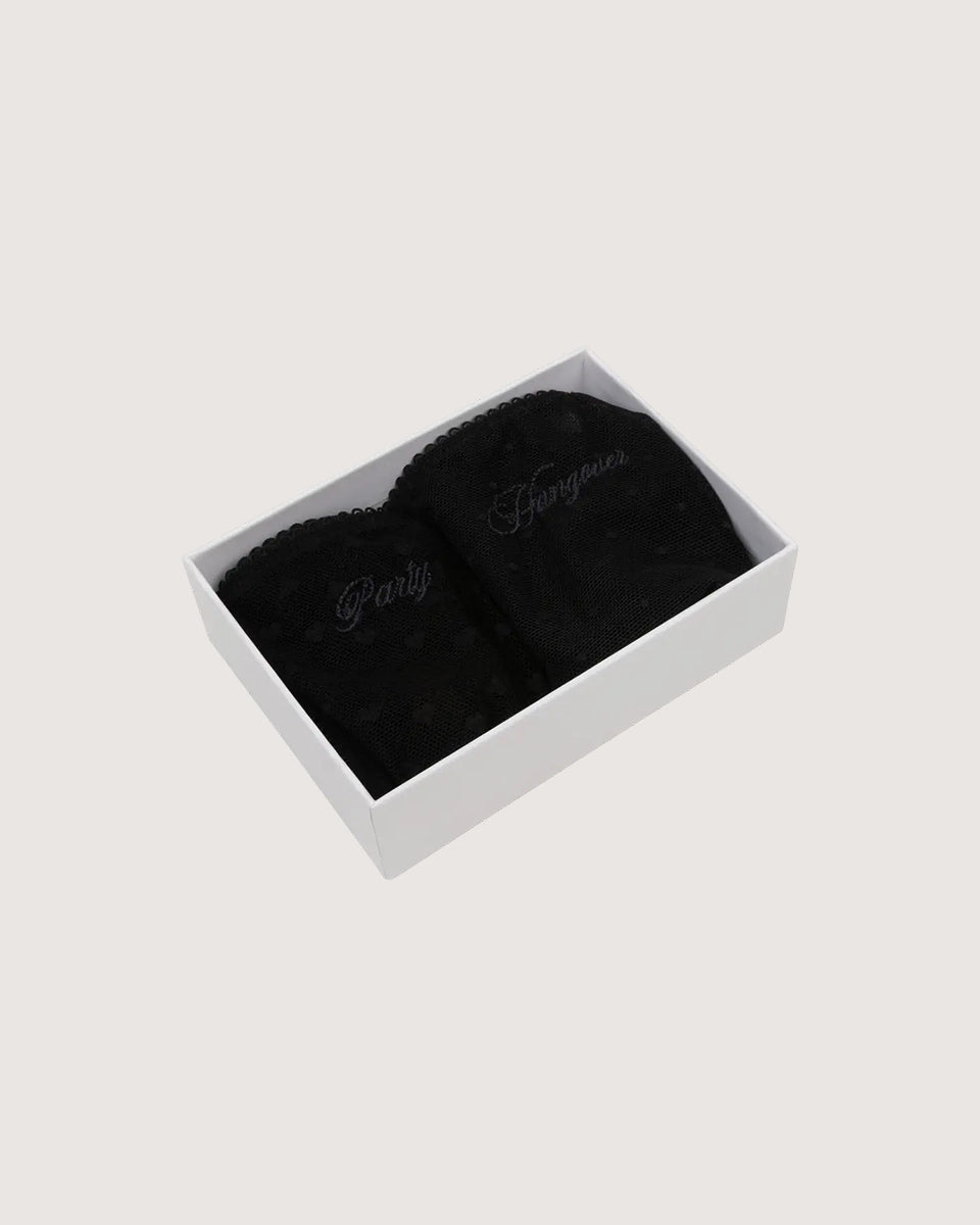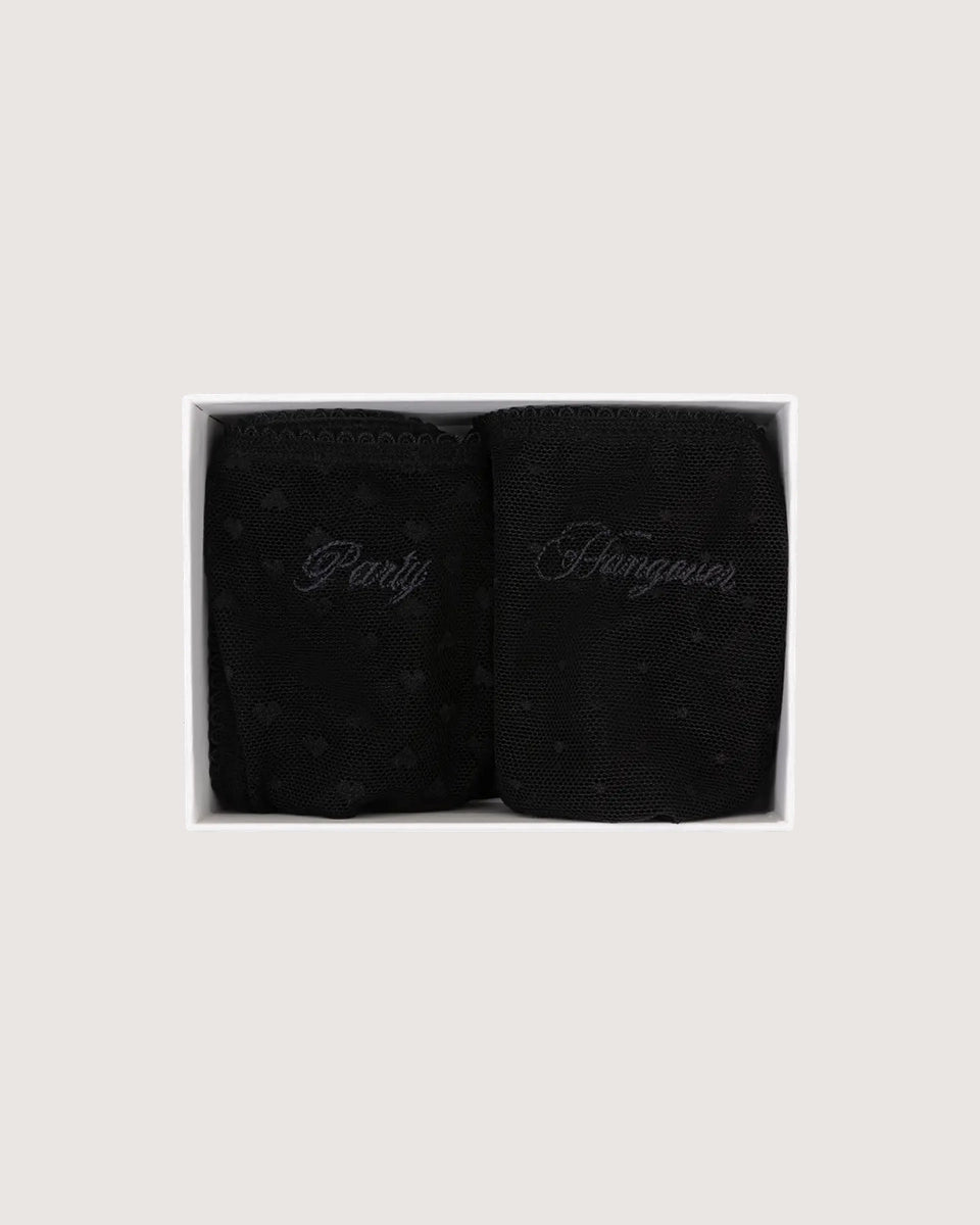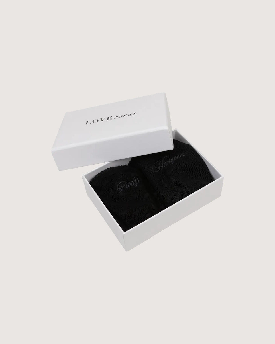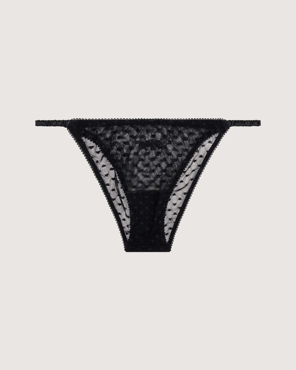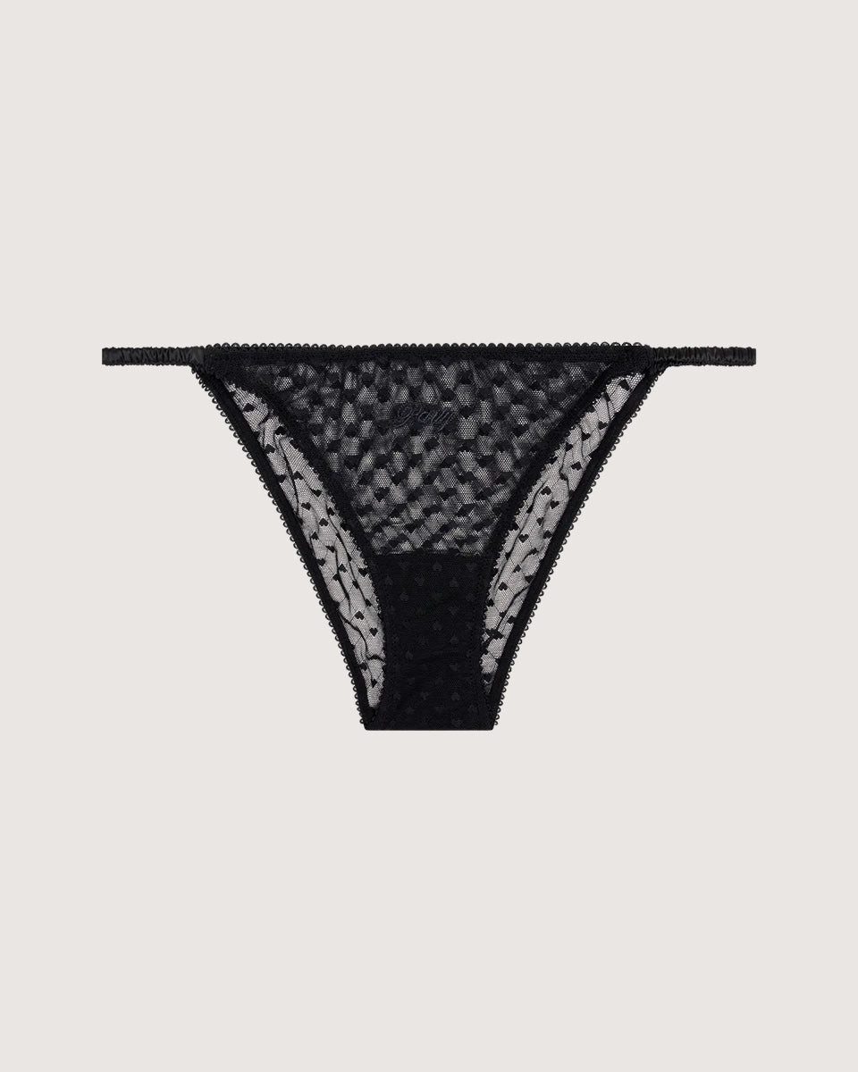 A set of black, lace, low-rise briefs with a thin elastic band, Clio Love Stories. They feature embroidered slogans on the front. Briefs are lined with cotton and come packaged in a gift box.