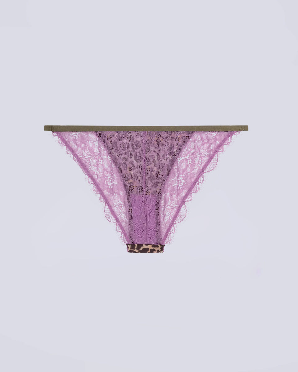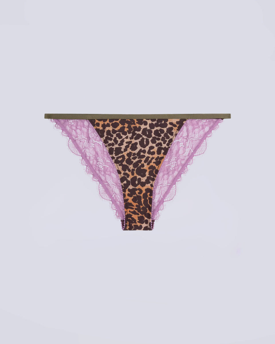 Low-rise panties in a Wild Rose Love Stories leopard print. The back is crafted from delicate purple lace with a floral pattern. The panties are lined with cotton.
