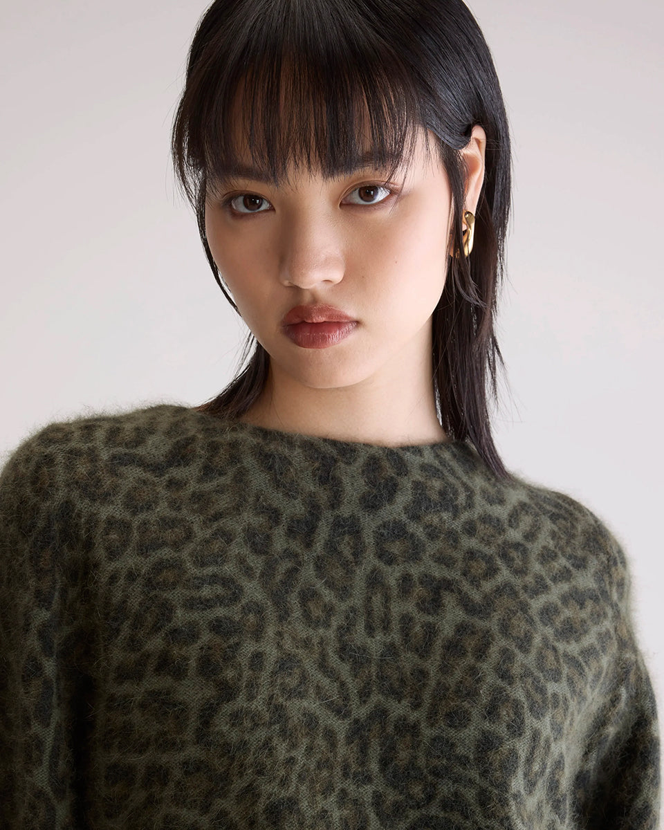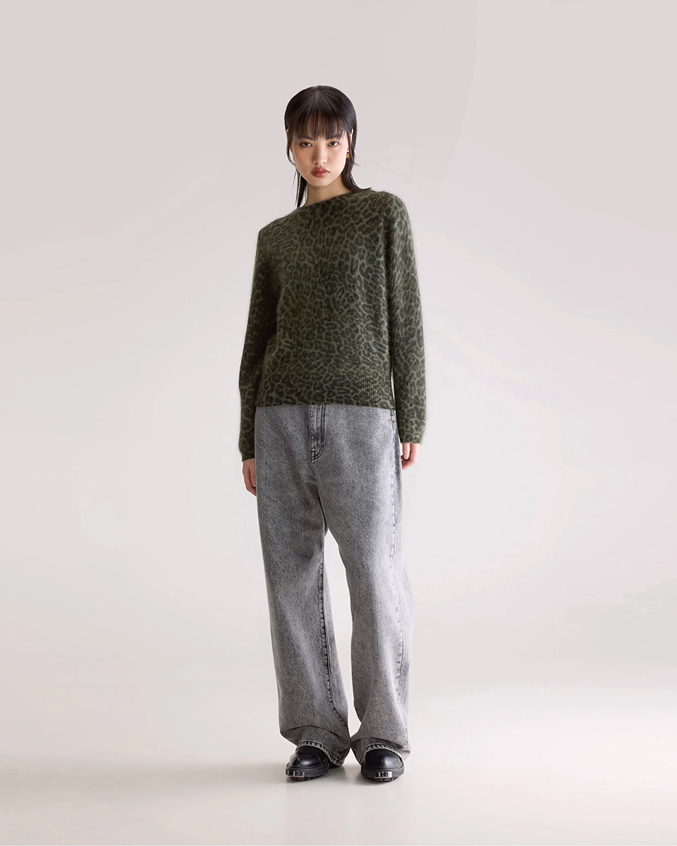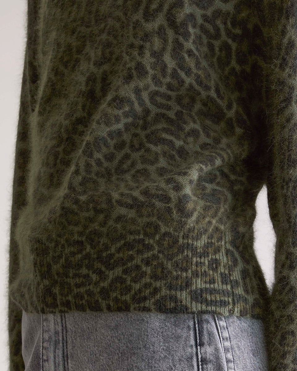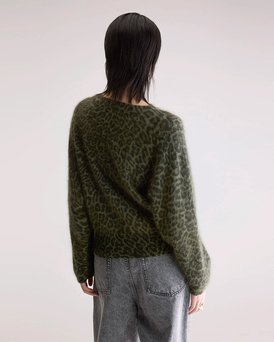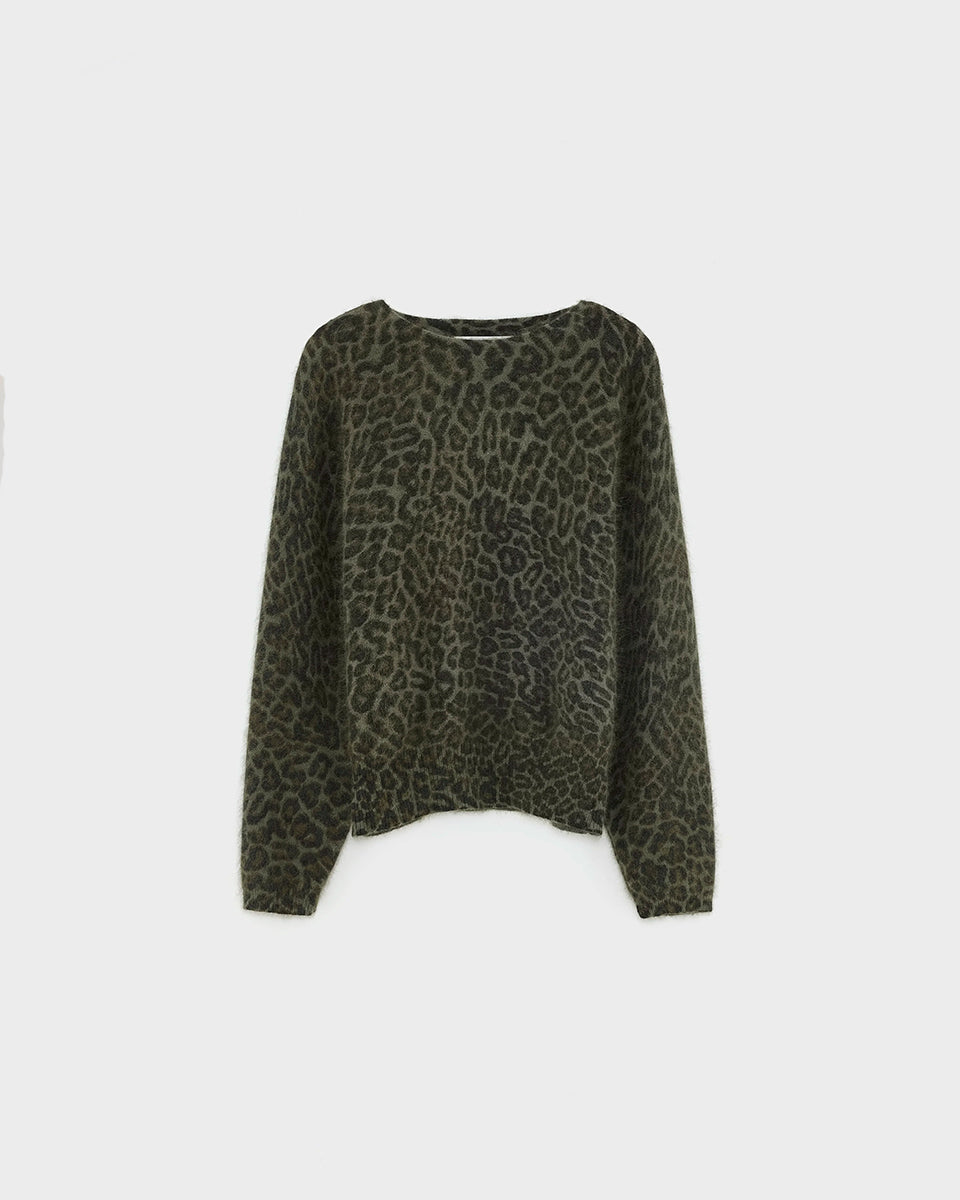 The Dioal Bellerose sweater features a loose, fluffy boat neckline and a leopard print. It features a straight cut and ribbed cuffs. It's made of warm angora-rich knit fabric.