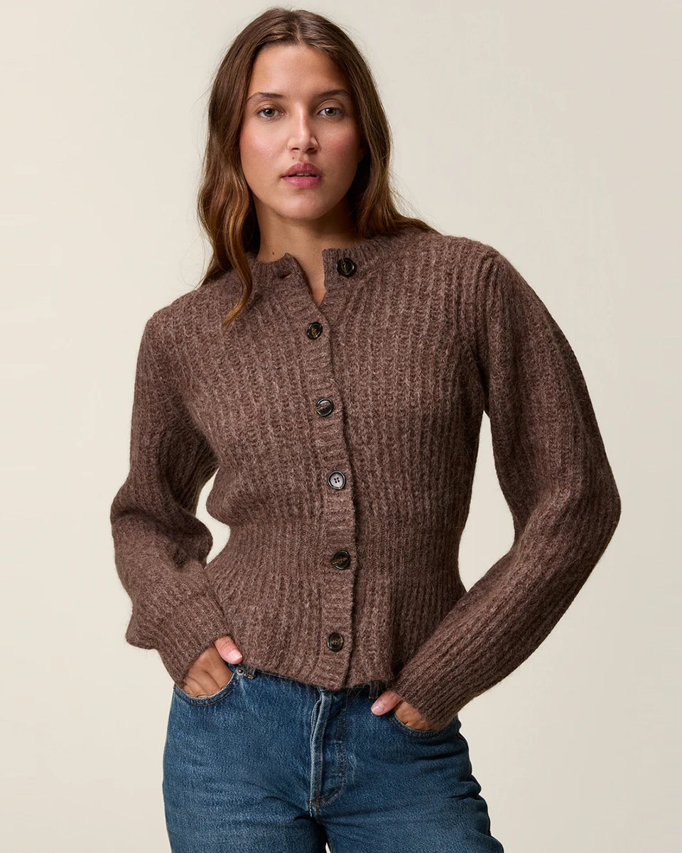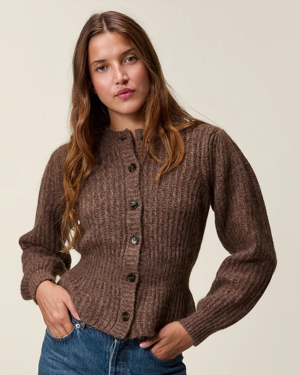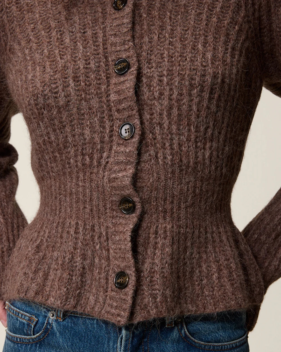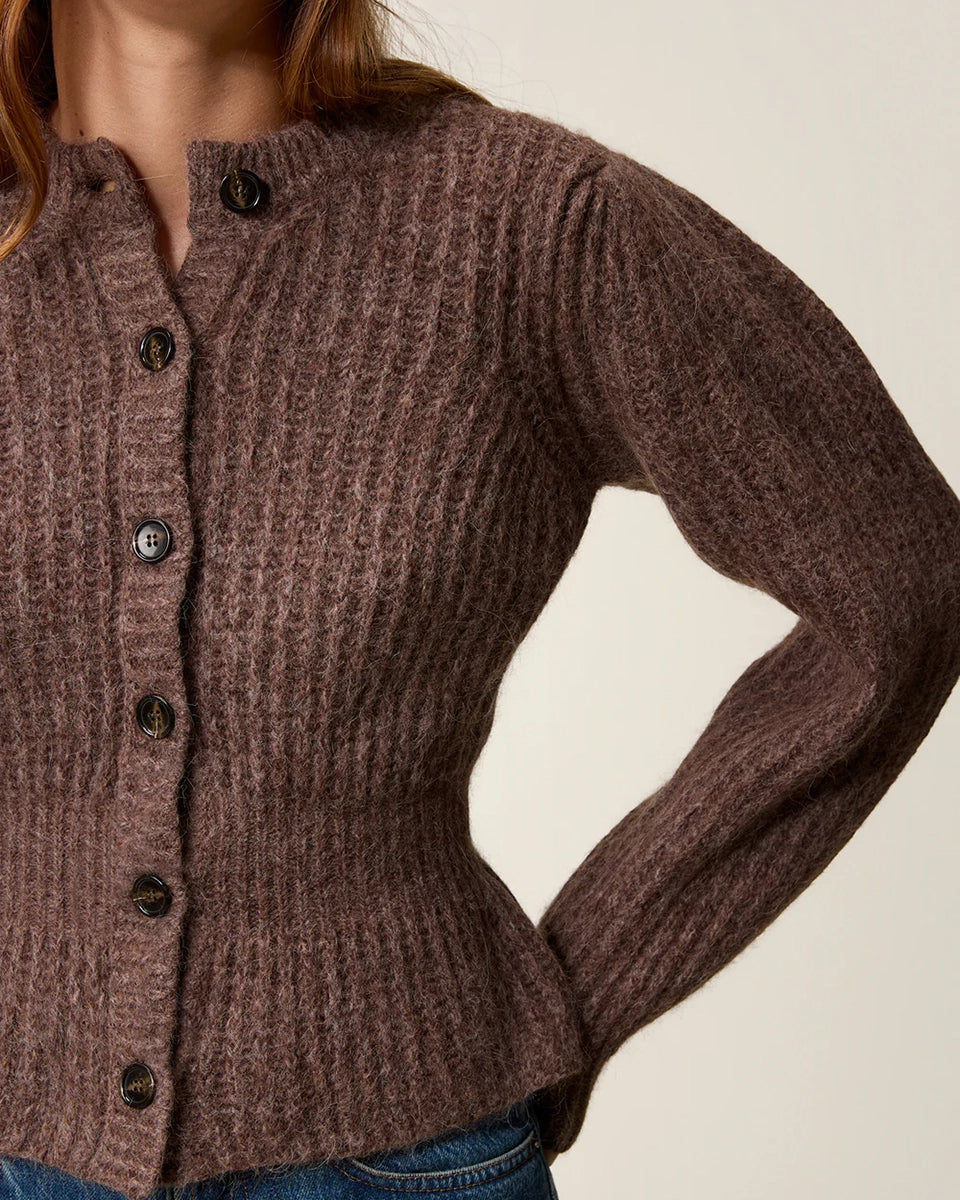 This warm, brown Lisia Rouje cardigan features a round neckline and loose, long sleeves. It's tapered and fitted at the waist. It fastens with buttons. Crafted from a thick, ribbed wool and cashmere blend, it's perfect with slim-fit jeans.