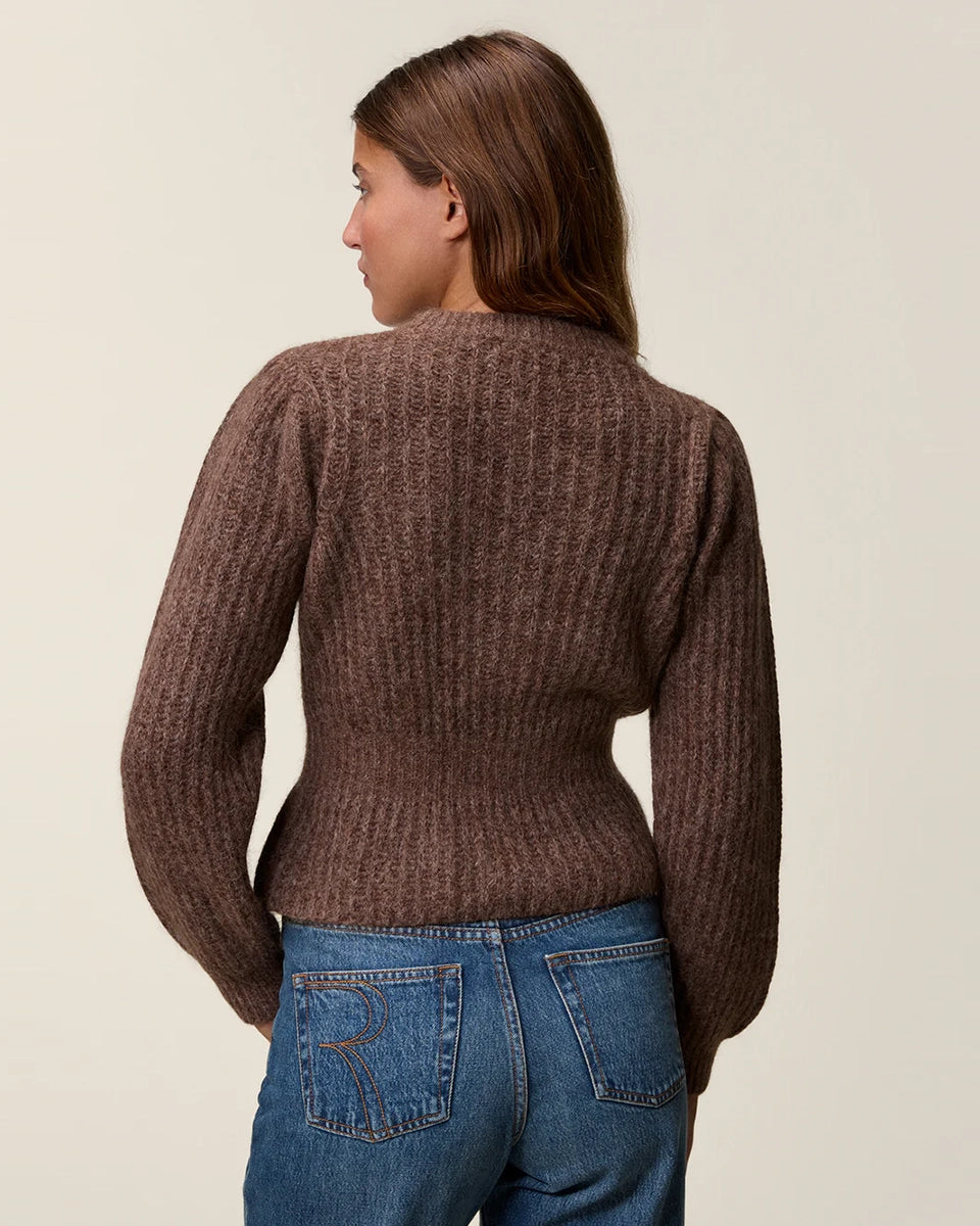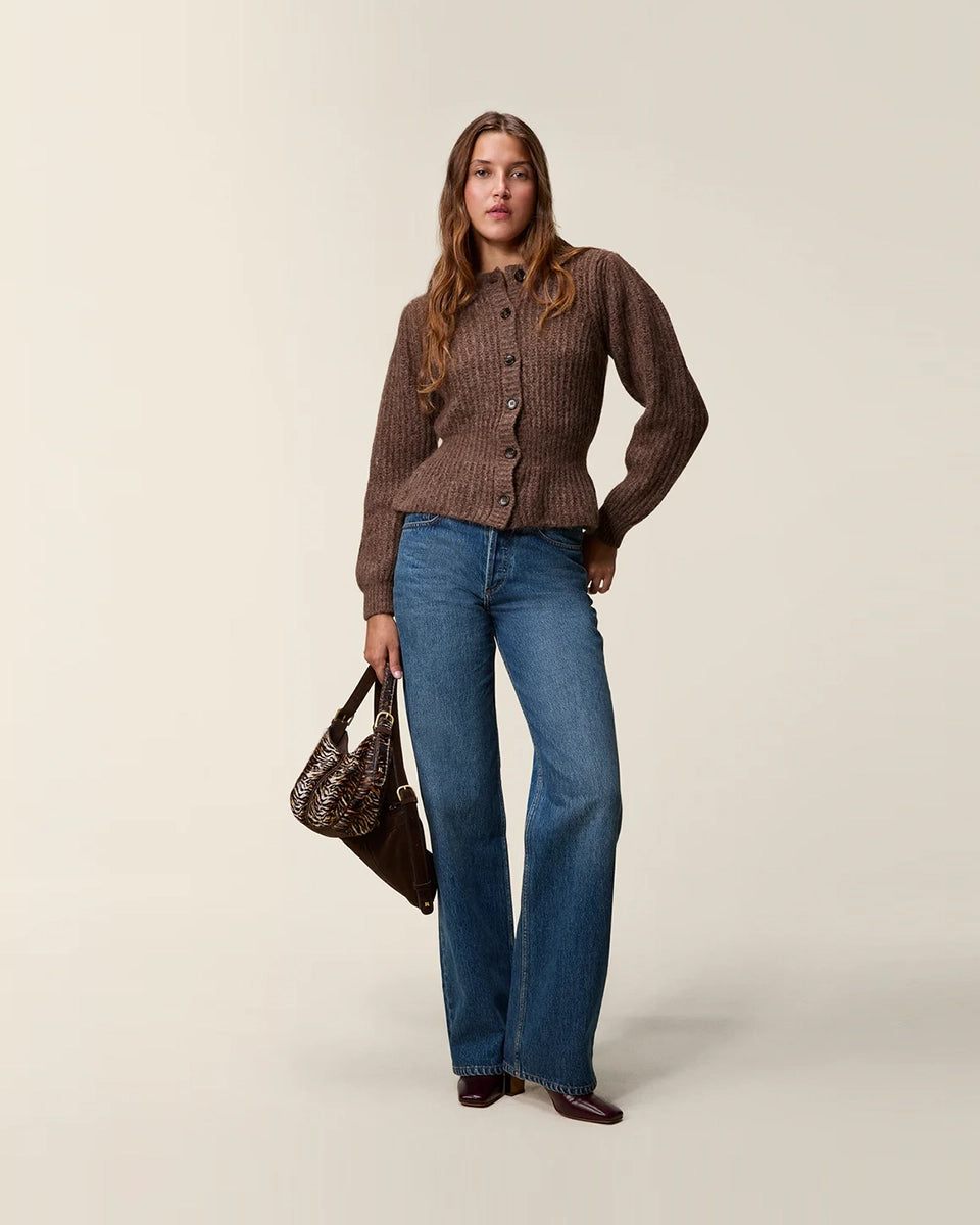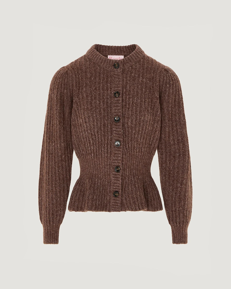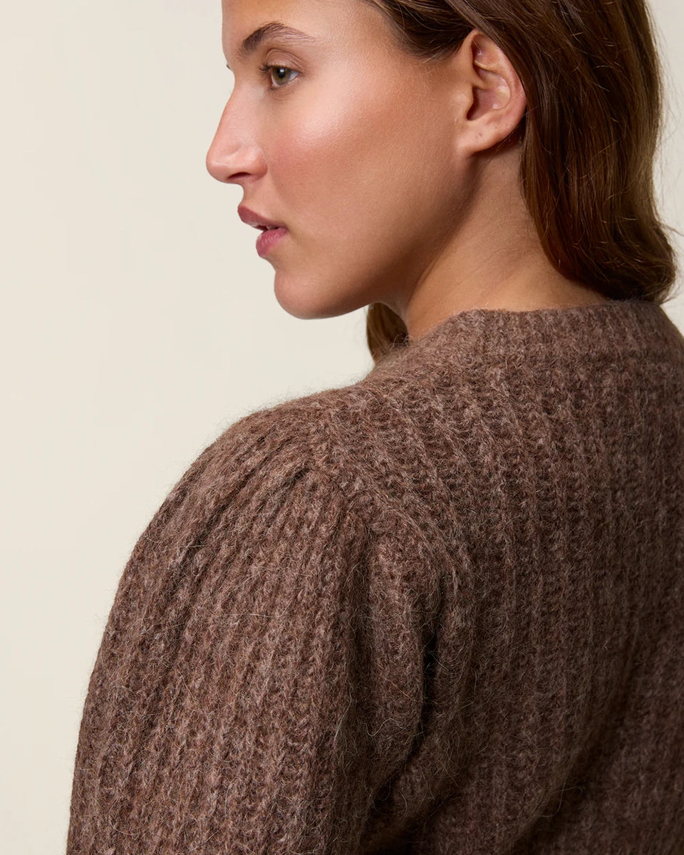This warm, brown Lisia Rouje cardigan features a round neckline and loose, long sleeves. It's tapered and fitted at the waist. It fastens with buttons. Crafted from a thick, ribbed wool and cashmere blend, it's perfect with slim-fit jeans.