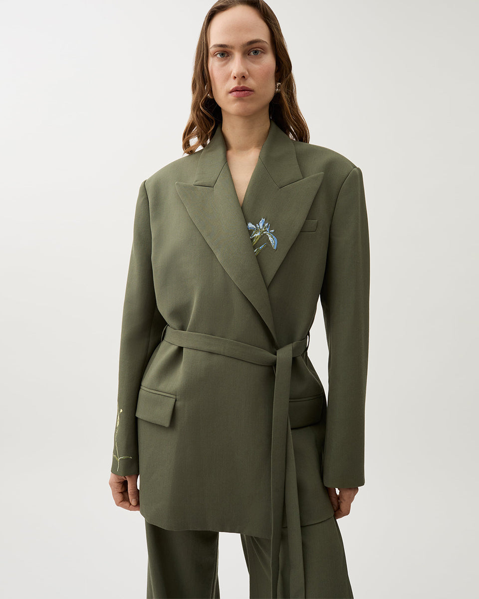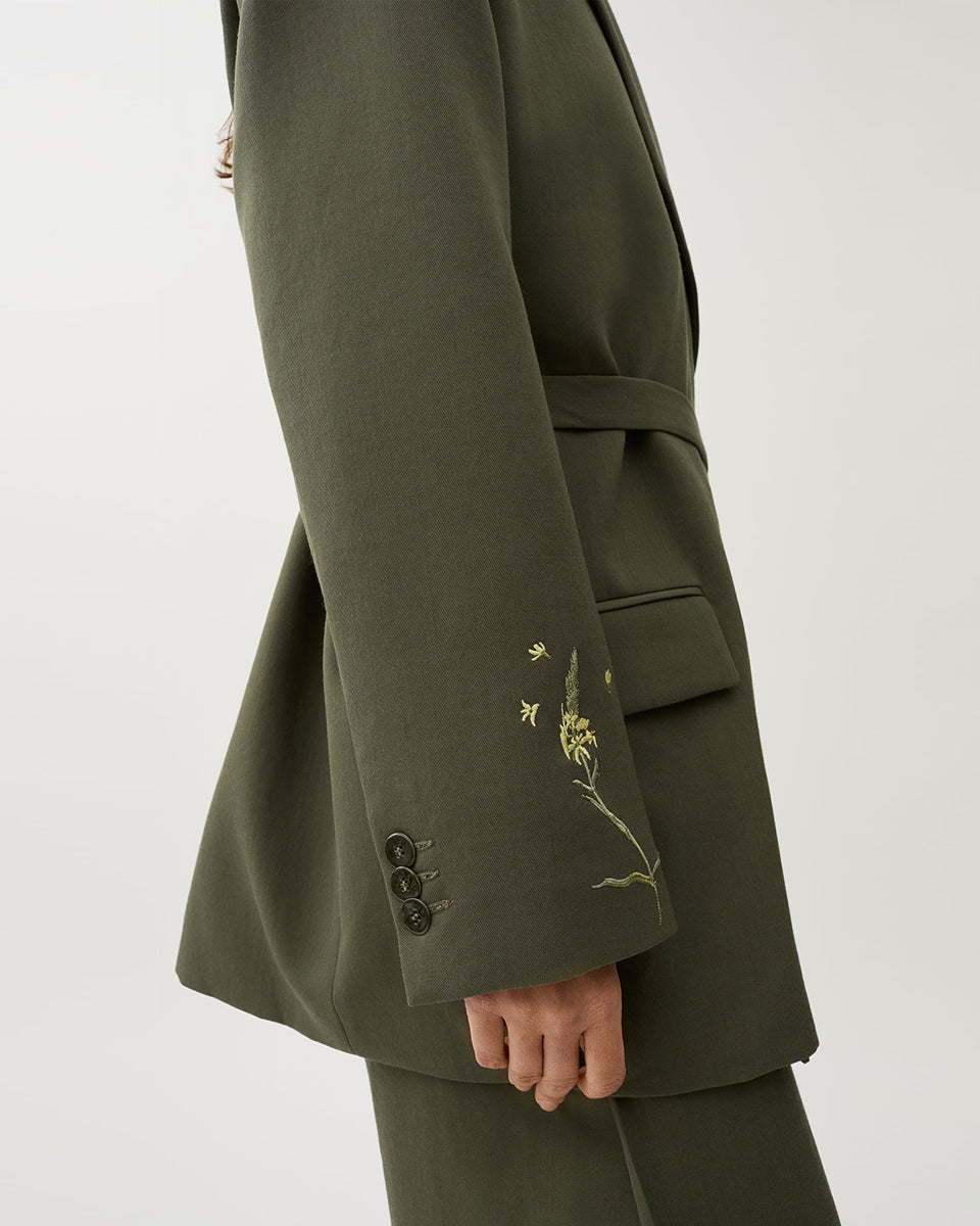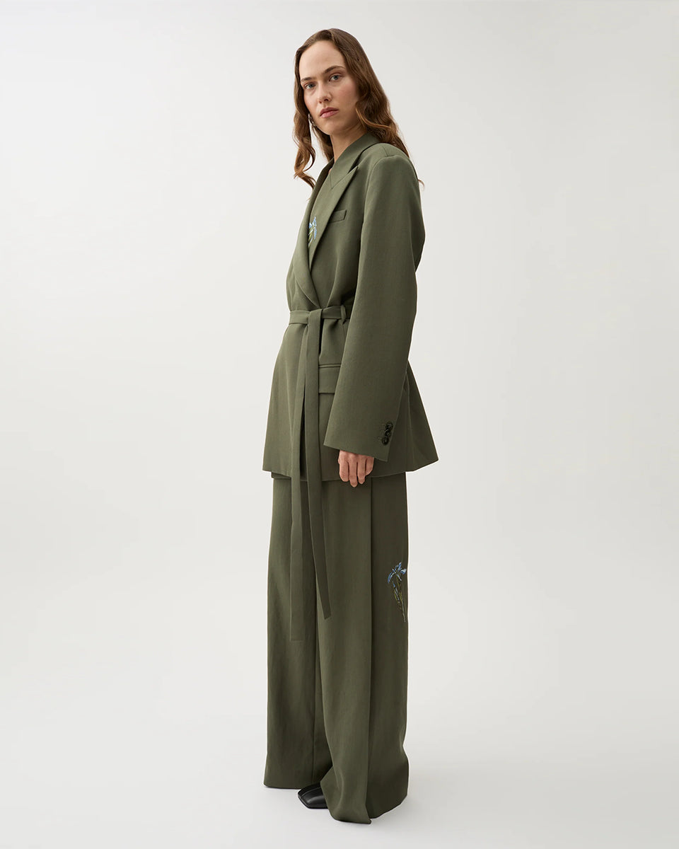 The oversized Stand Dark Moss blazer in olive green has a distinctive, modern cut with embroidered floral details. It features wide, suit-style lapels and a belted waist for a feminine touch. It features an asymmetric closure, with no visible buttons at the front, and classic flap pockets. Pair with Nora Dark Moss trousers or your favorite jeans.