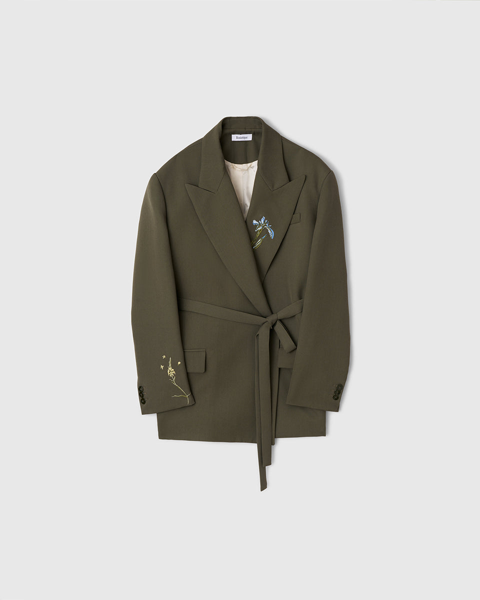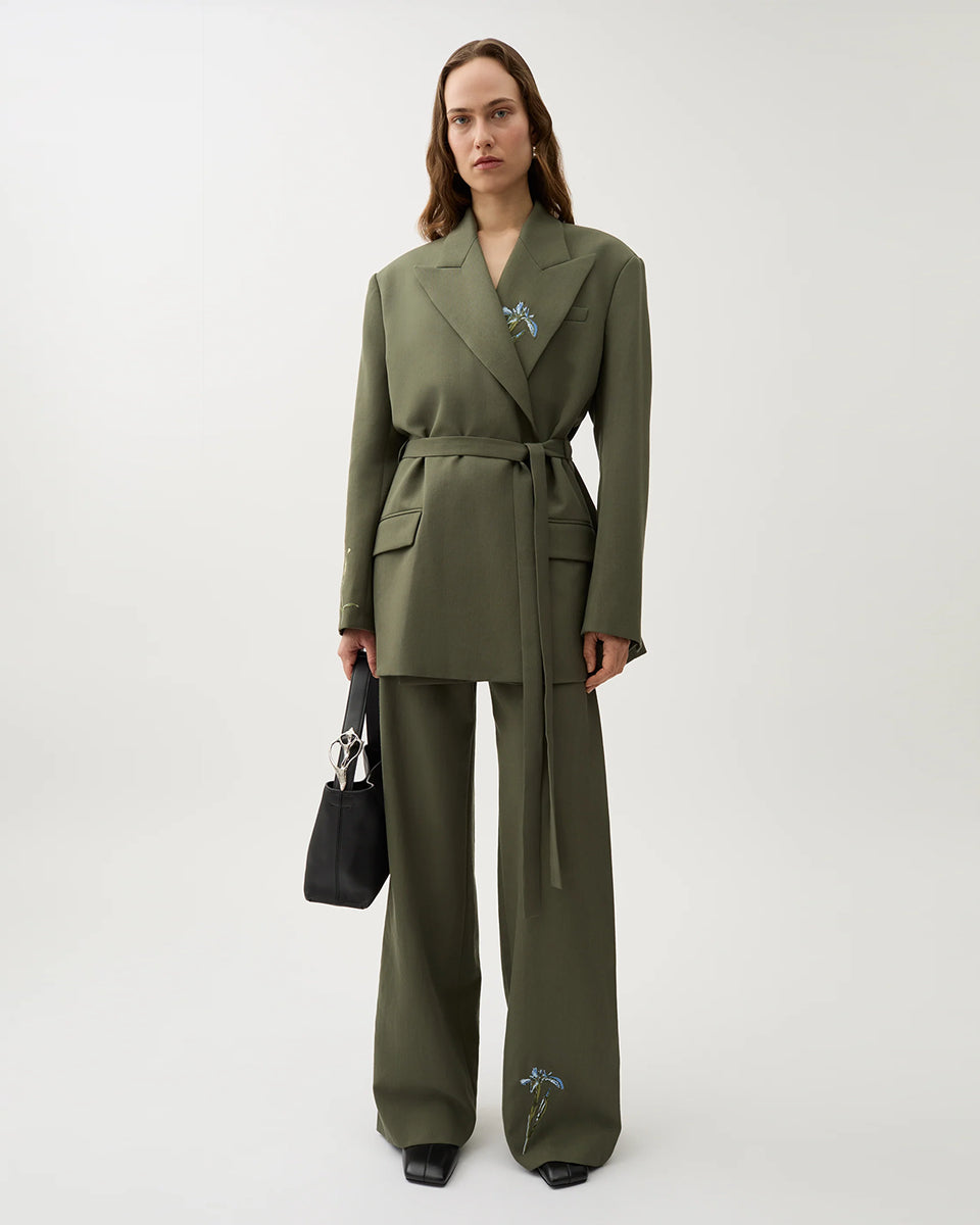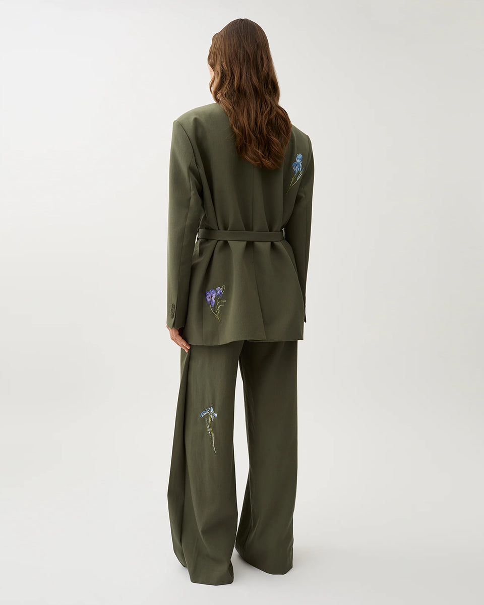 The oversized Stand Dark Moss blazer in olive green has a distinctive, modern cut with embroidered floral details. It features wide, suit-style lapels and a belted waist for a feminine touch. It features an asymmetric closure, with no visible buttons at the front, and classic flap pockets. Pair with Nora Dark Moss trousers or your favorite jeans.