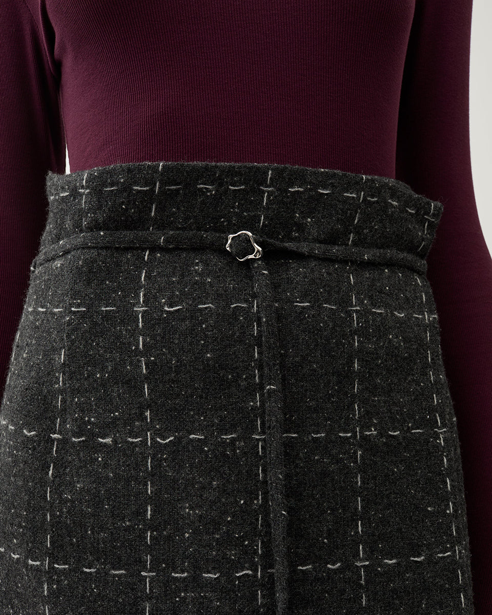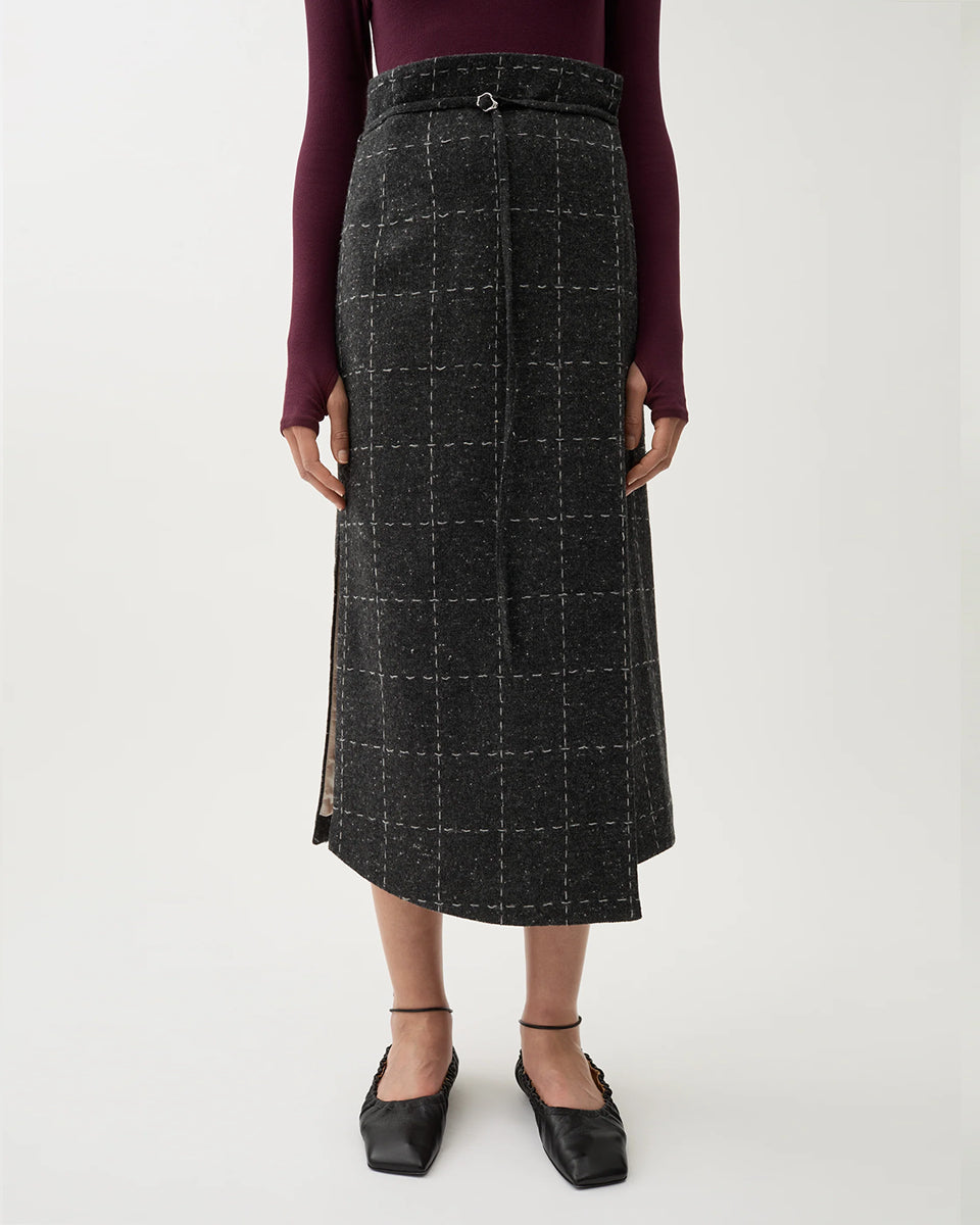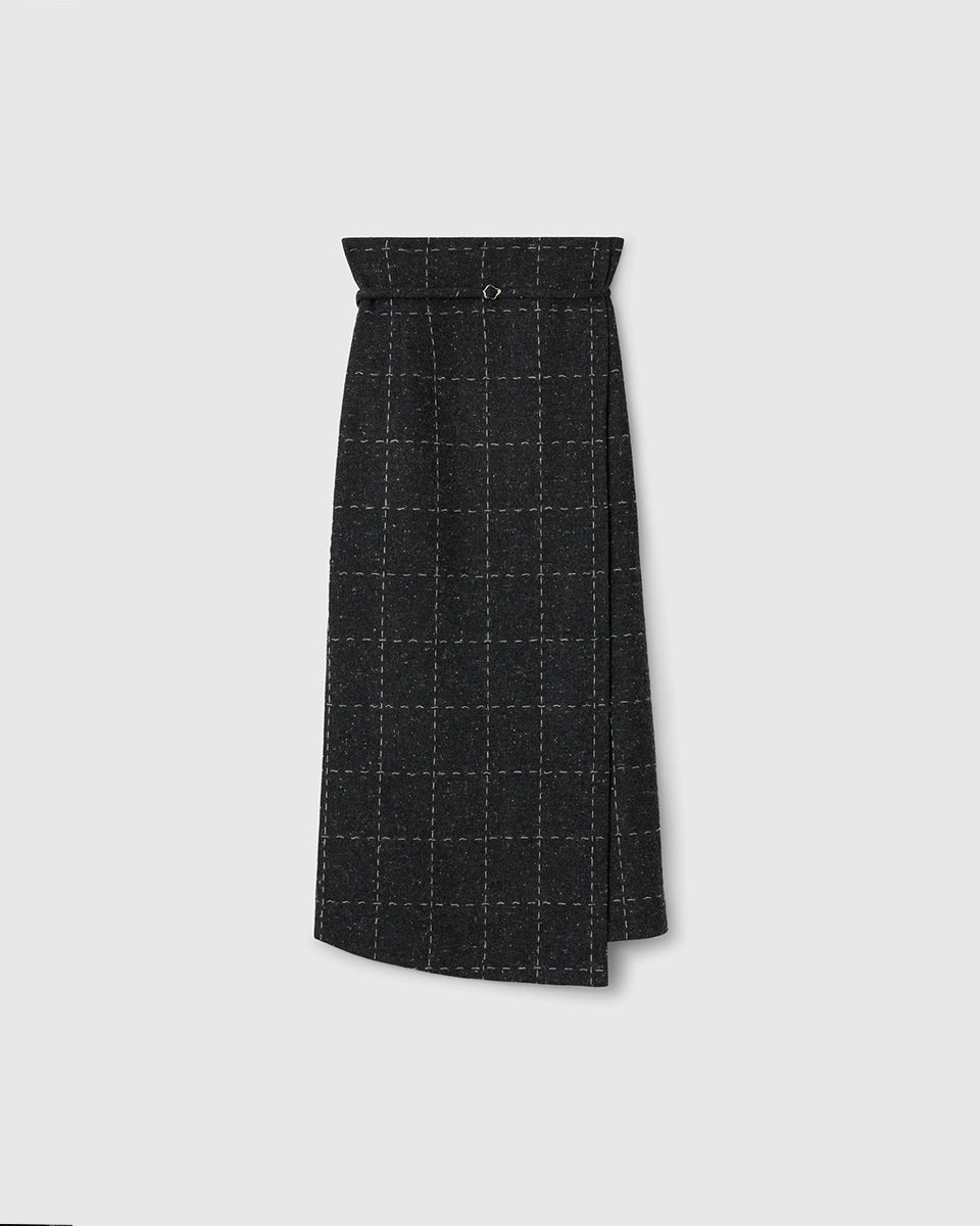 The Blanket Grey Melange midi skirt in a gray check pattern features a high waist and a paperbag-style waistband, adorned with a drawstring and a small buckle. It features side slits. Crafted from a wool blend, it pairs perfectly with flowing blouses and the Zola Check blazer from the same brand.