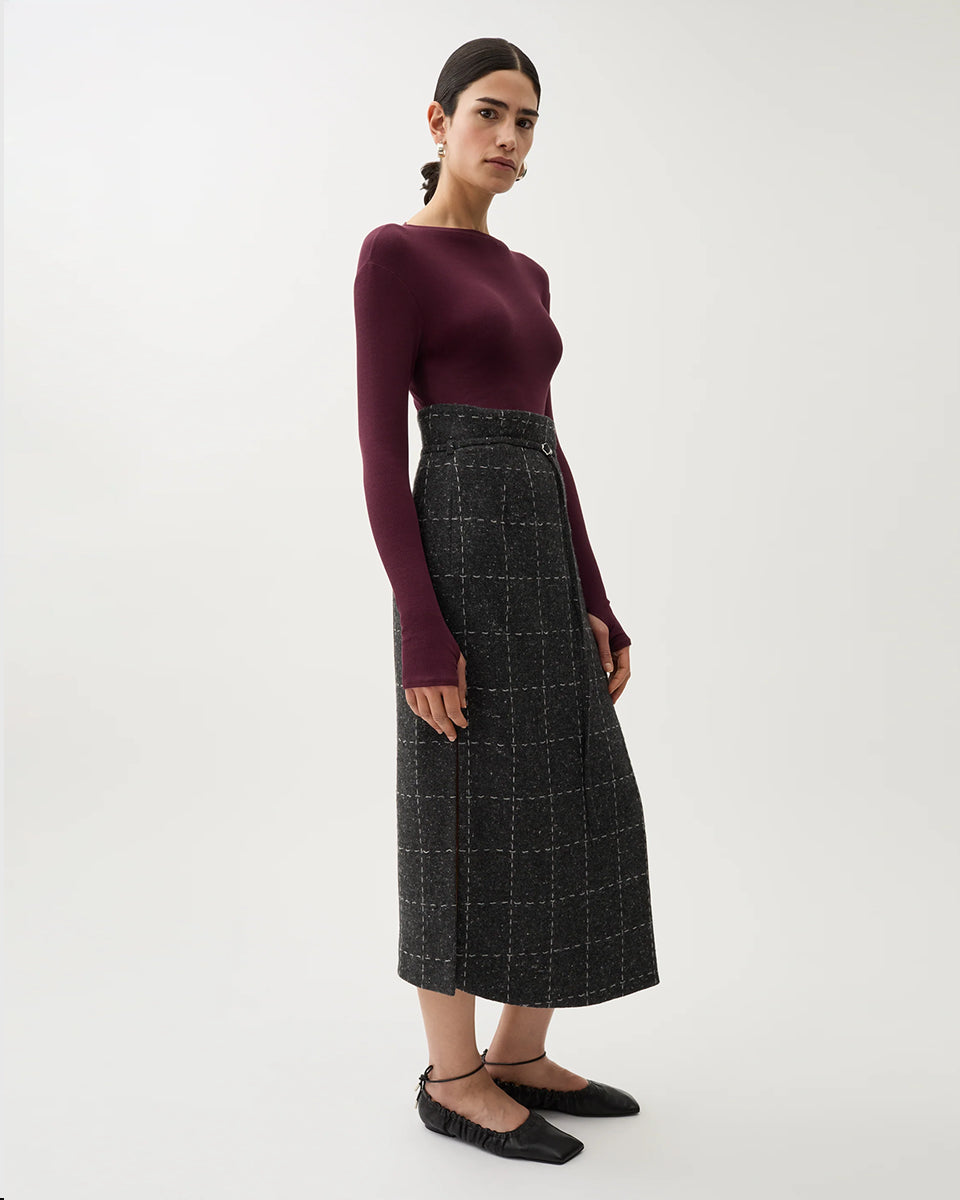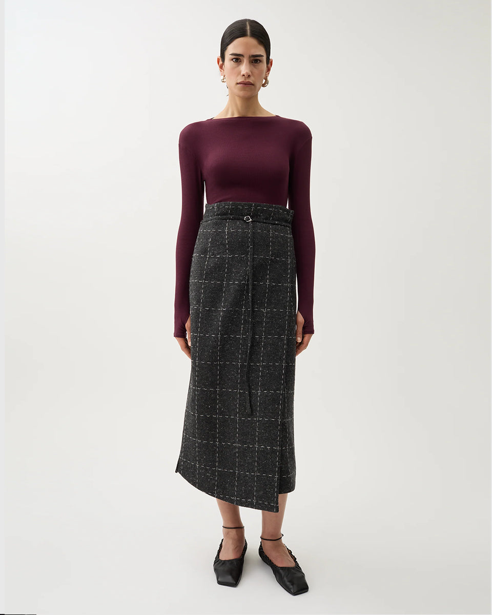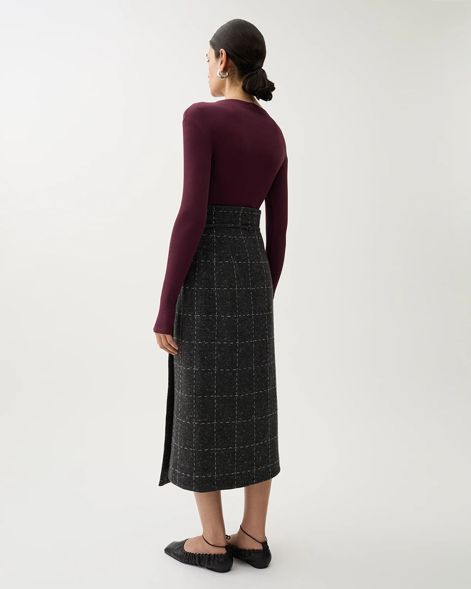 The Blanket Grey Melange midi skirt in a gray check pattern features a high waist and a paperbag-style waistband, adorned with a drawstring and a small buckle. It features side slits. Crafted from a wool blend, it pairs perfectly with flowing blouses and the Zola Check blazer from the same brand.