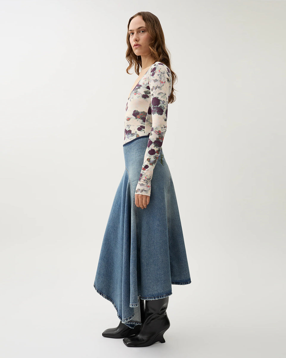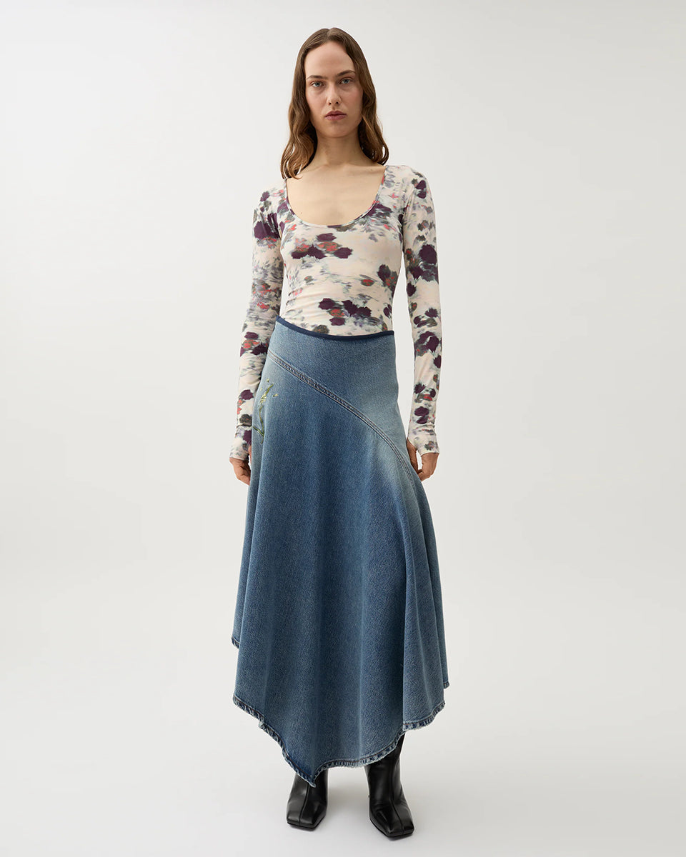 The Swoosh Indigo long, asymmetrical, high-waisted skirt is a blue denim with vintage distressing and floral embroidery. It features navy piping at the top and a side zipper closure.