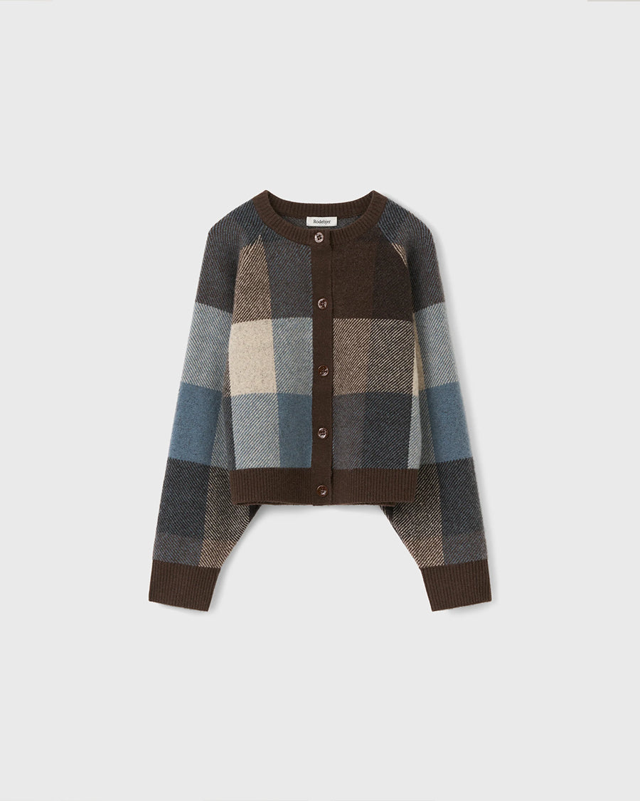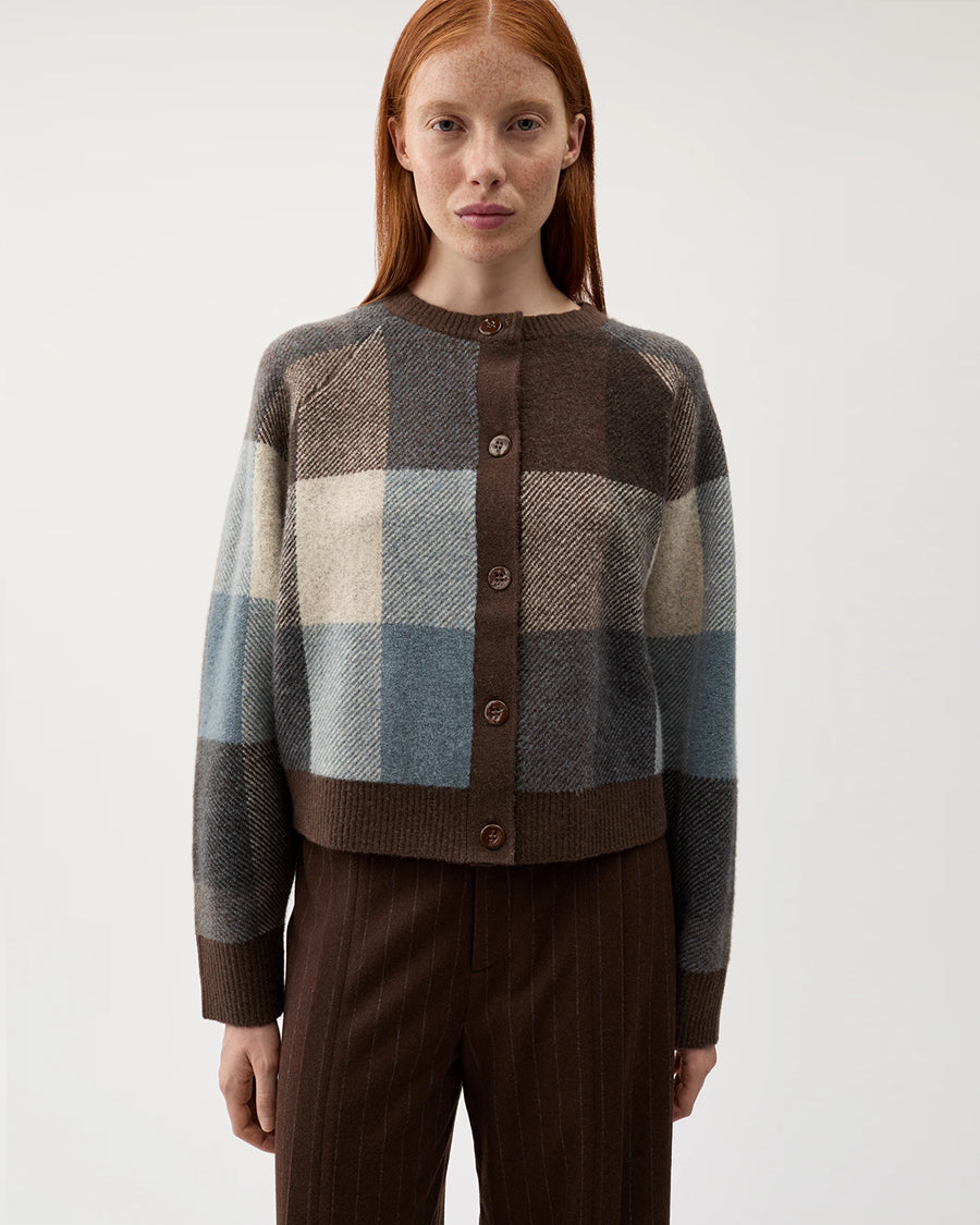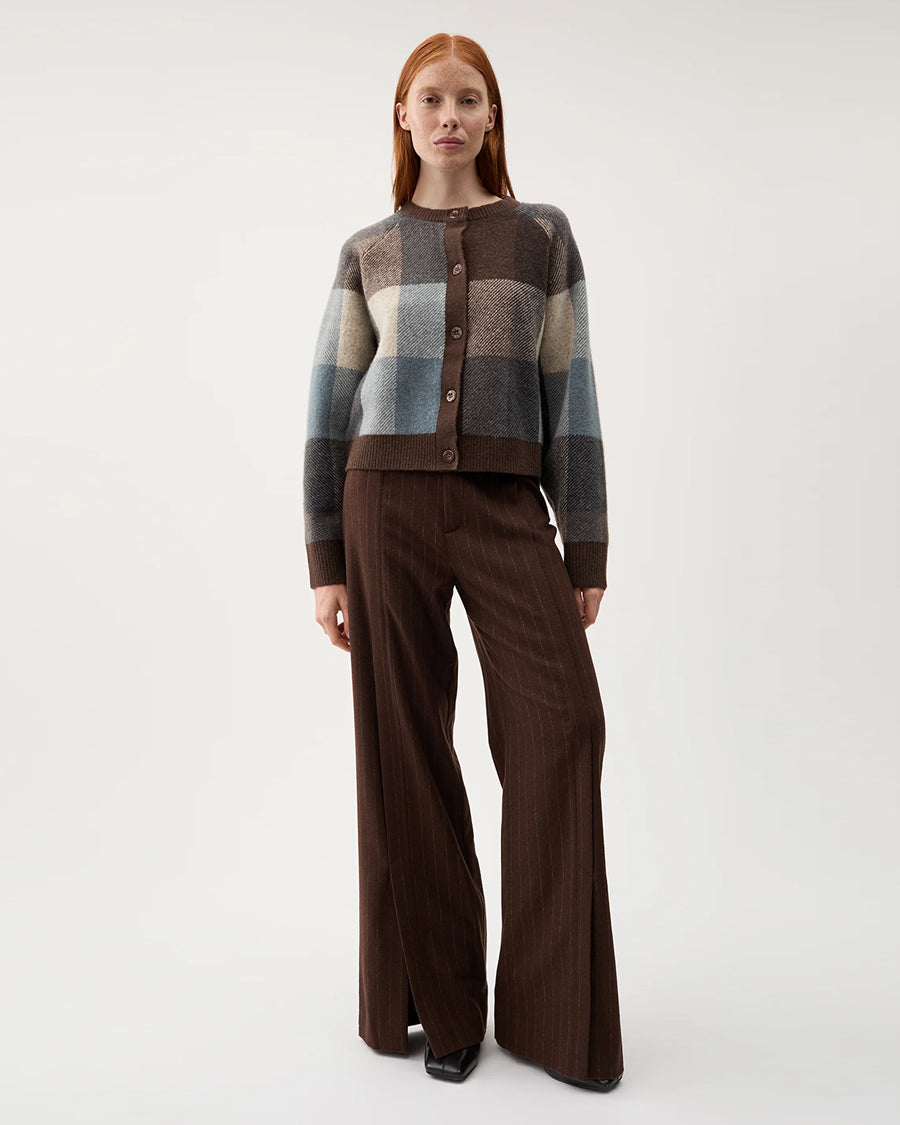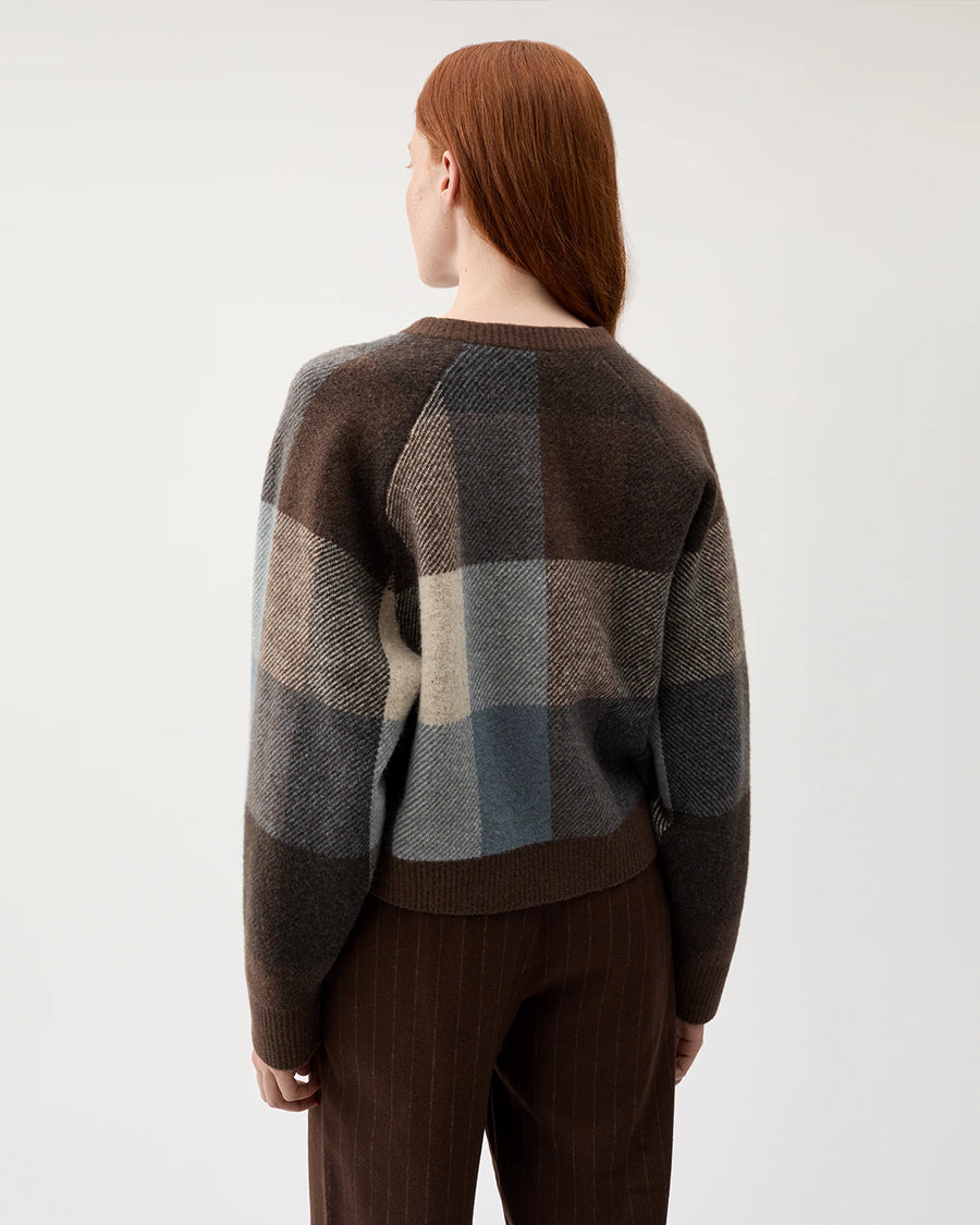 The boxy, warm Nina Chicory Coffee sweater features a multicolored check. It features a round neckline and loose sleeves. It fastens with buttons at the front and is finished with brown cuffs. Crafted from a soft knit with a wool and alpaca blend, it's perfect for autumn styling.