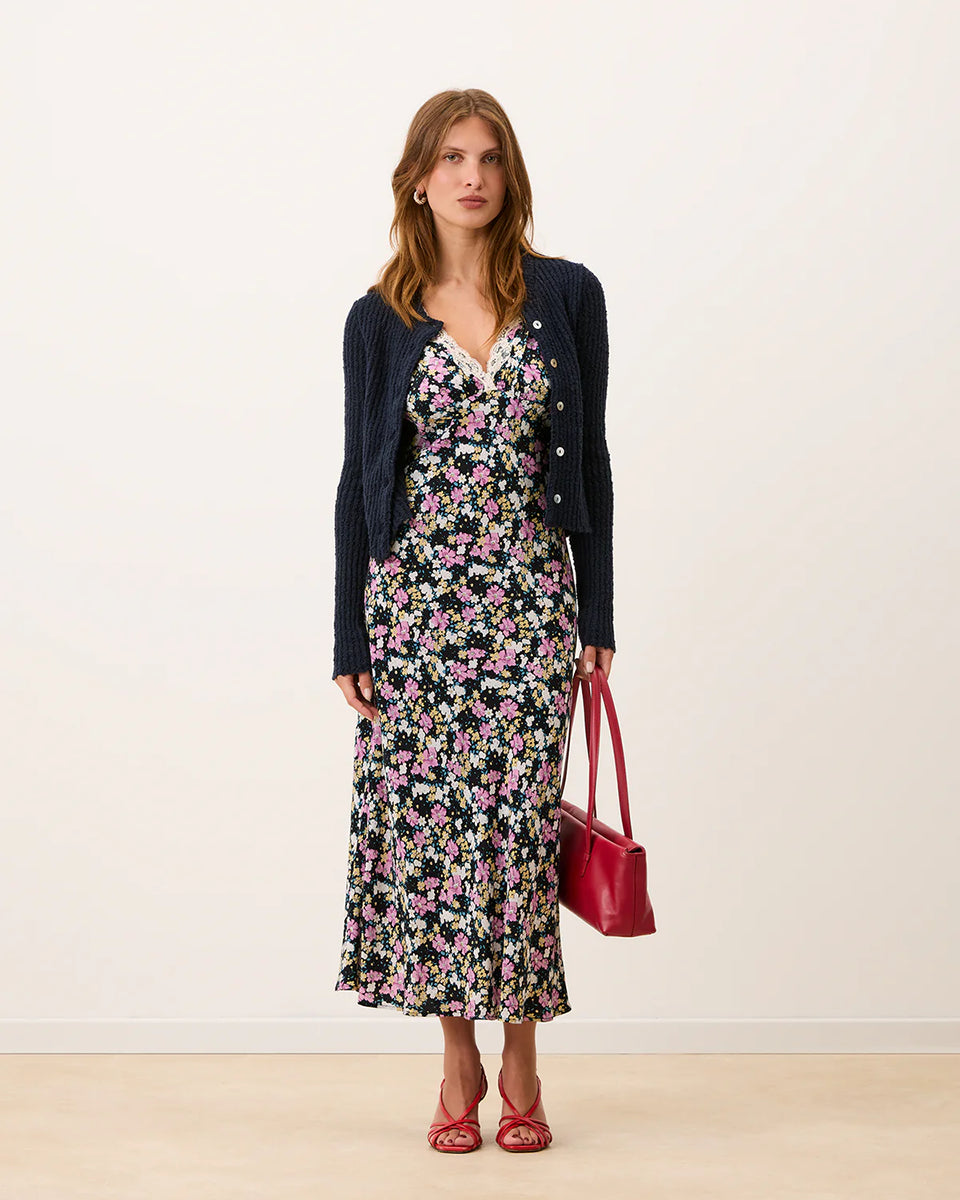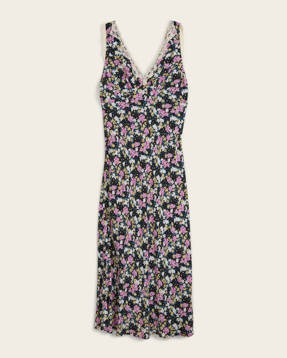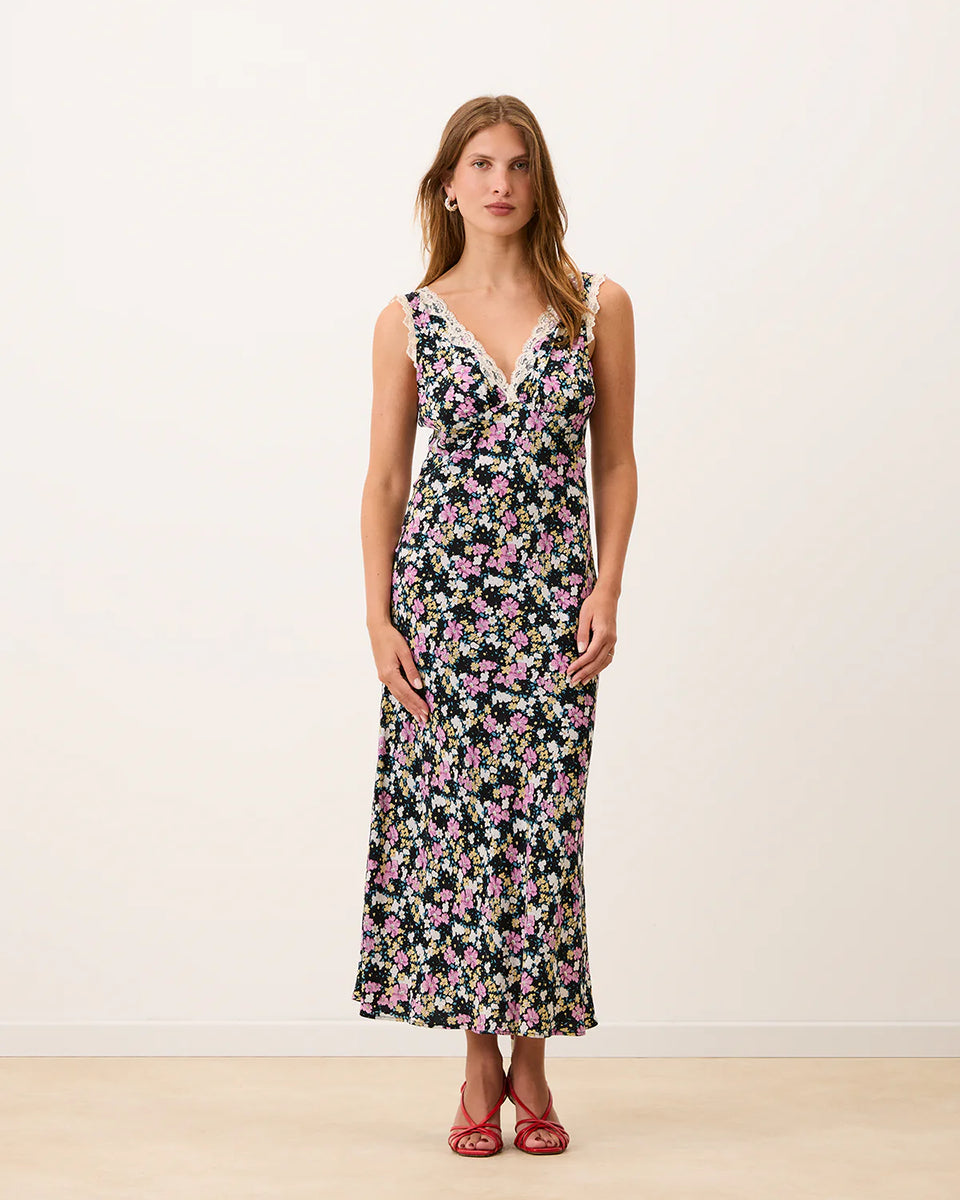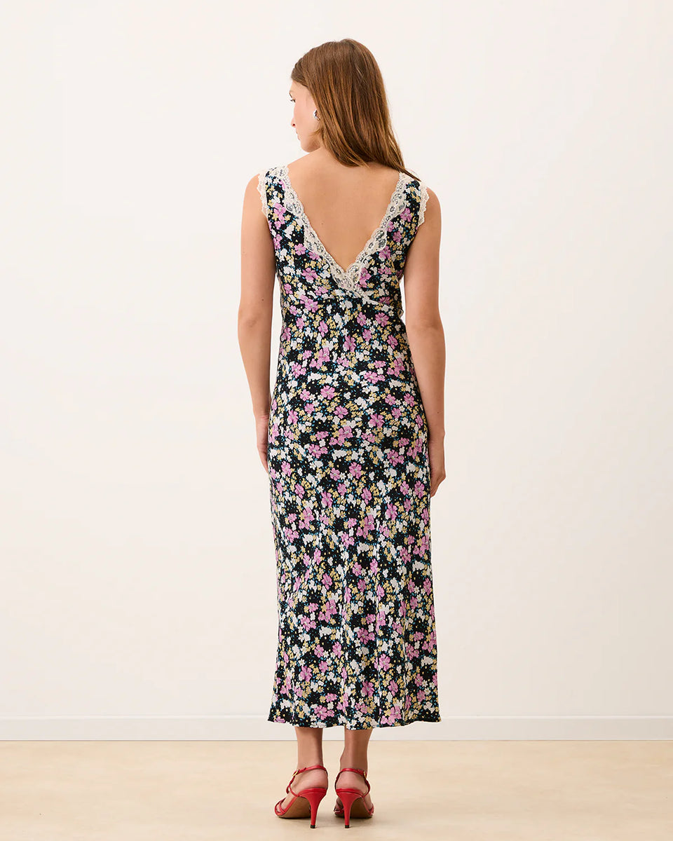 Minette Noir lace maxi dress with black floral pattern. It has thick straps, a V-neckline, and a deep back slit decorated with contrasting white lace. It is slightly fitted under the bust and then flows loosely downwards, without clinging to the figure. The length reaches approximately to the ankle. Pair the dress with heeled sandals, and on colder days, add an oversized cardigan.