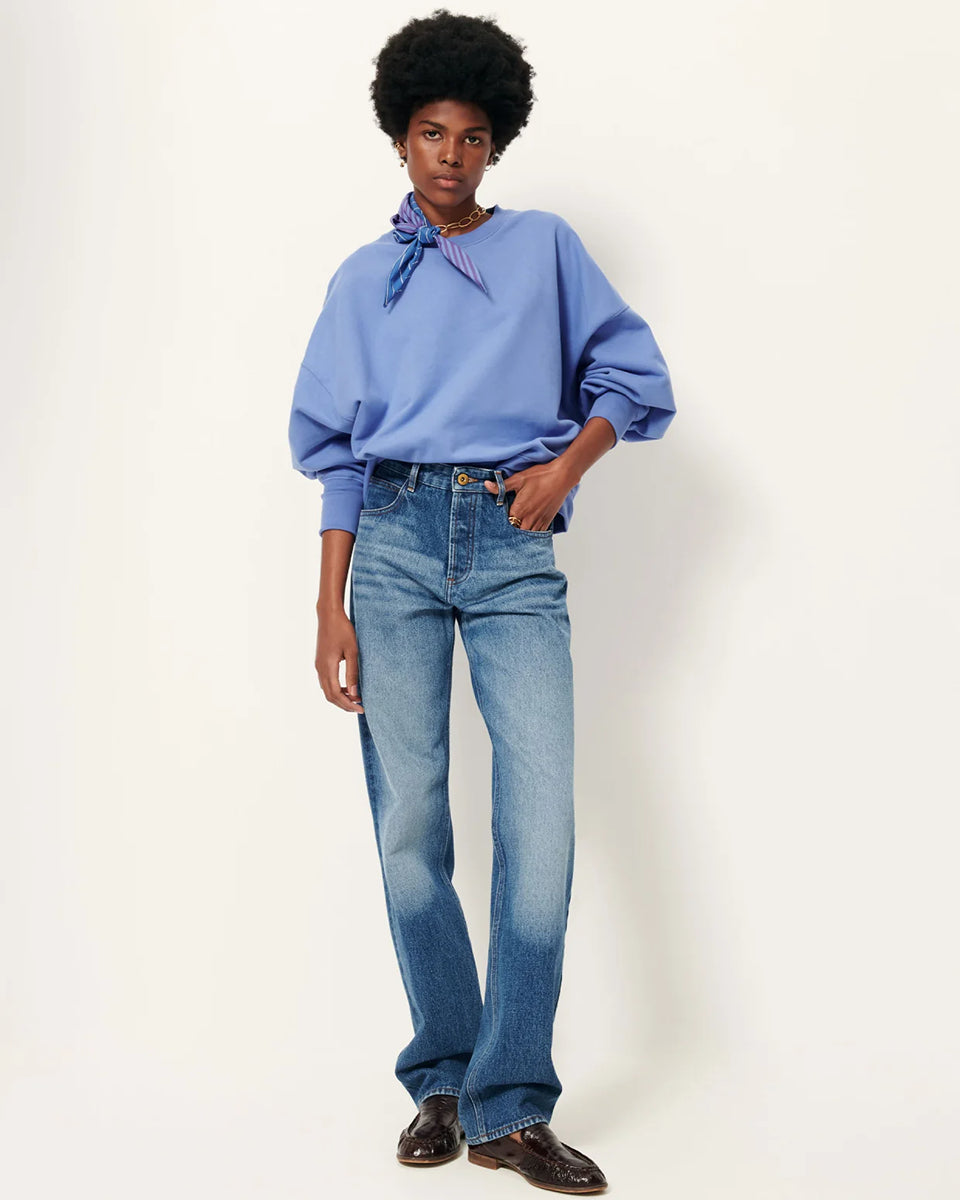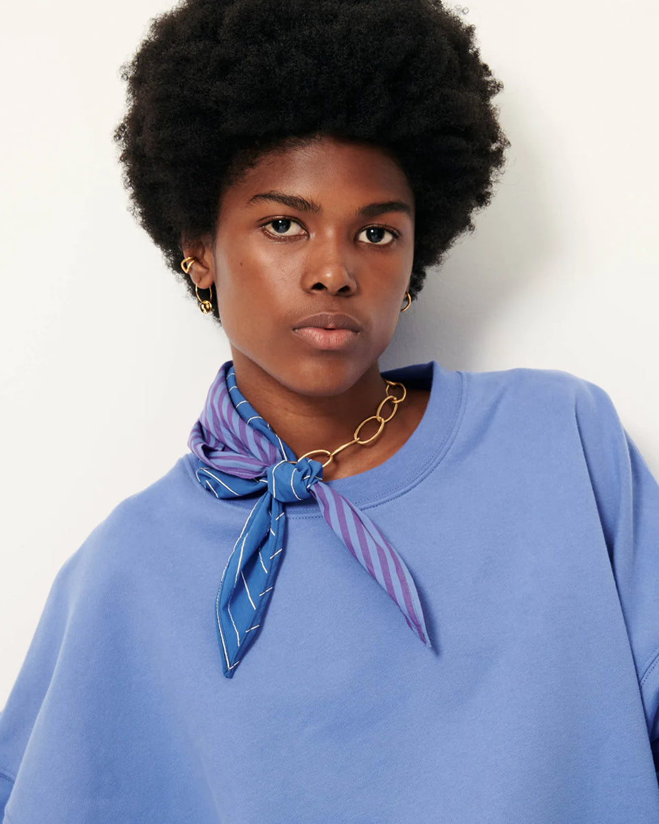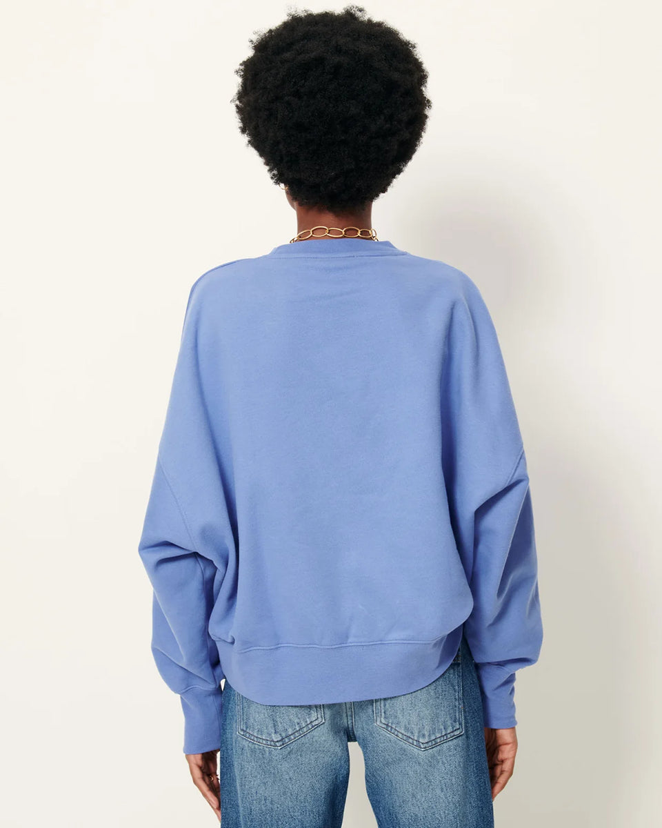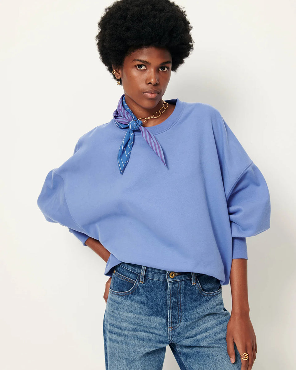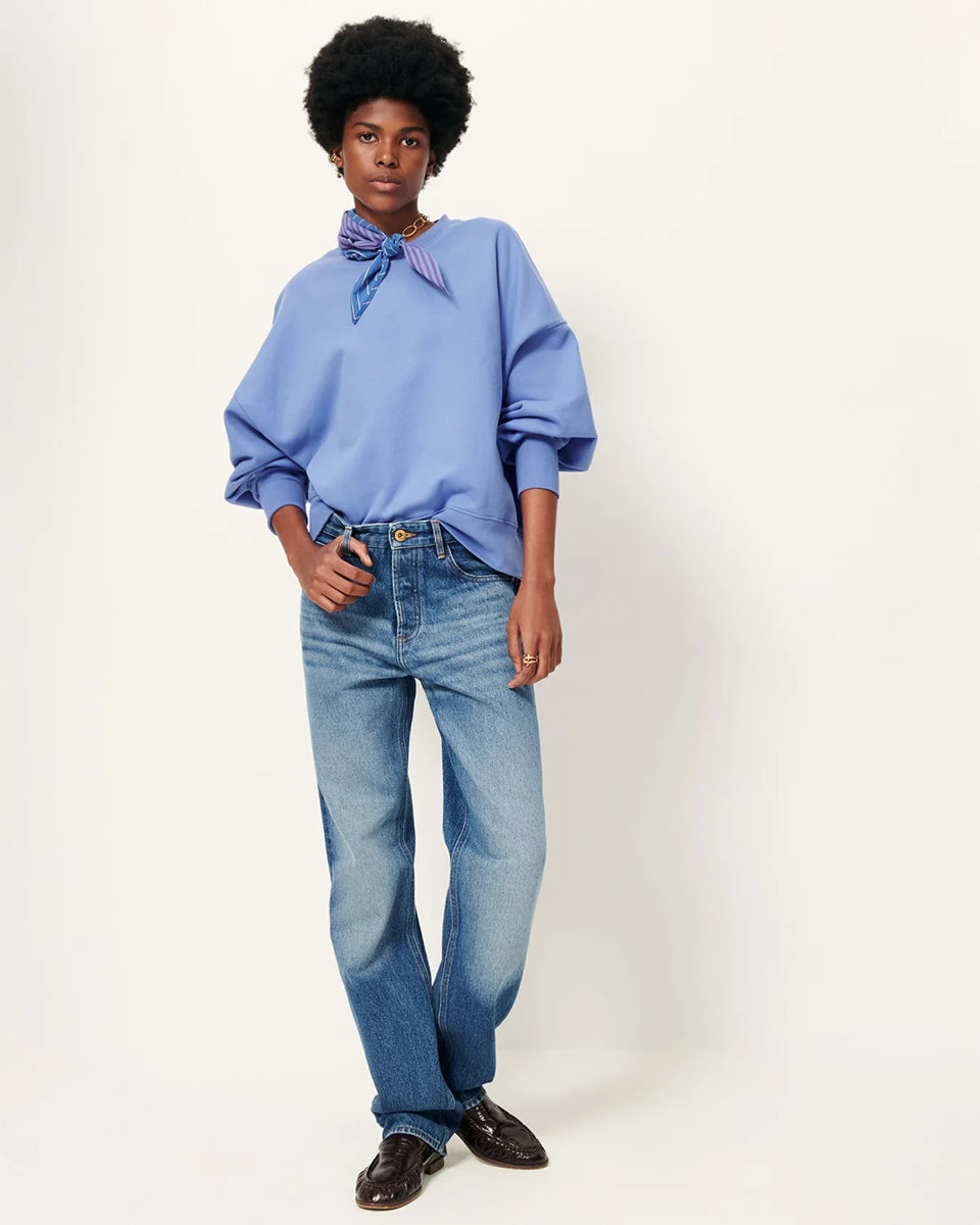 The Isi Italian Blue oversized sweatshirt from Sessun features a crew neck, long sleeves with fitted cuffs, and dropped shoulders. It's made of brushed fleece.