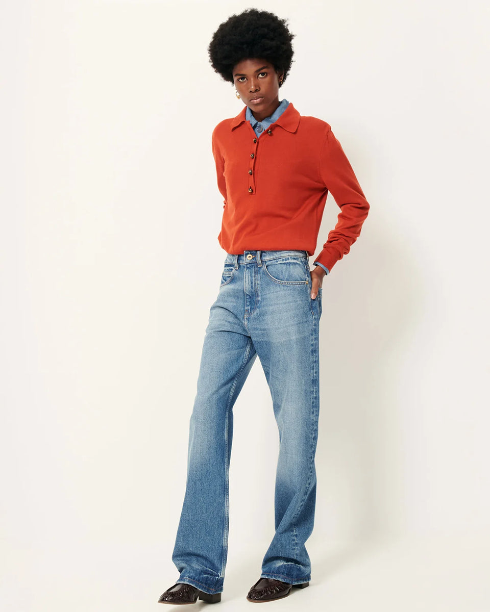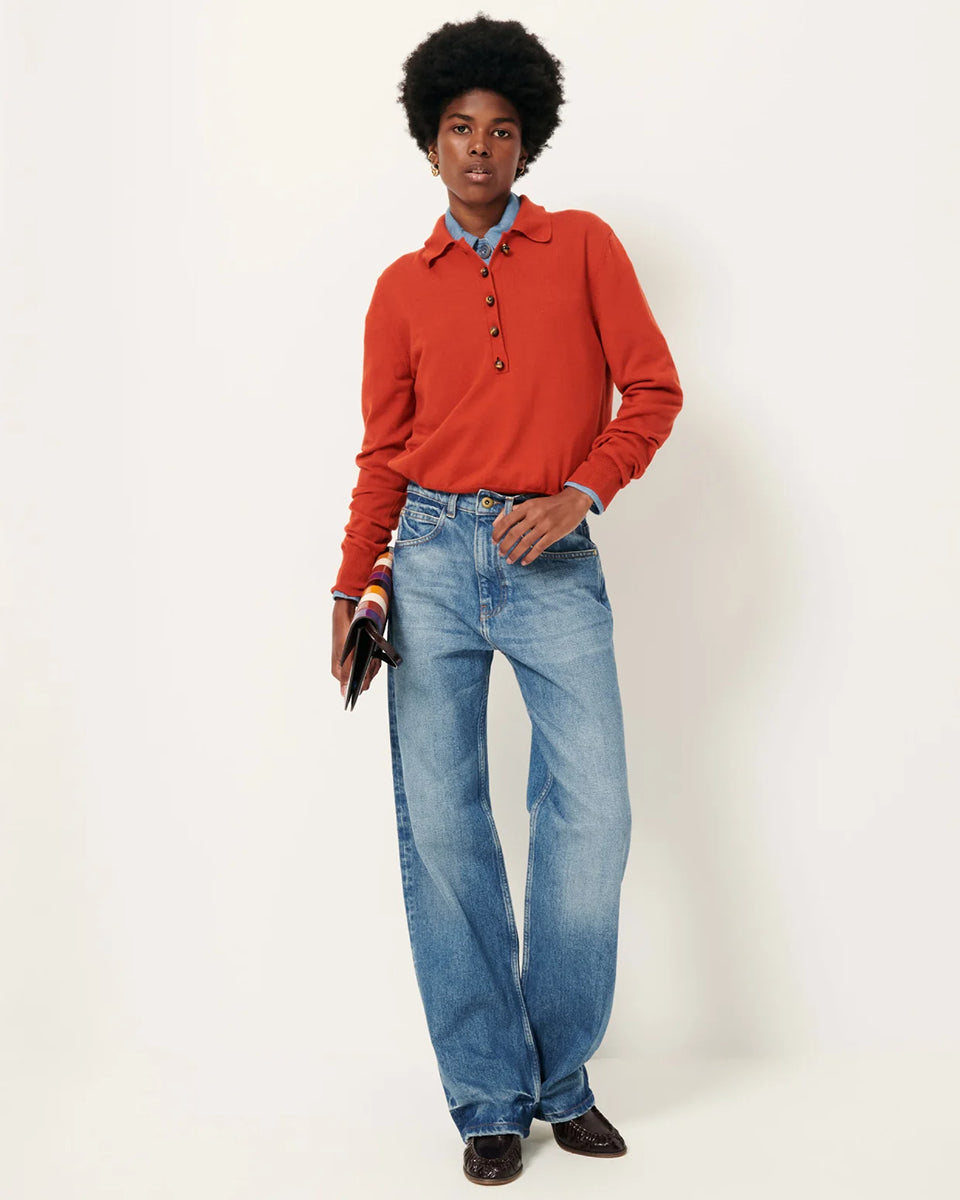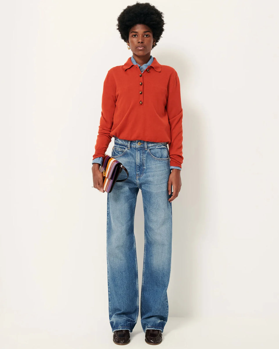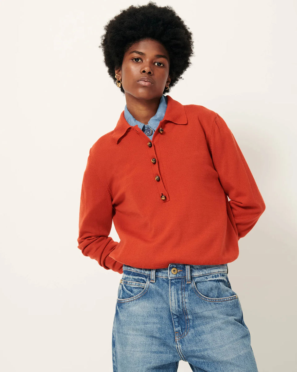 The Yanaka Vitamin polo sweater by Sessun in a brick red color features long sleeves, straight cuffs, and a collar fastened with decorative buttons. Crafted from fine merino wool, it's also made from a cotton jersey.