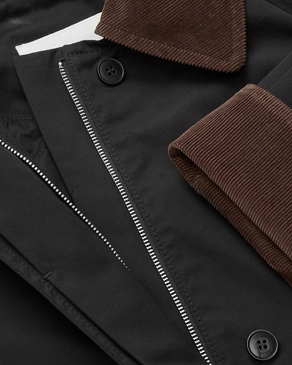Gaby oversized, transitional, British-inspired SKALL coat features a large collar trimmed with brown corduroy and wide, rolled-up sleeves with corduroy trim on the inside cuffs. The coat features two side pockets and a slit at the back hem. It fastens with a zipper and buttons. The coat is insulated and lined with a quilted, padded interior. It falls to mid-calf length.