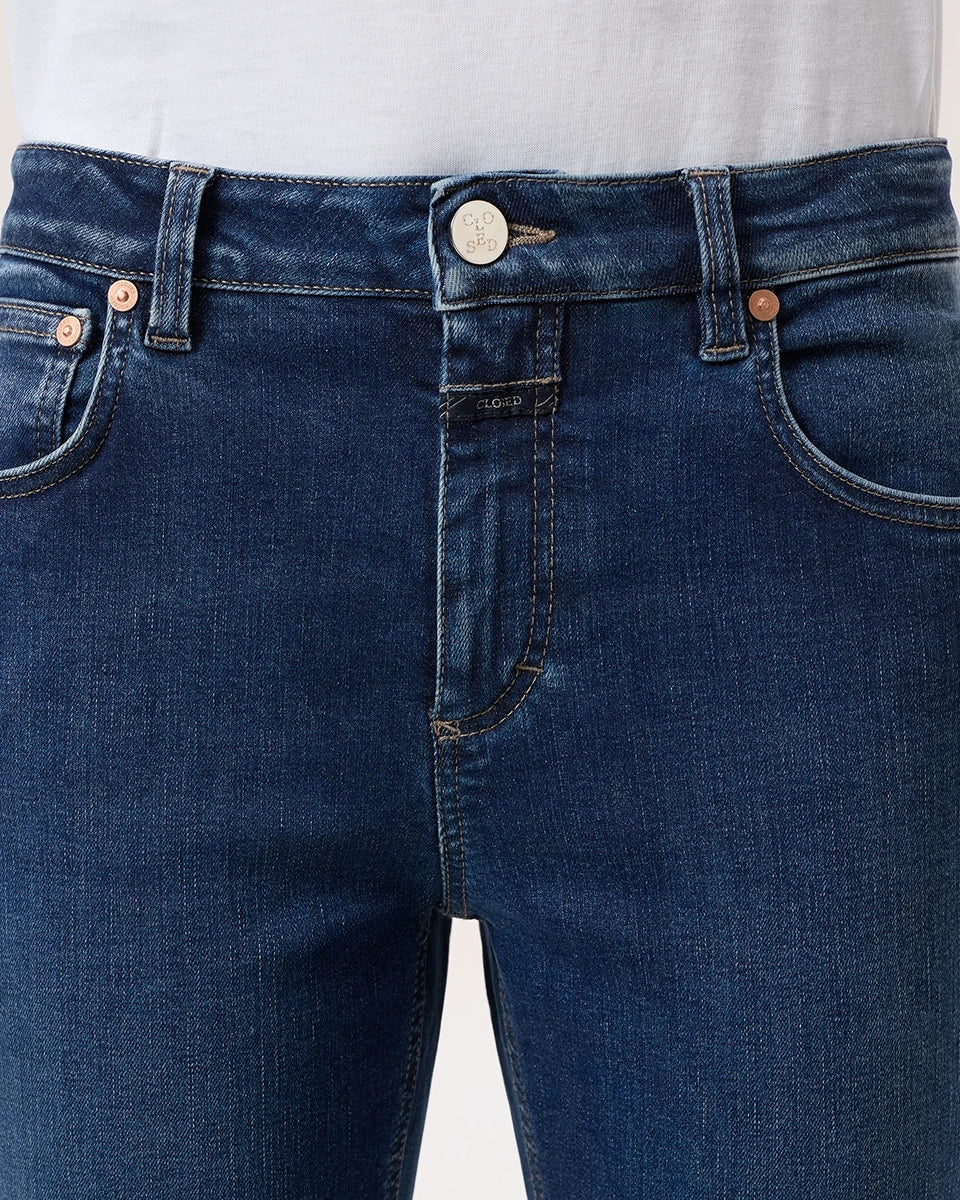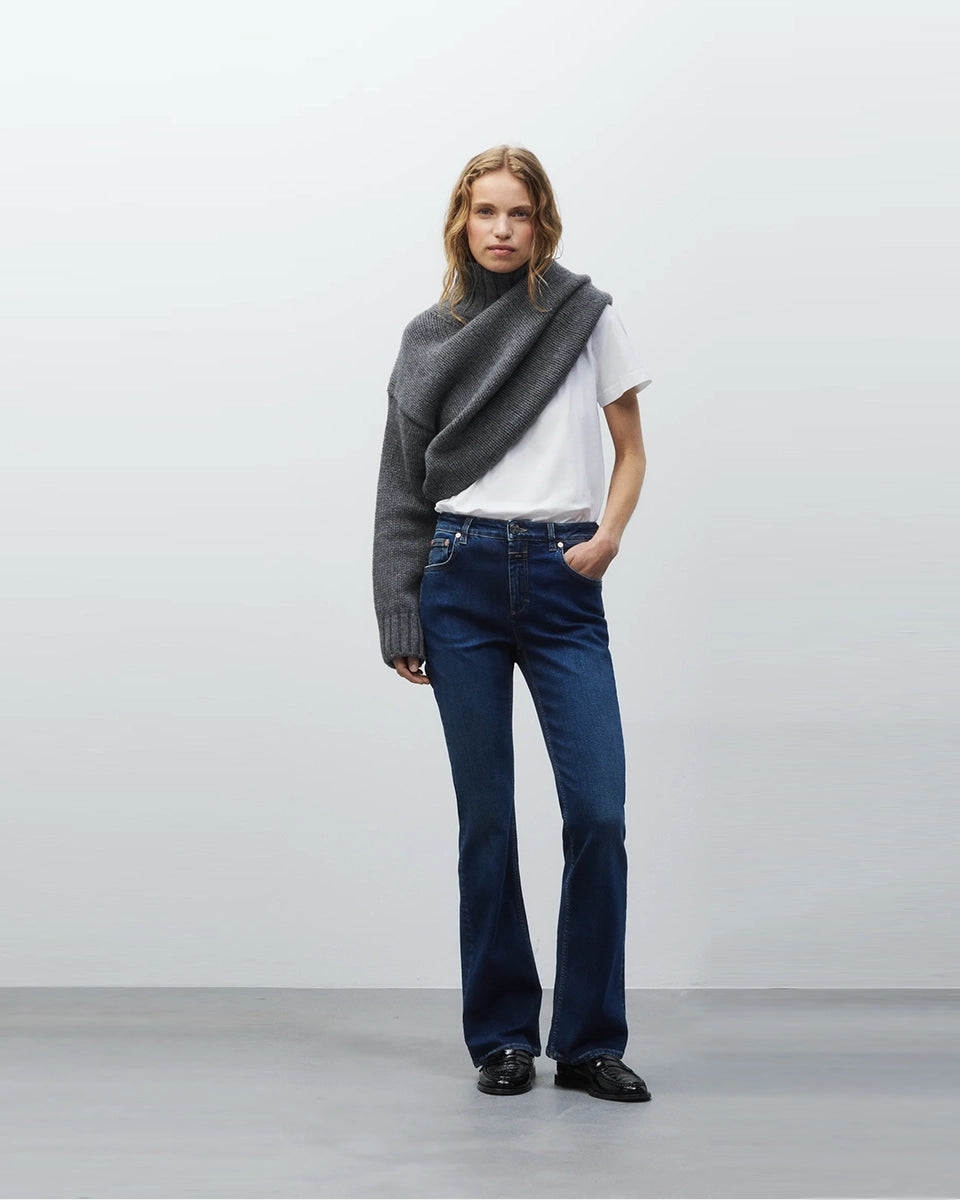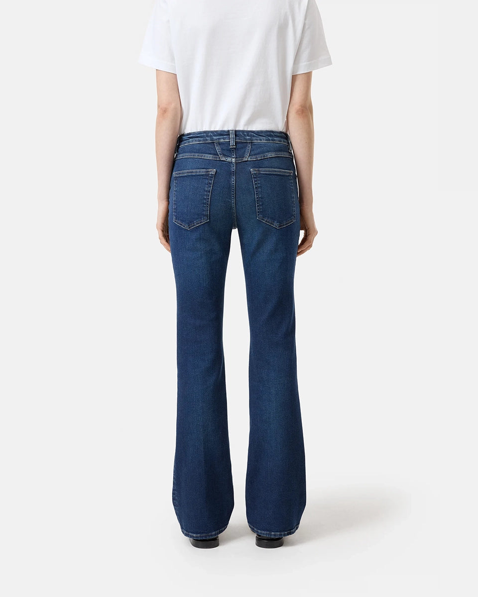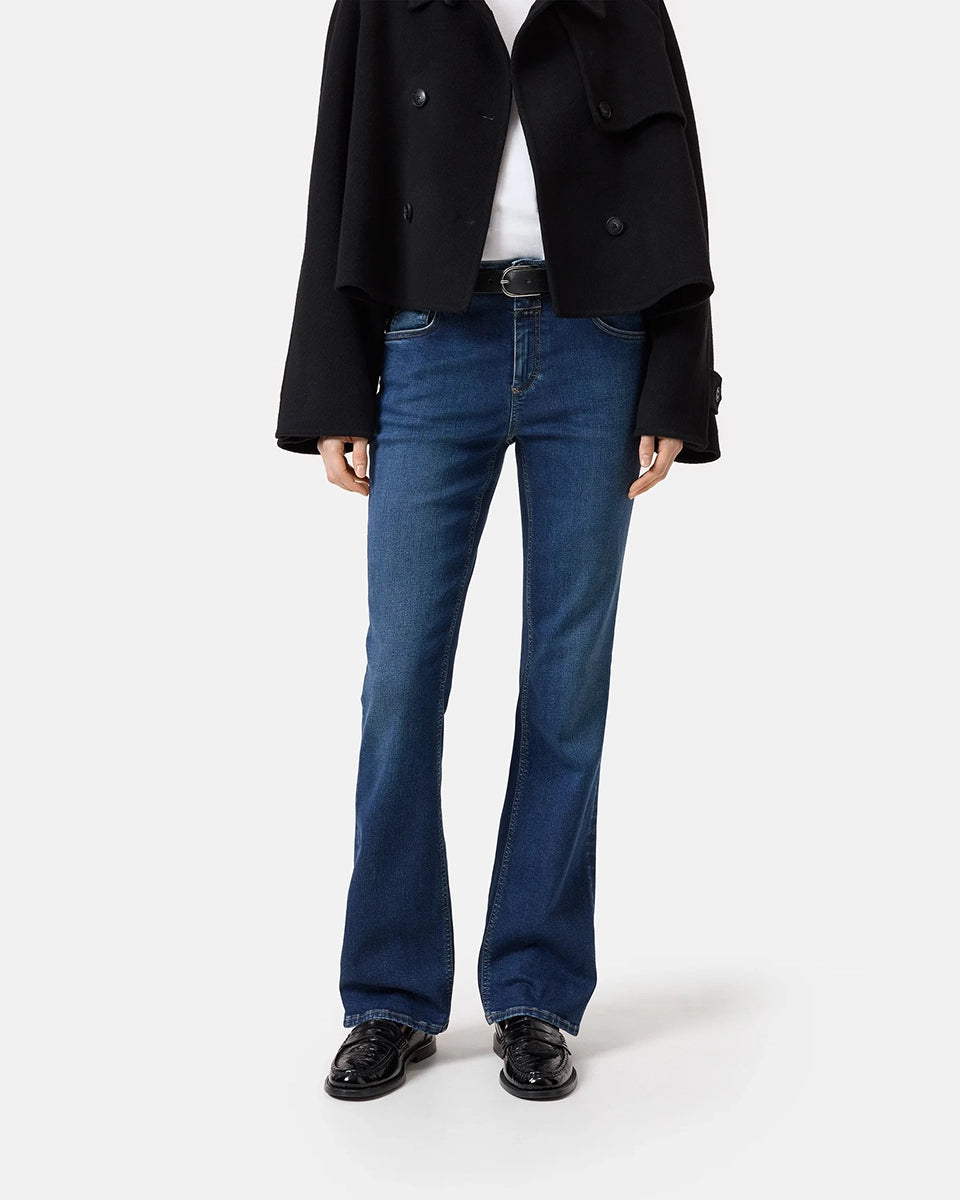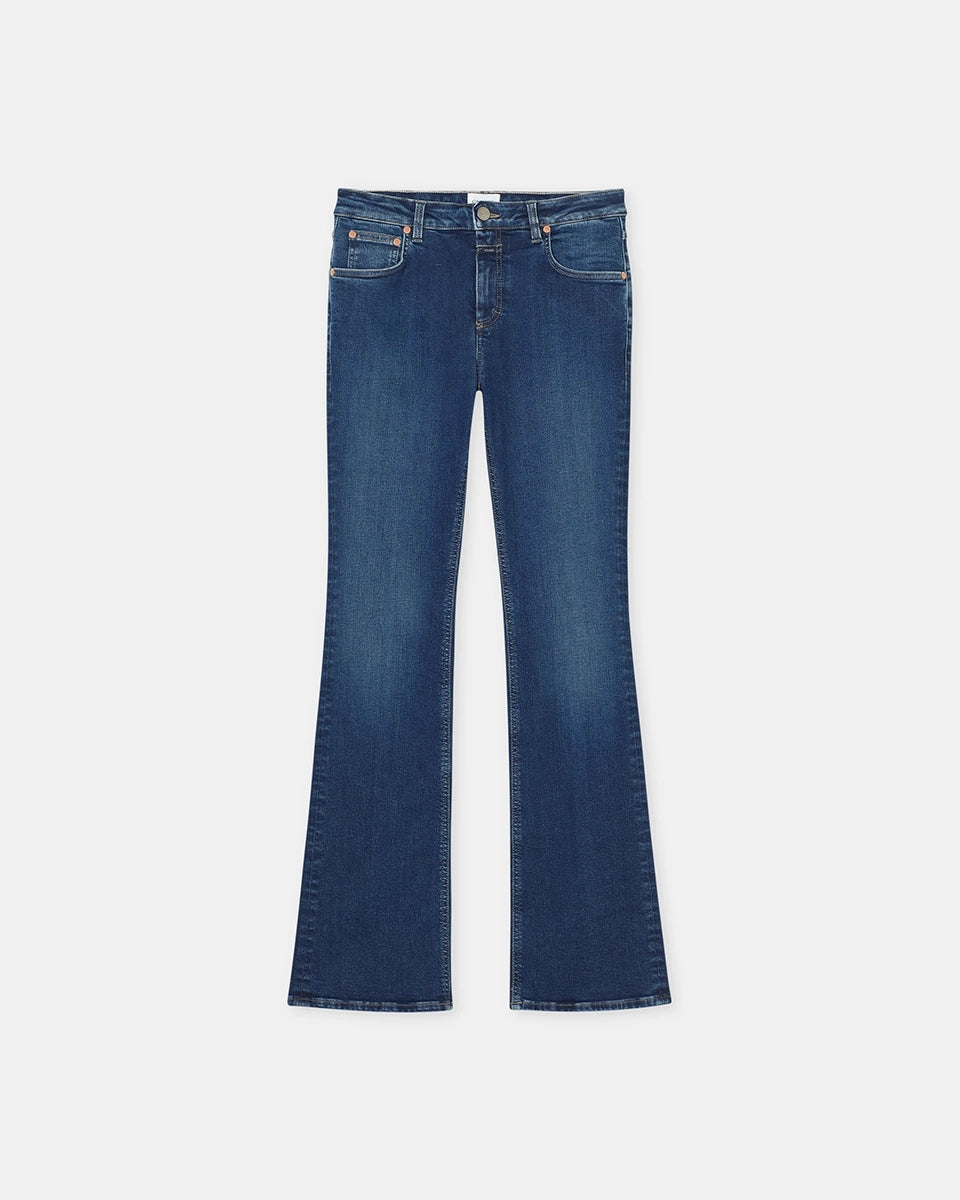 Jovanna CLOSED navy blue jeans feature a low rise and a flared leg. They fit snugly through the hips and thighs. Crafted from Italian stretch denim, these jeans are crafted from a stiff cotton blend with a touch of elastane. They feature a button and zipper closure.