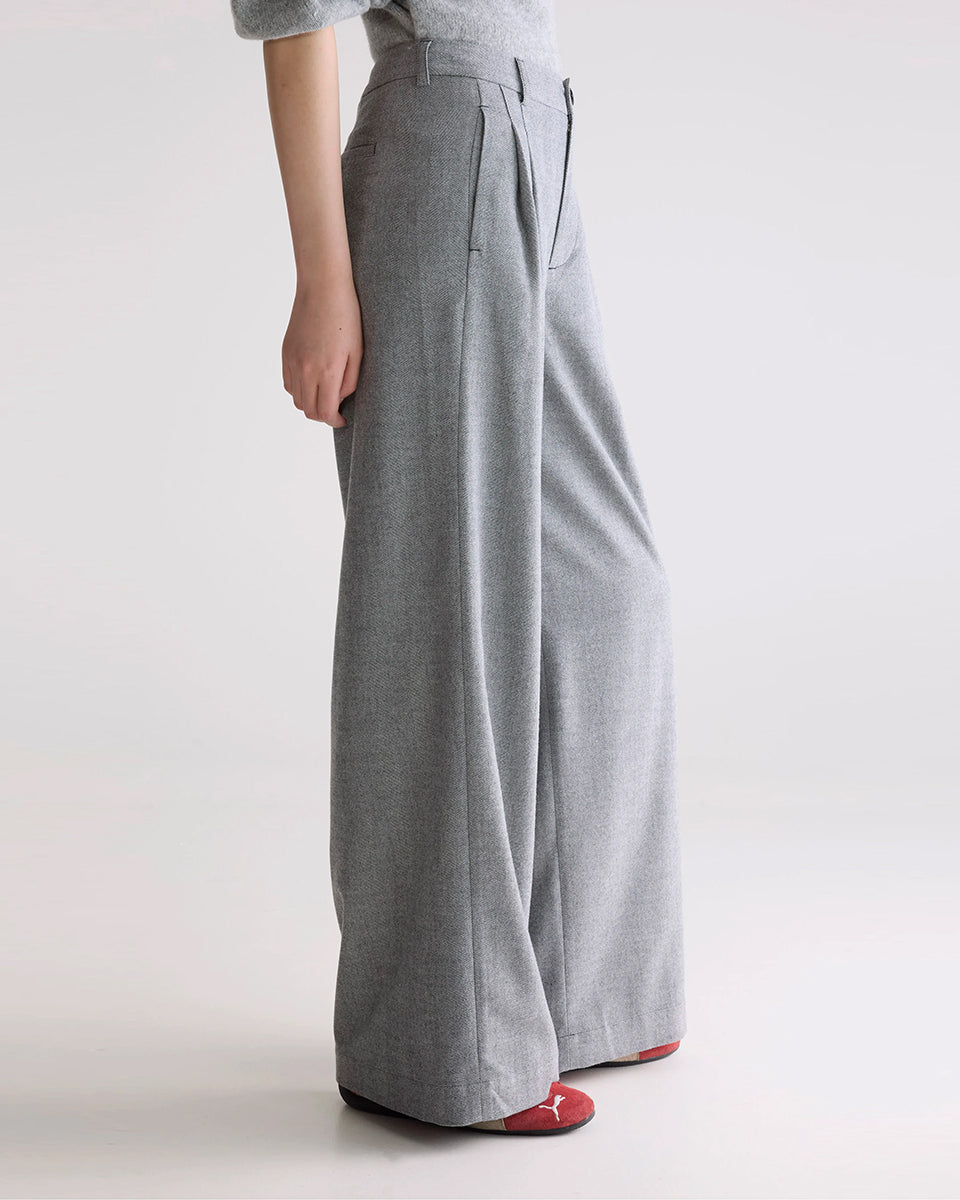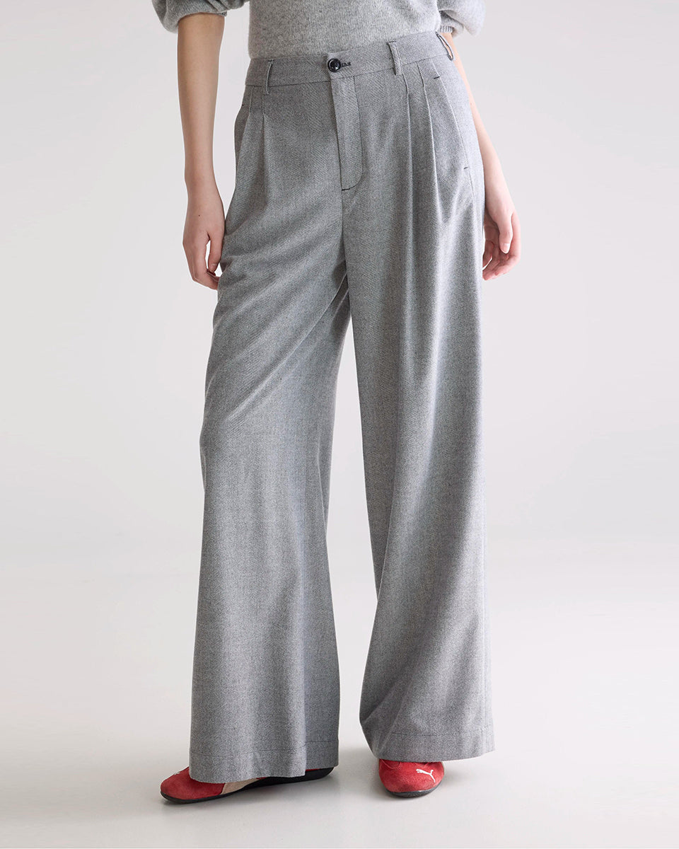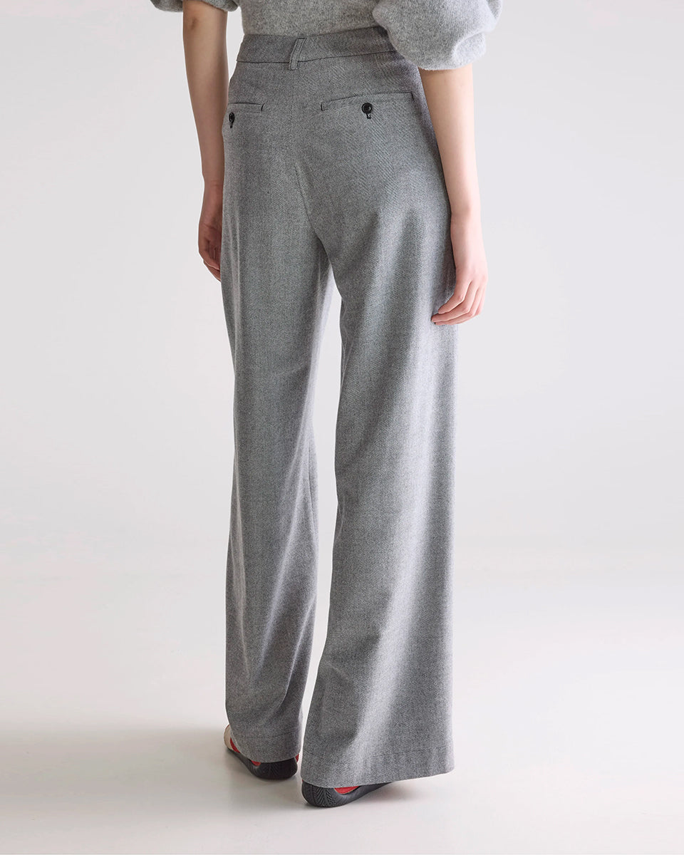 Volkert Bellerose loose-fitting, high-waisted trousers with pleats. The trousers feature wide, straight legs. Crafted from a soft viscose blend with a subtle herringbone pattern, they feature two side pockets and two back pockets. Pair them with a cropped, boxy sweater or a fitted polo shirt. Perfect for everyday wear and work.
