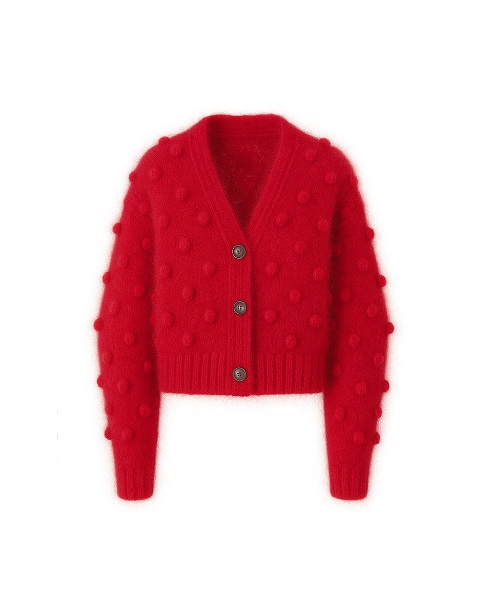 Oversizowy, gruby kardigan Kalina marki Berenika Czarnota o pudełkowym fasonie z charakterystycznymi "bąbelkami". Wykonany ręcznie, rzemieślniczo w Polsce. Sweter ma dekolt w serek, szerokie rękawy zakończone ściągaczami, opadające ramiona i prosty krój. Zapinany na duże guziki. Wykonany z miękkiej, grubej włóczki z wełny i moheru