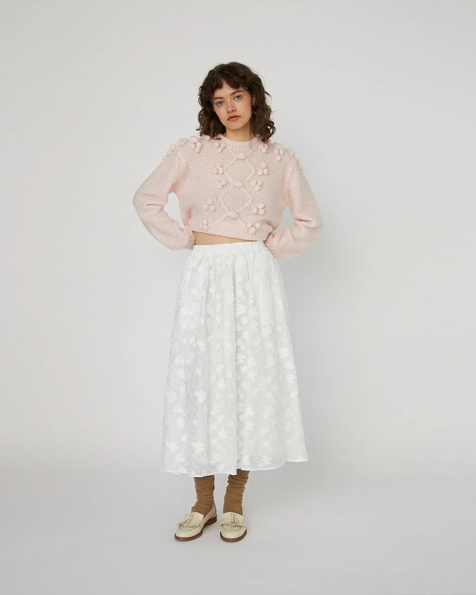 The Cable with Bobbles Pink wool sweater by STELLA NOVA features a short, rounded neckline and long sleeves. It features 3D pompom embellishments. It pairs perfectly with high-waisted trousers or a skirt. Made of wool knit fabric.