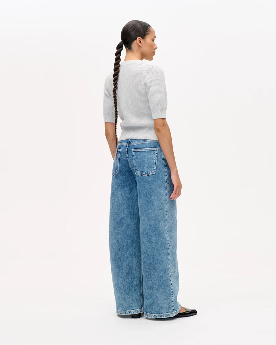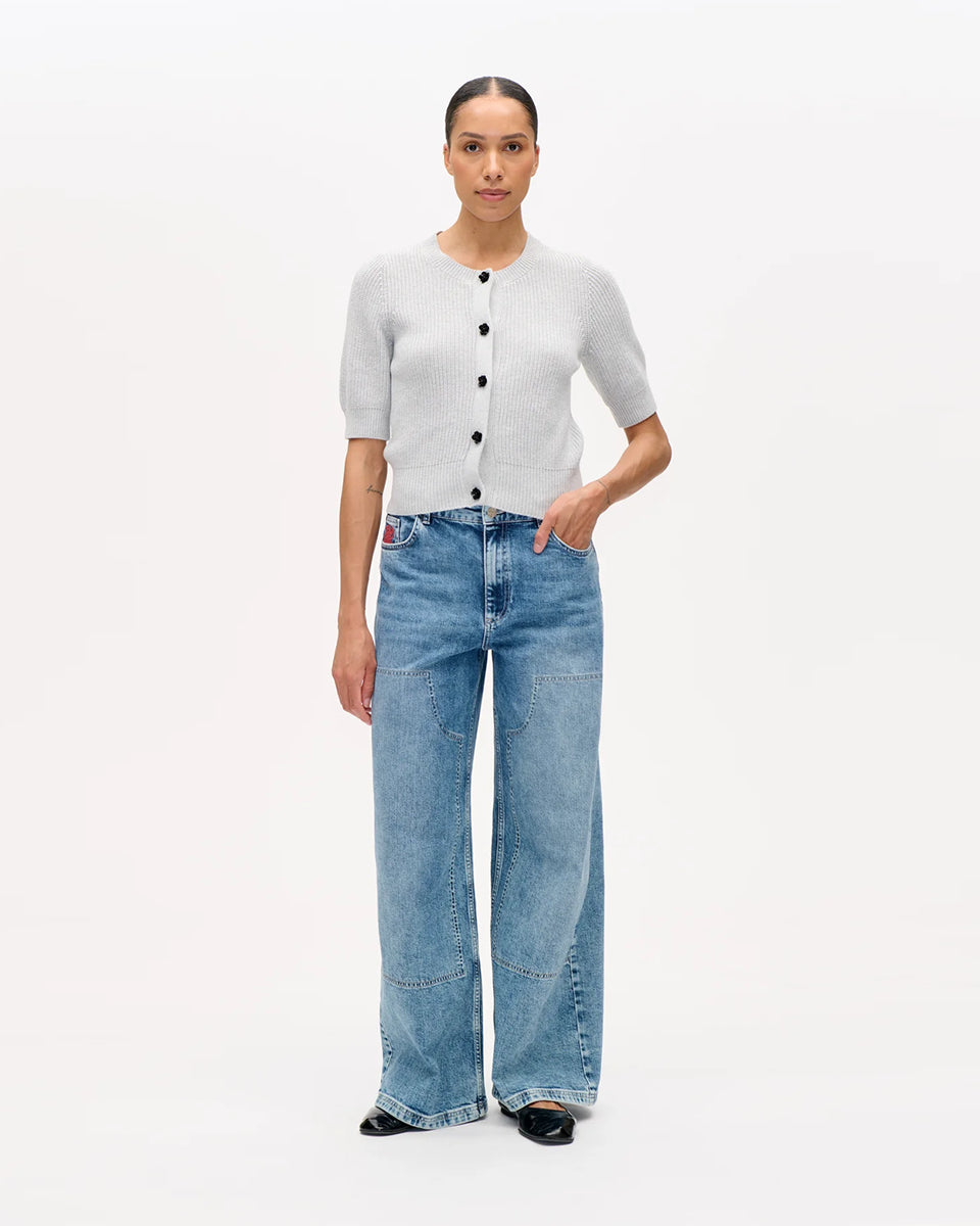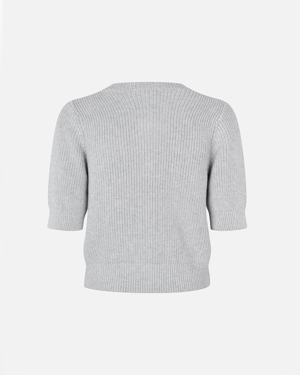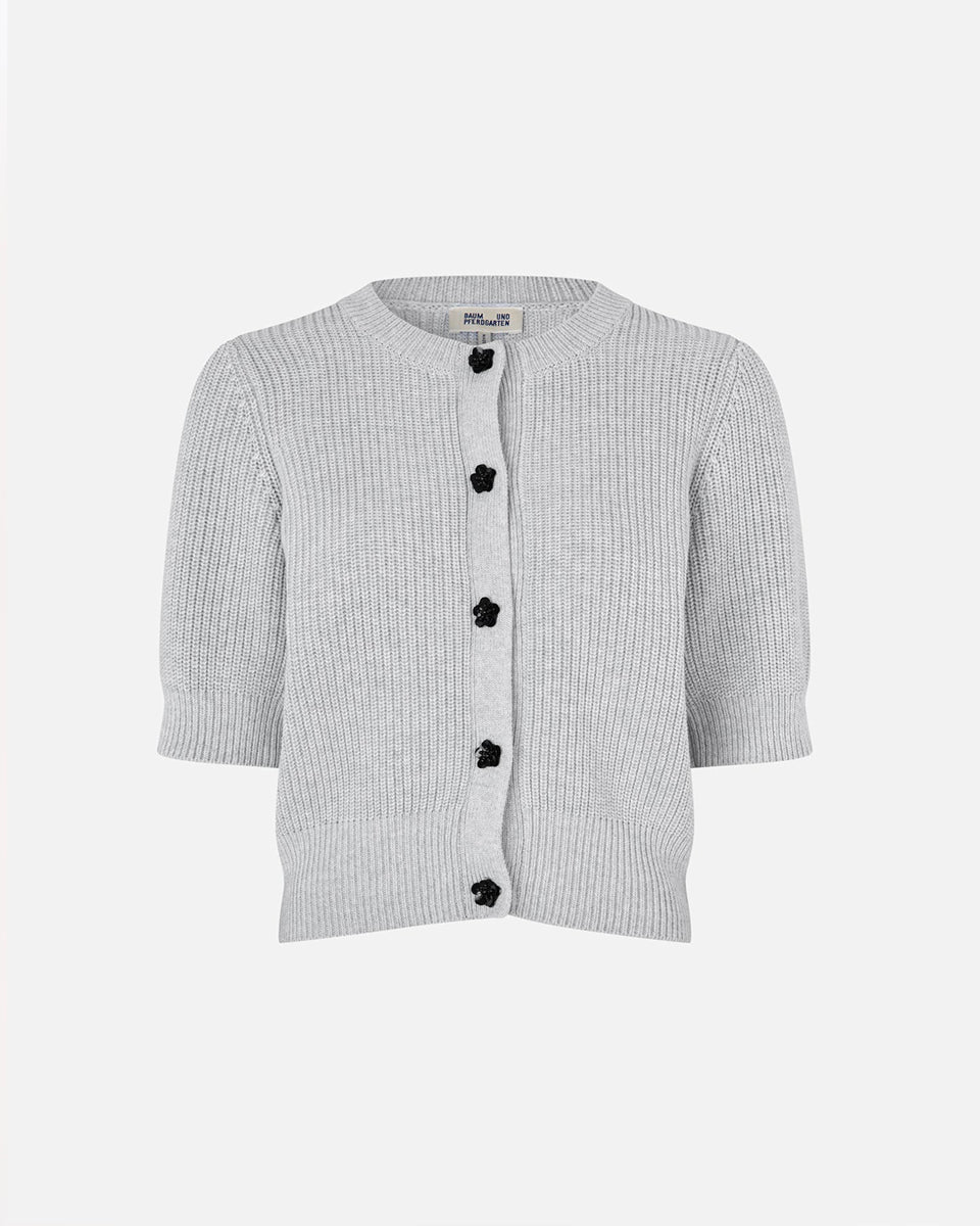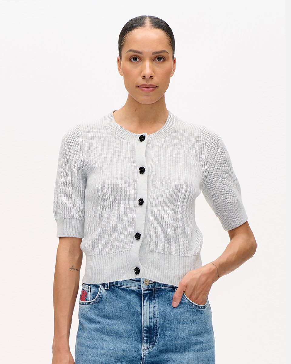 The Cathia Grey Melange short-sleeved knit cardigan features a slightly fitted cut. It fastens with snaps adorned with shimmering flowers. Made of organic cotton, this sweater pairs well with your favorite jeans or a skirt.