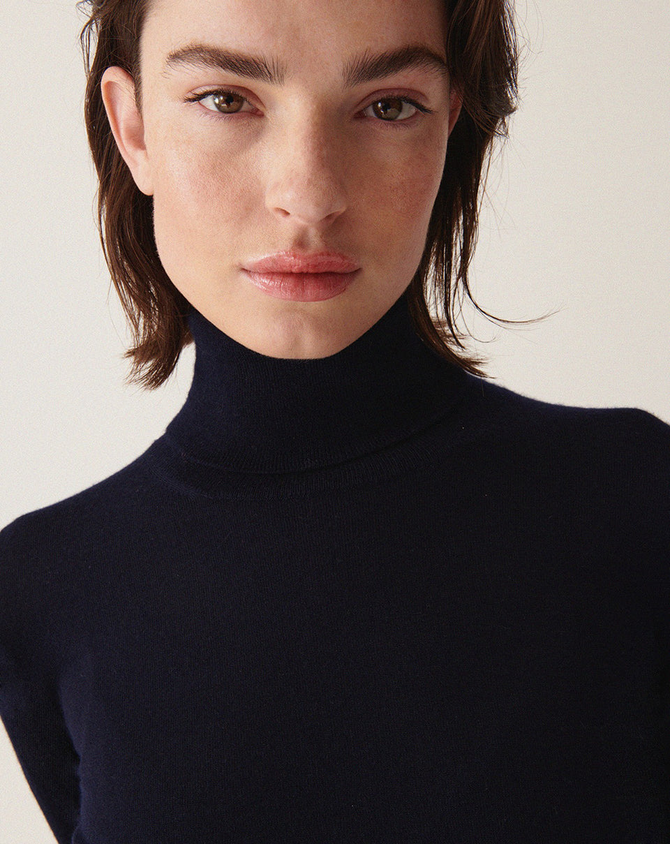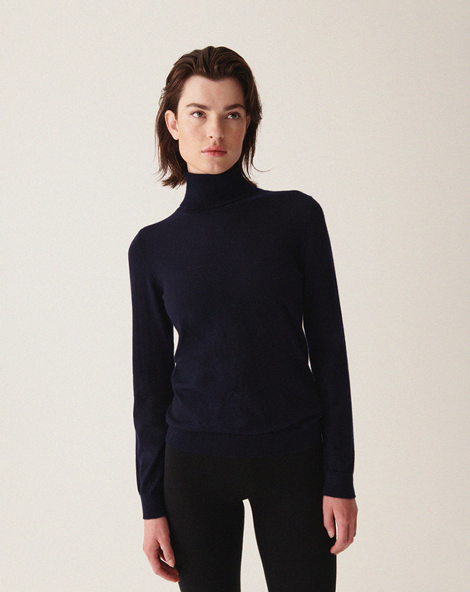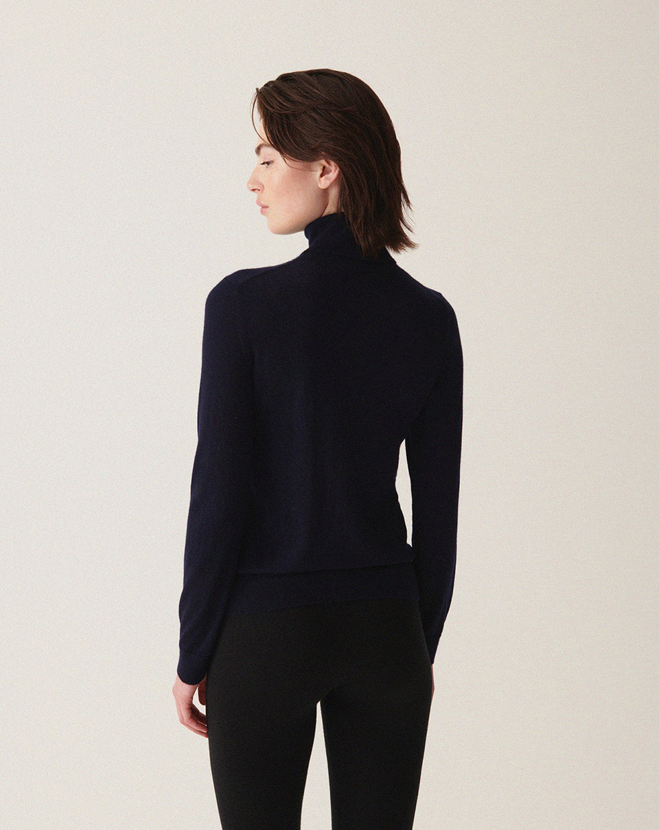 This simple, slim-fit navy blue MO940N Marine turtleneck with long sleeves is made of 100% cashmere and is a perfect staple for fall styling.