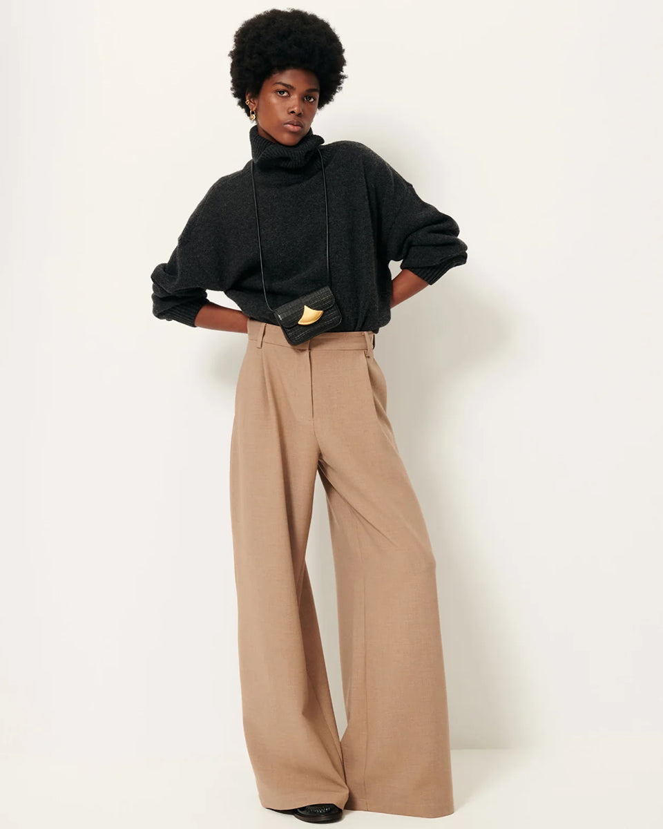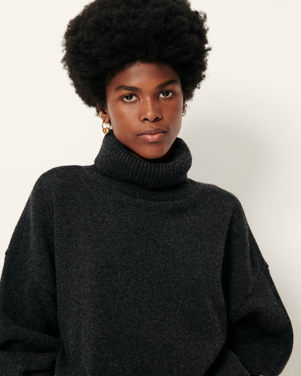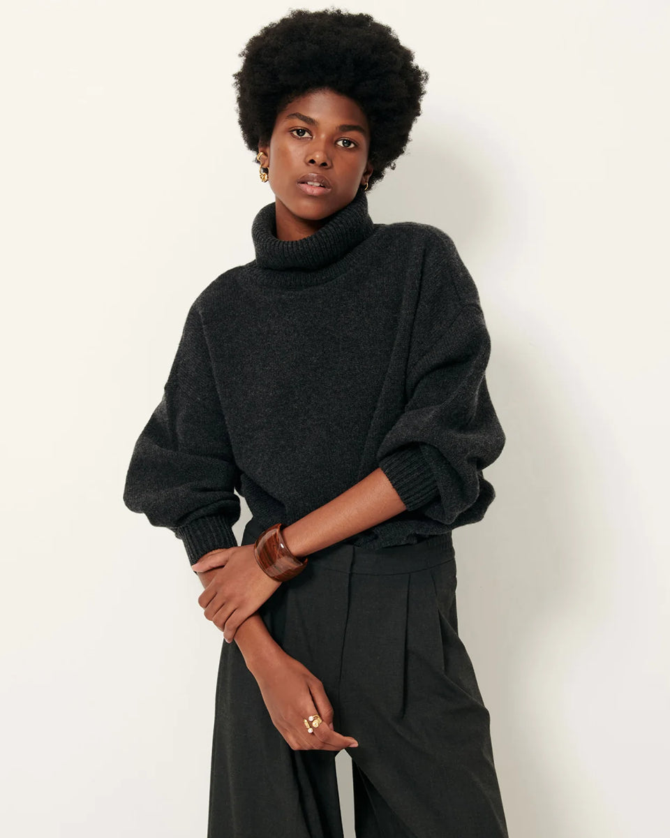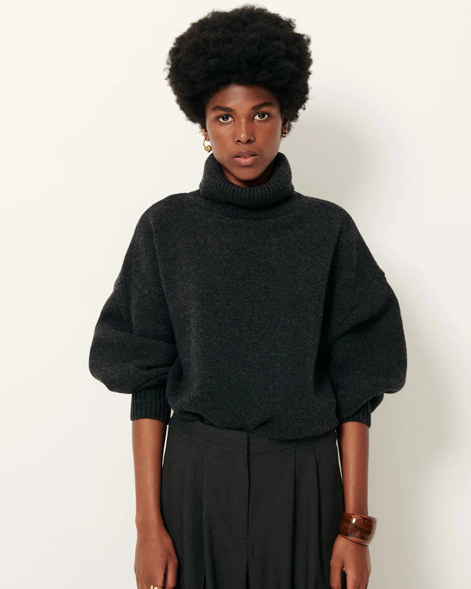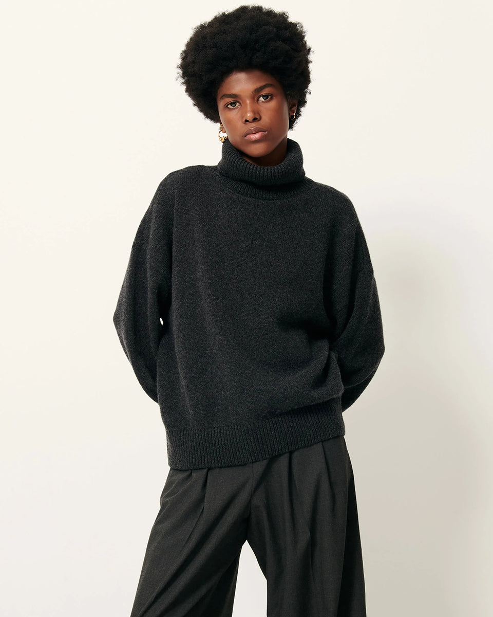 Niko Carbonella's classic, loose-fitting turtleneck sweater in dark gray features long sleeves and dropped shoulders. Crafted from a merino wool and cashmere blend, this sweater pairs perfectly with classic trousers or a skirt for the perfect autumn look.
