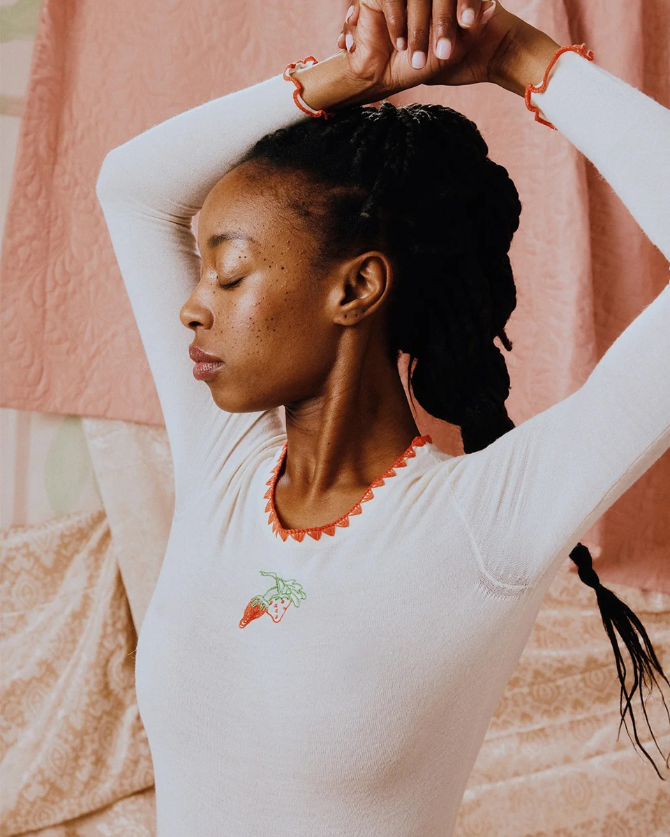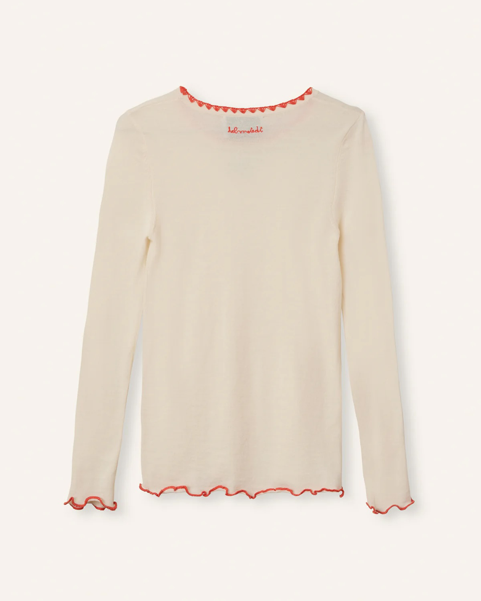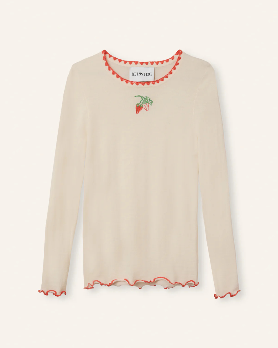 The Andrea Buttercream Helmstedt long-sleeved T-shirt in a buttercream color features the brand's signature strawberry embroidery on the front. Its simple yet elegant design makes it perfect for everyday wear with jeans, but also for many other occasions.