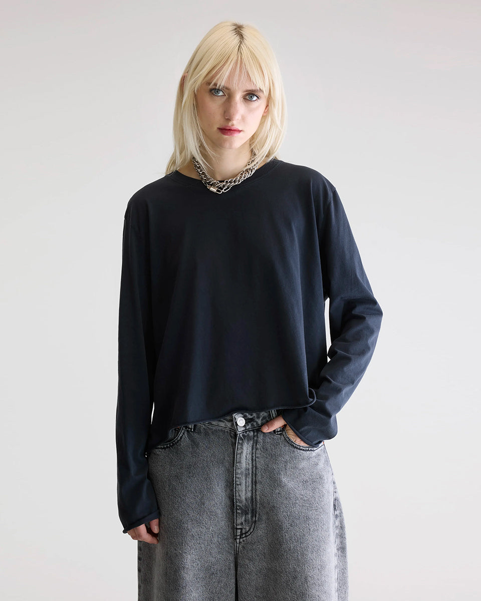 The Fercy Bellerose cotton longsleeve features a loose, boxy fit. It features a round neckline and loose, long sleeves. It's finished with a raw, rolled hem and cuffs. Crafted from soft cotton fabric.