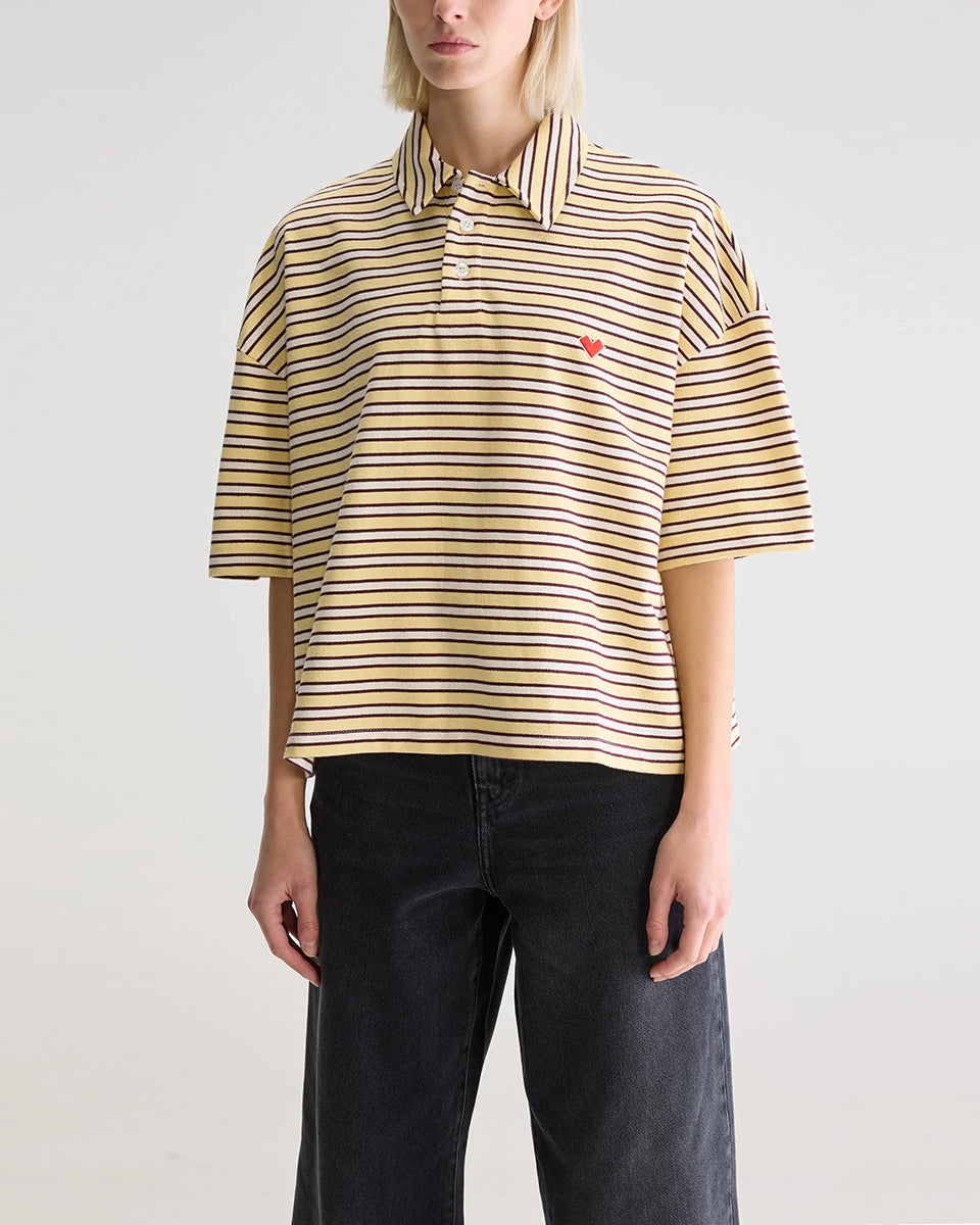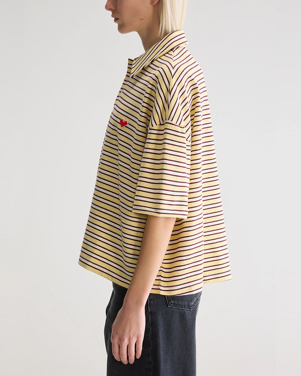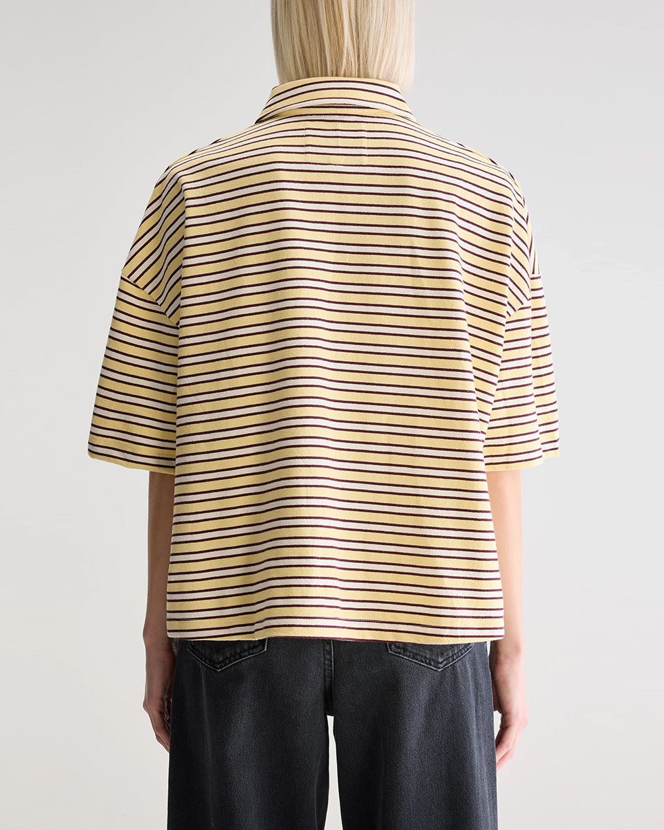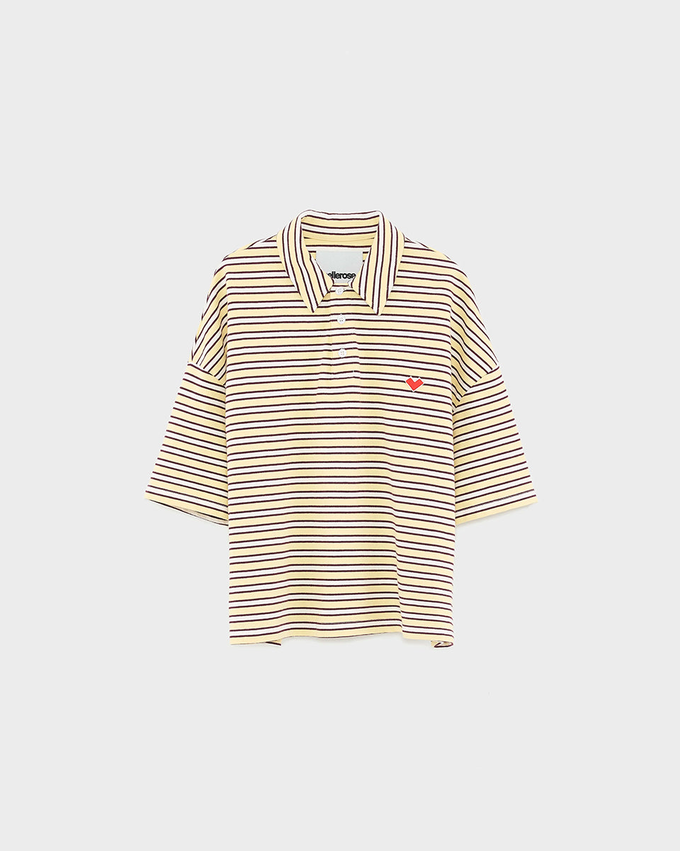 The Foolo Bellerose striped polo shirt features a loose, boxy fit and a collar, dropped shoulders, and short, wide, elbow-length sleeves. It fastens with buttons at the neckline and features a small red brand logo patch above the left breast.