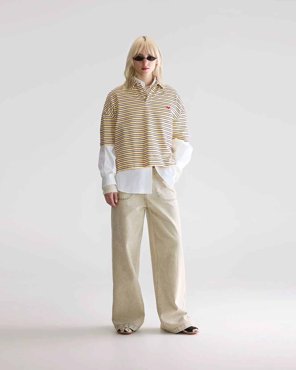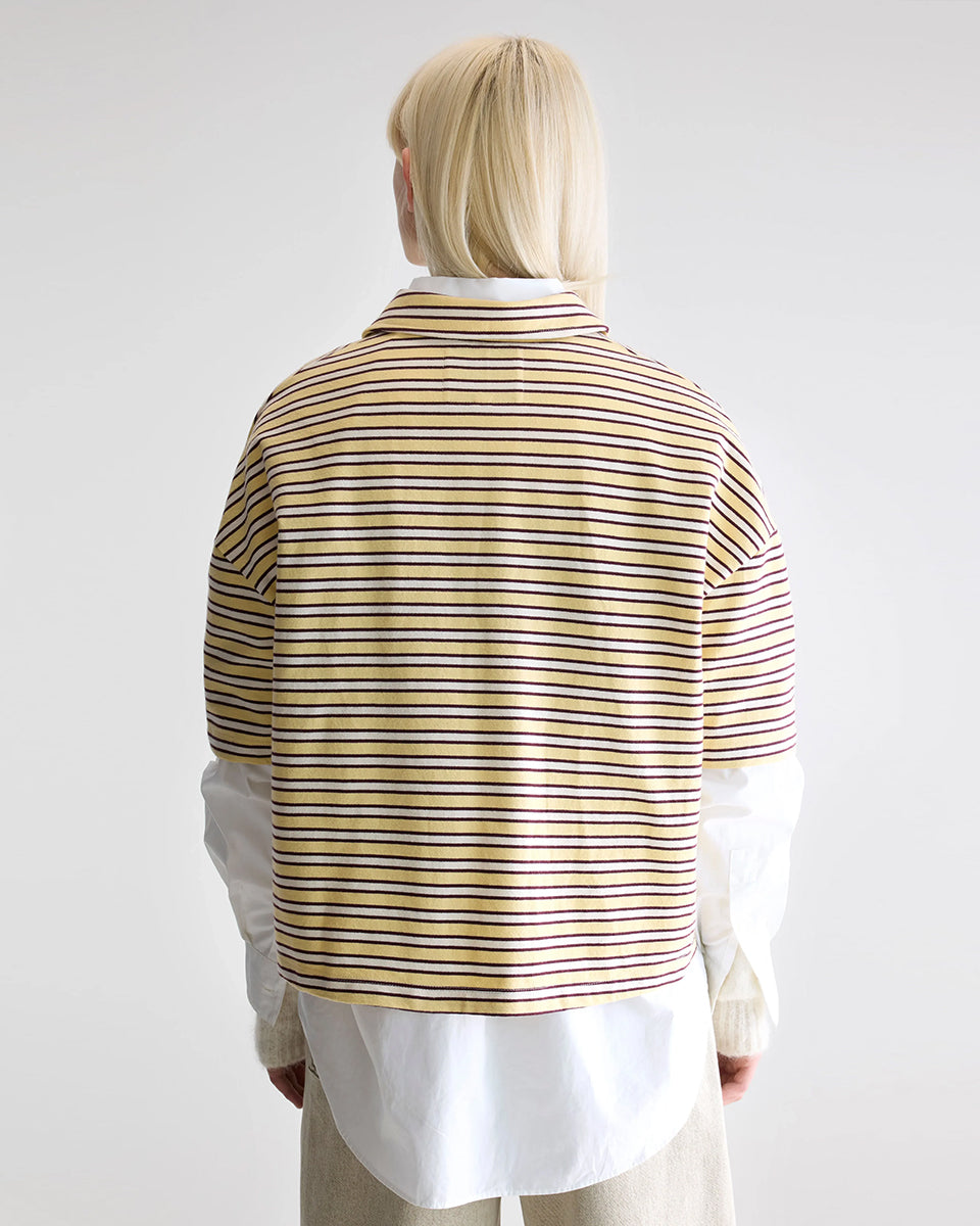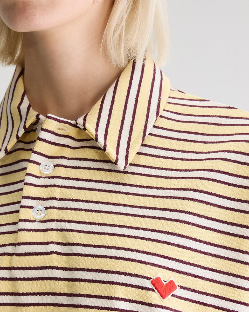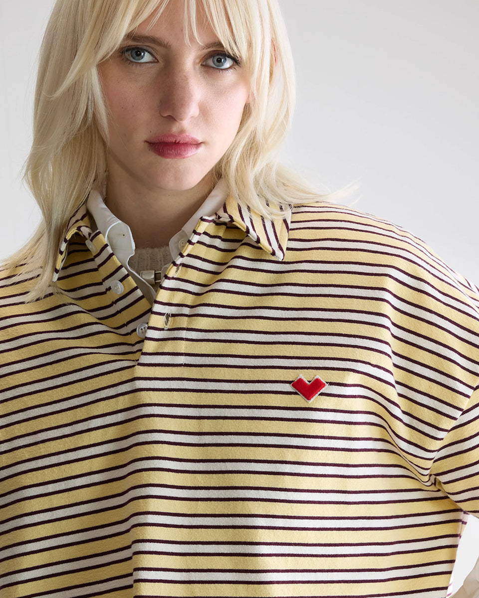 The Foolo Bellerose striped polo shirt features a loose, boxy fit and a collar, dropped shoulders, and short, wide, elbow-length sleeves. It fastens with buttons at the neckline and features a small red brand logo patch above the left breast.
