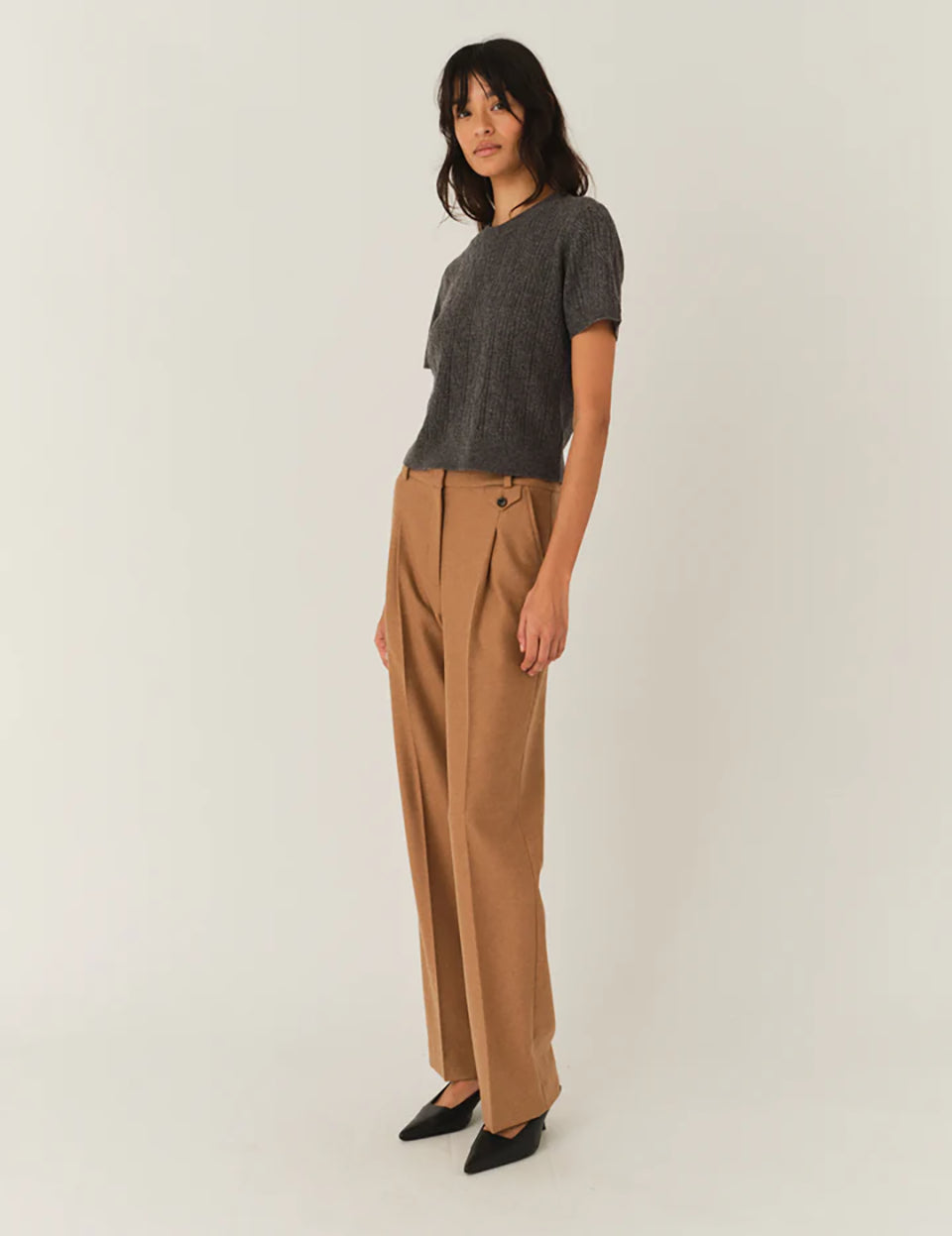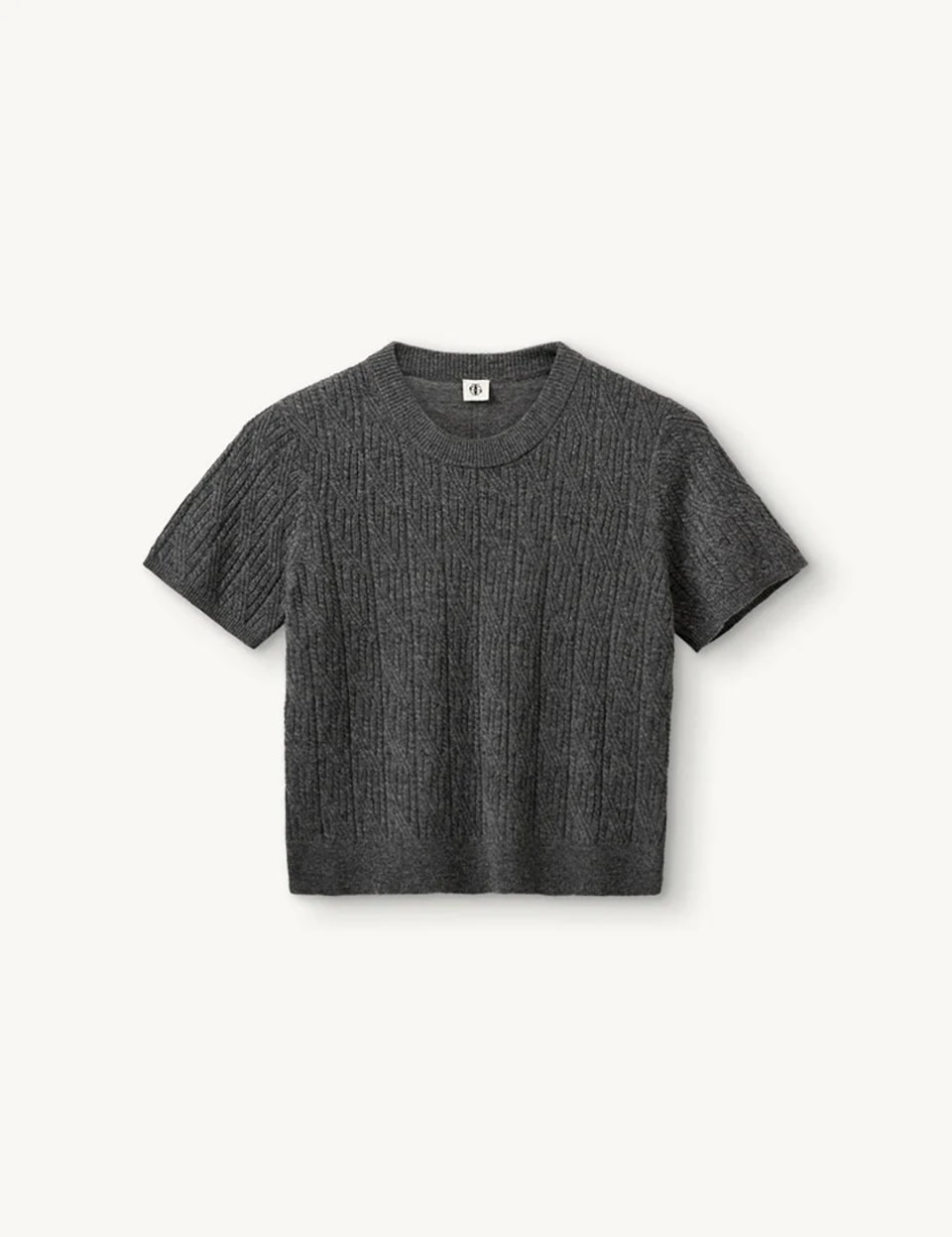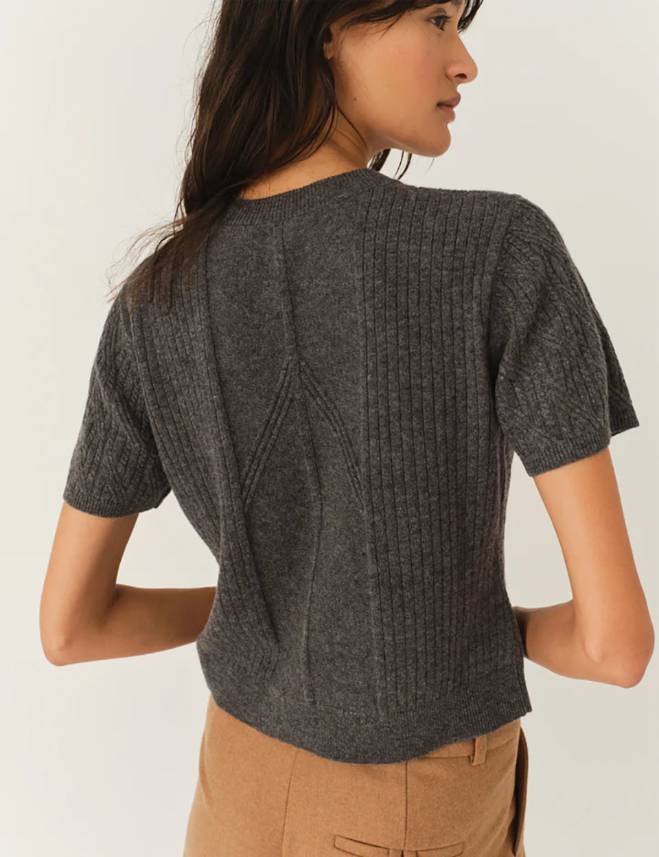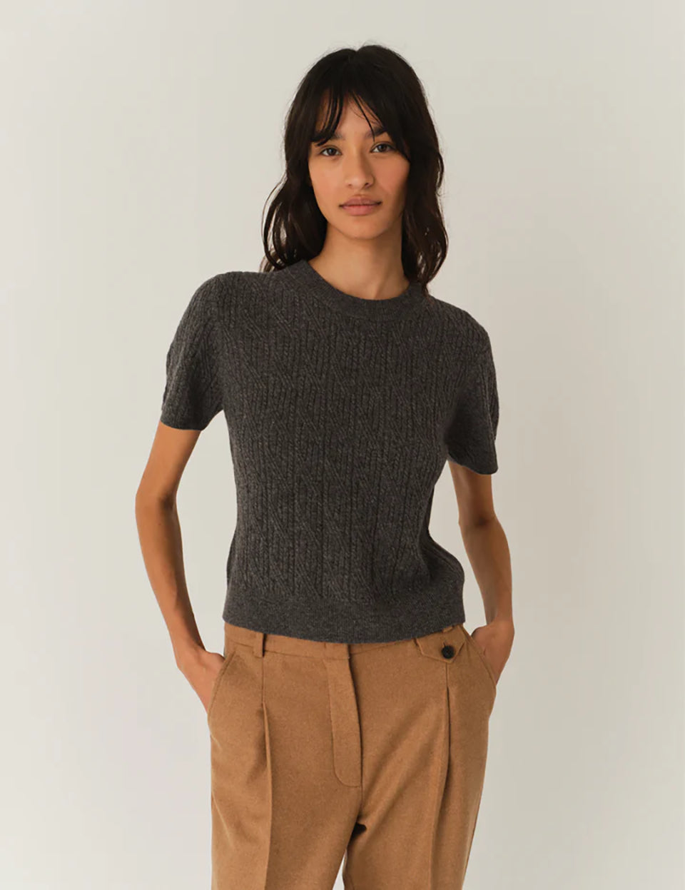 This soft, slightly cropped ribbed knit blouse in Como Grey Melange features a round neckline and short sleeves. Crafted from a wool and cashmere blend, pair it with your favorite jeans for a casual yet chic look.