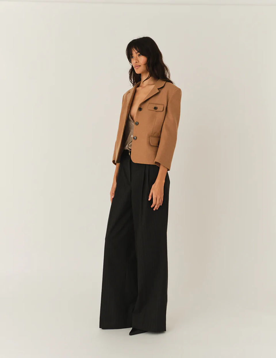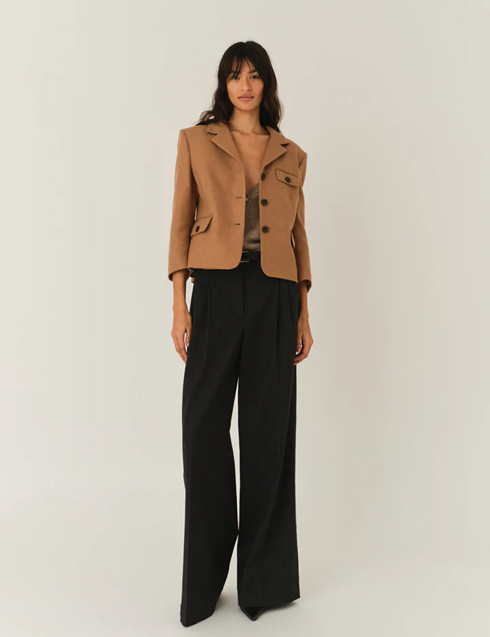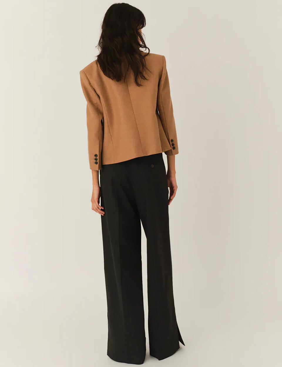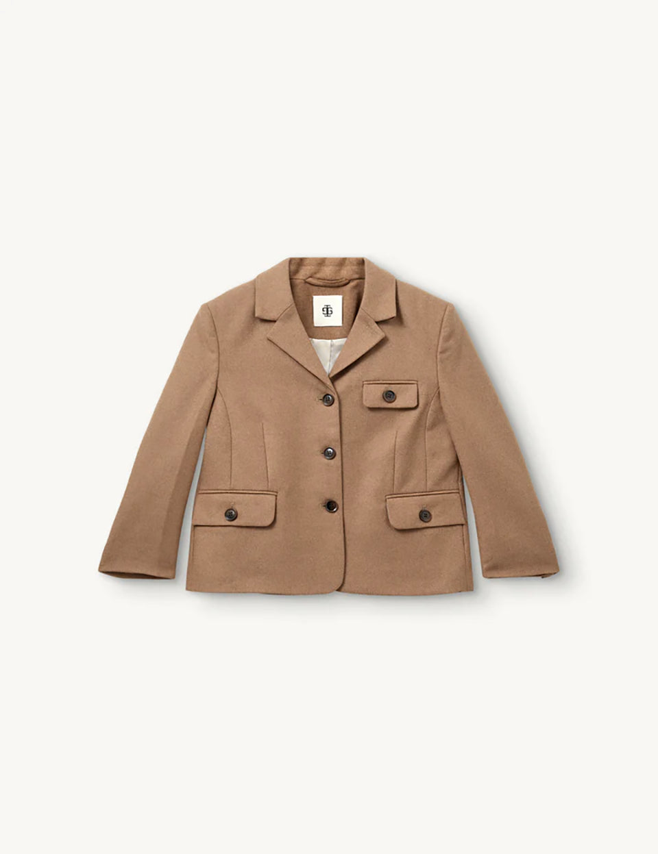 The Mitch Fitted Camel Jacket is a short, fitted jacket with a collar, sleeves with decorative buttons at the cuffs, two front pockets, and a chest pocket. It features a button closure and is made of recycled wool jersey. The tailored cut gives the jacket a feminine touch with an elegant touch. It's an alternative to the classic blazer.