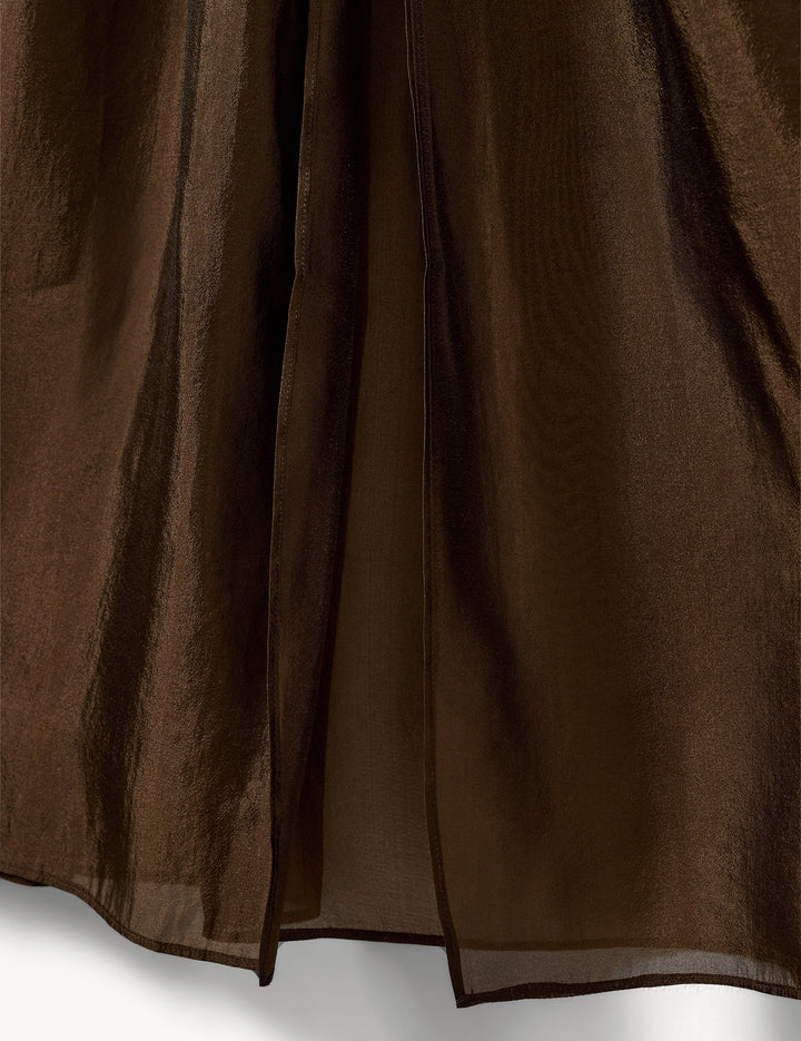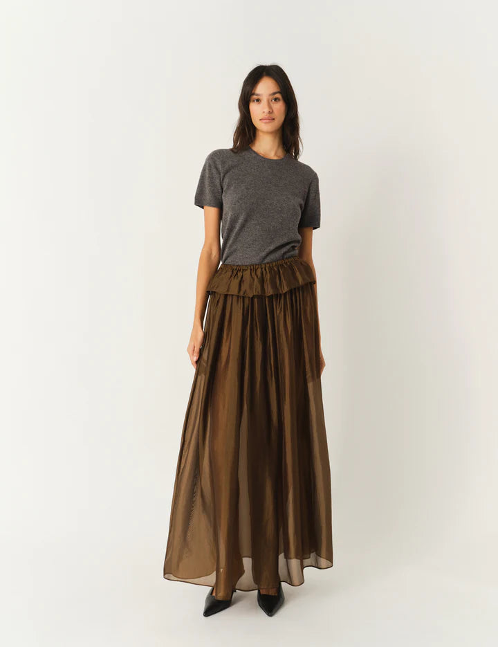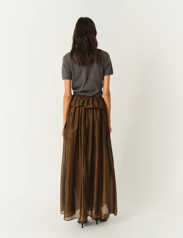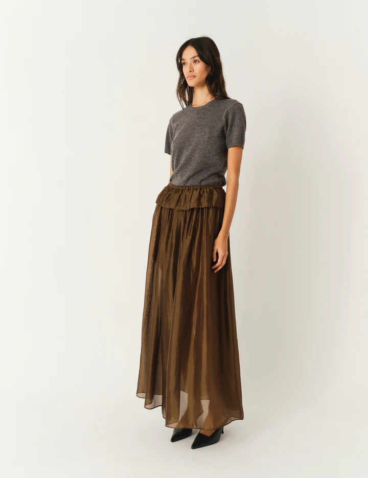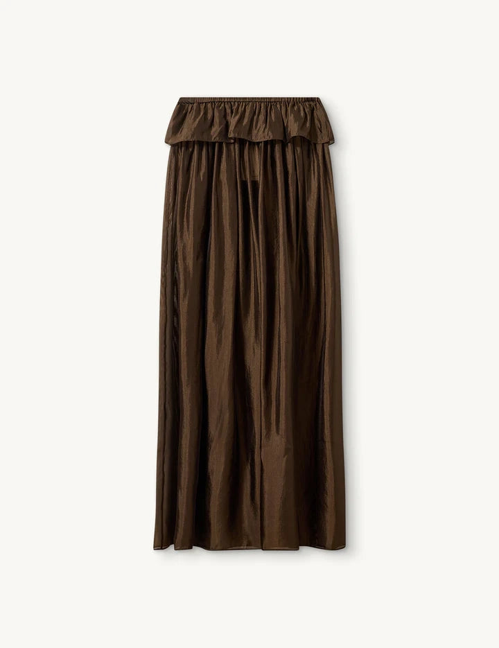 This elegant, brown maxi skirt by Gilian The Garment features a high waist and elastic waistband. It features a ruffled detail at the hips. Crafted from lightweight, semi-sheer organza, it features a deep slit at the front, allowing the skirt to move beautifully. It falls just below the ankles.