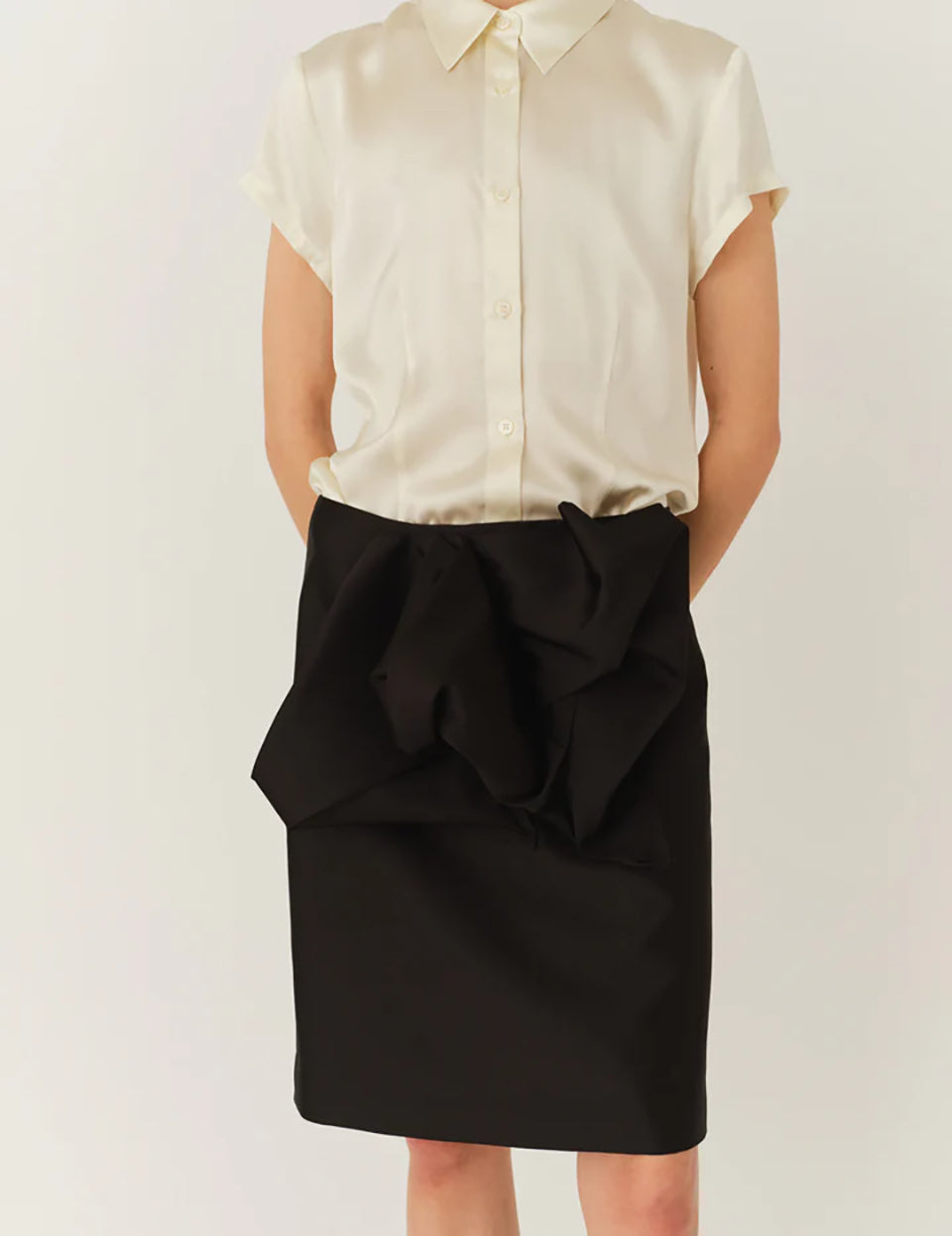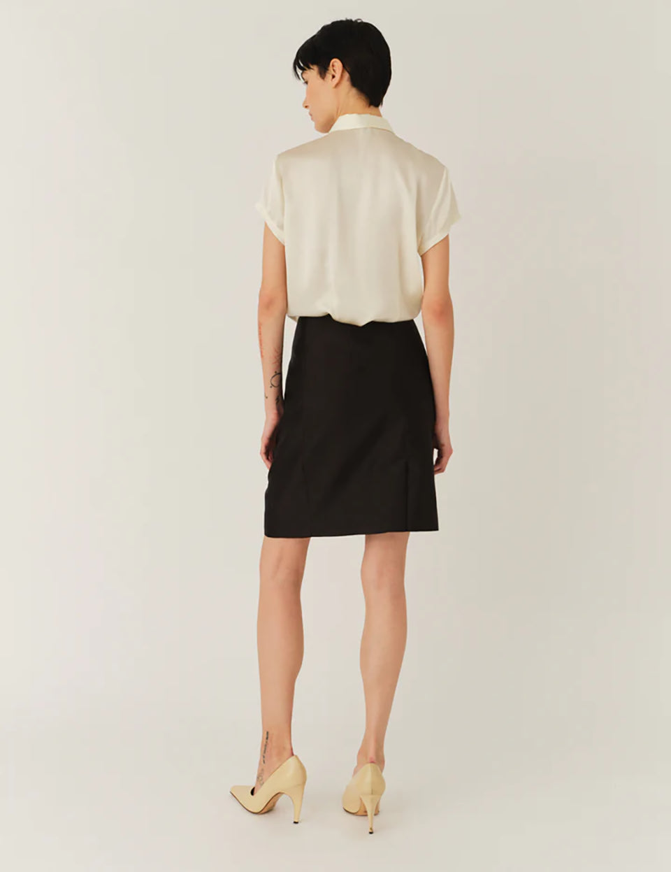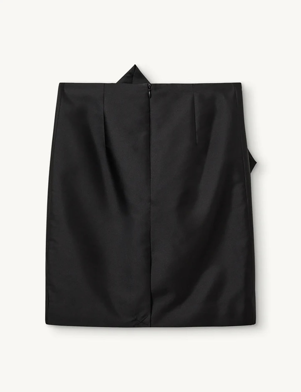 The Umami Black high-waisted skirt is crafted from a subtle shimmering fabric. It features striking detailing at the front and a zipper closure at the back. Pair it with the Umami Black blazer for a complete, elegant look.