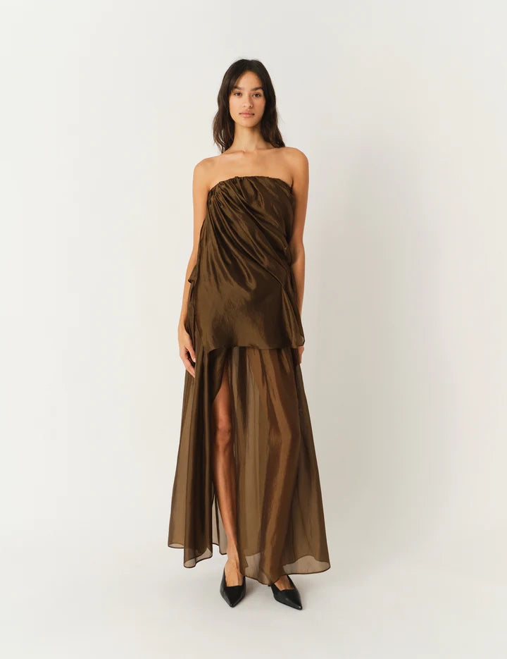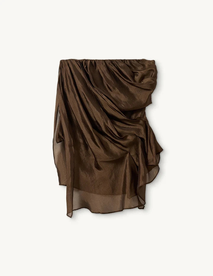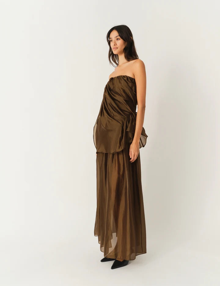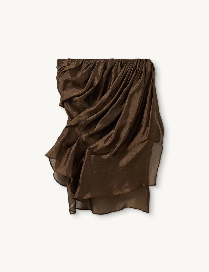 The elegant, long, strapless Gilian top features striking ruching. It features an elastic band above the bust. Crafted from lightweight, layered organza.