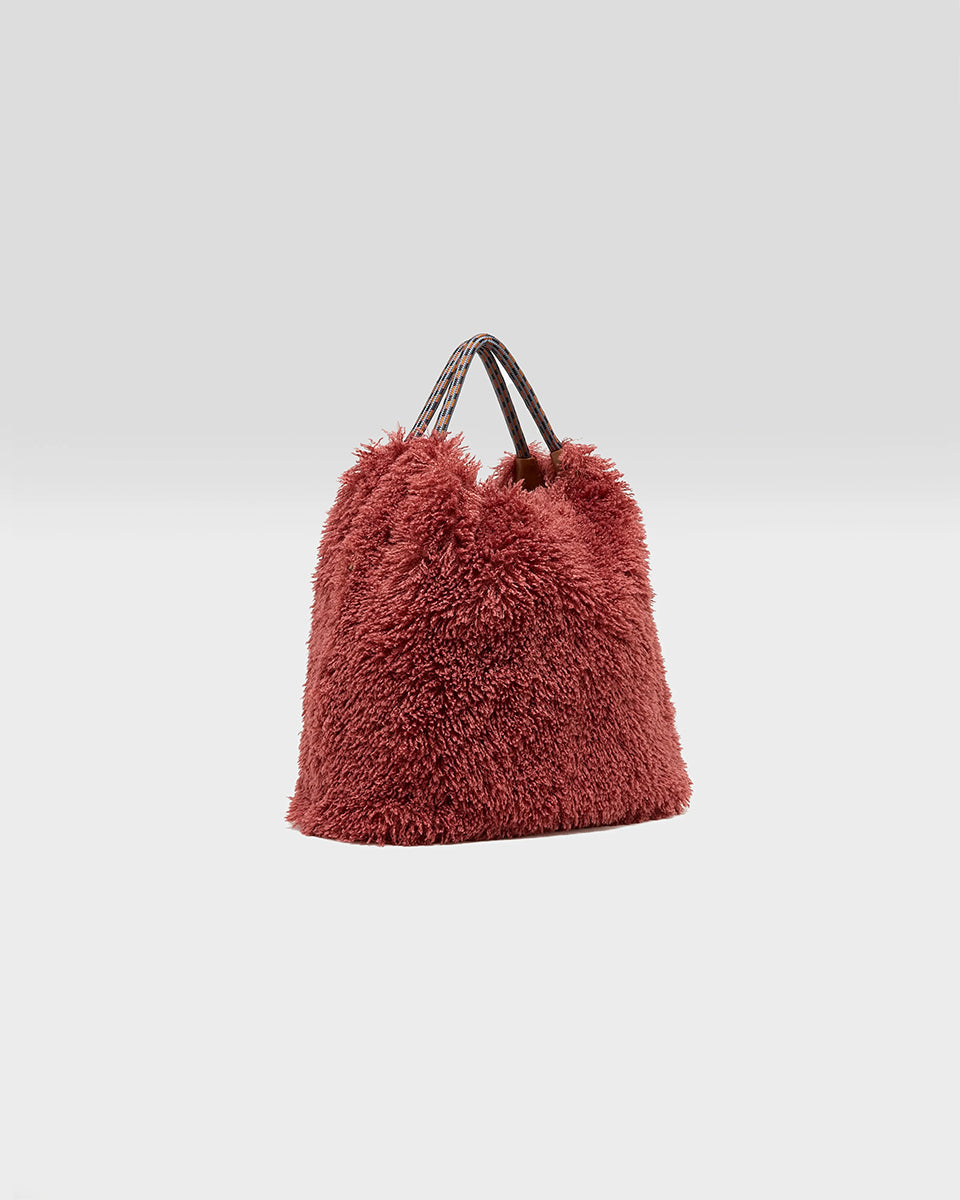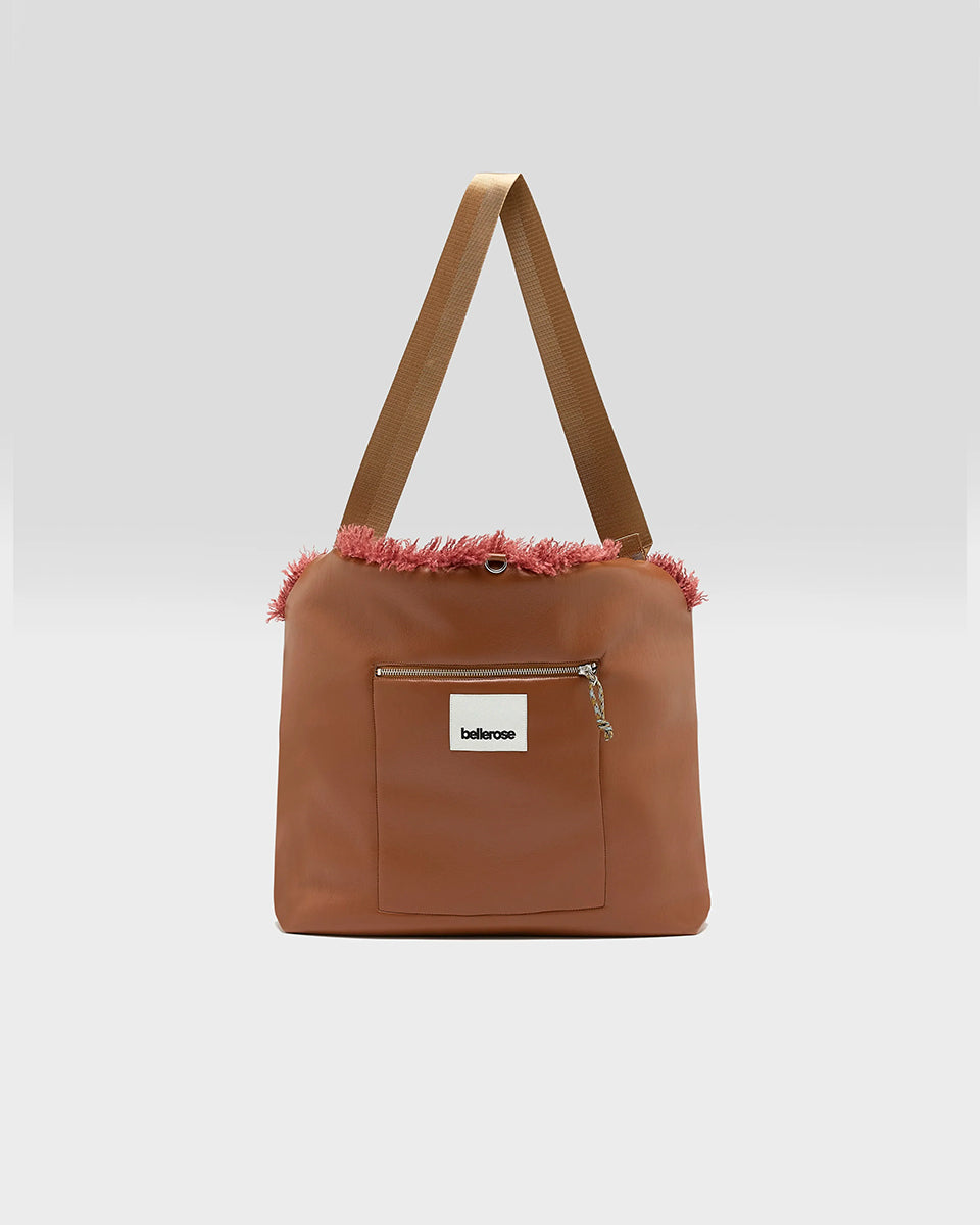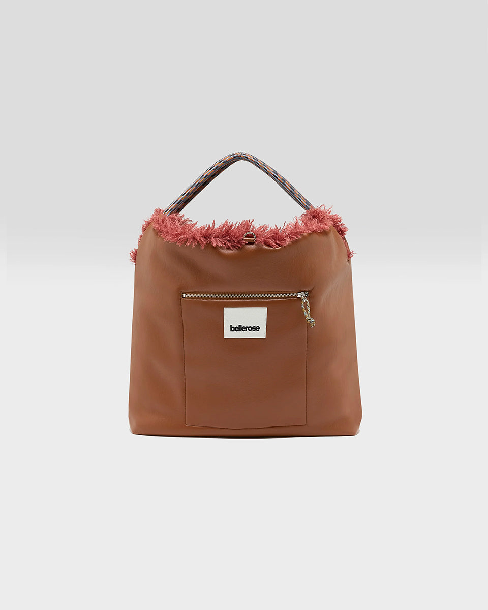 The large, reversible Hela Bellerose bag features two straps – a wide, long, and detachable one, and a shorter drawstring handle. One side is made of fluffy faux fur, while the other is made of brown eco-leather. It features a small zippered pocket for essentials. It fastens at the top with a snap hook.