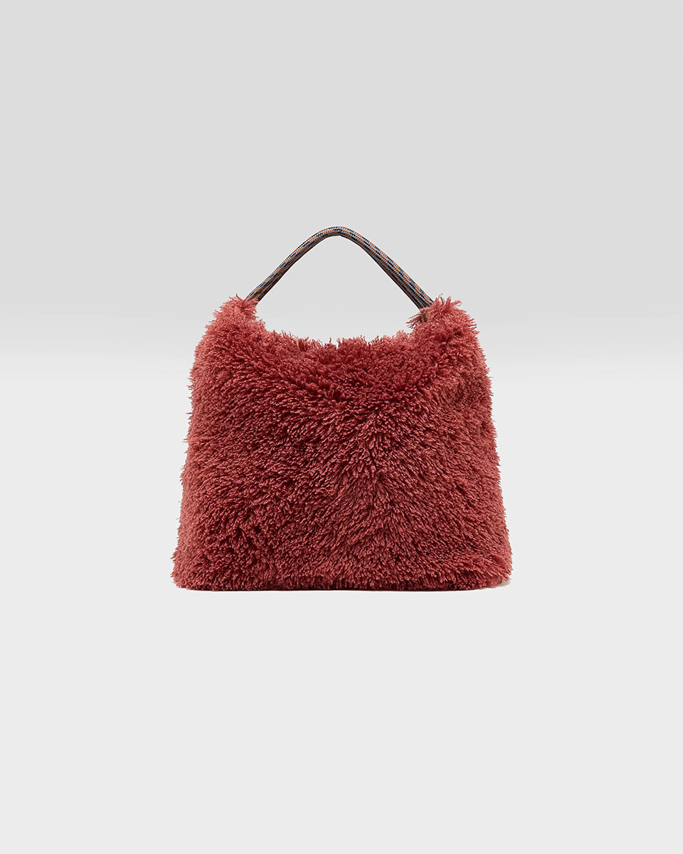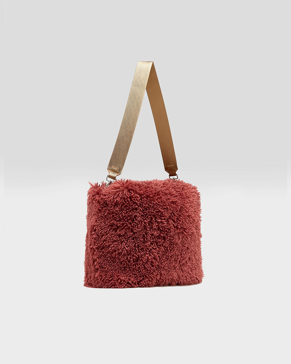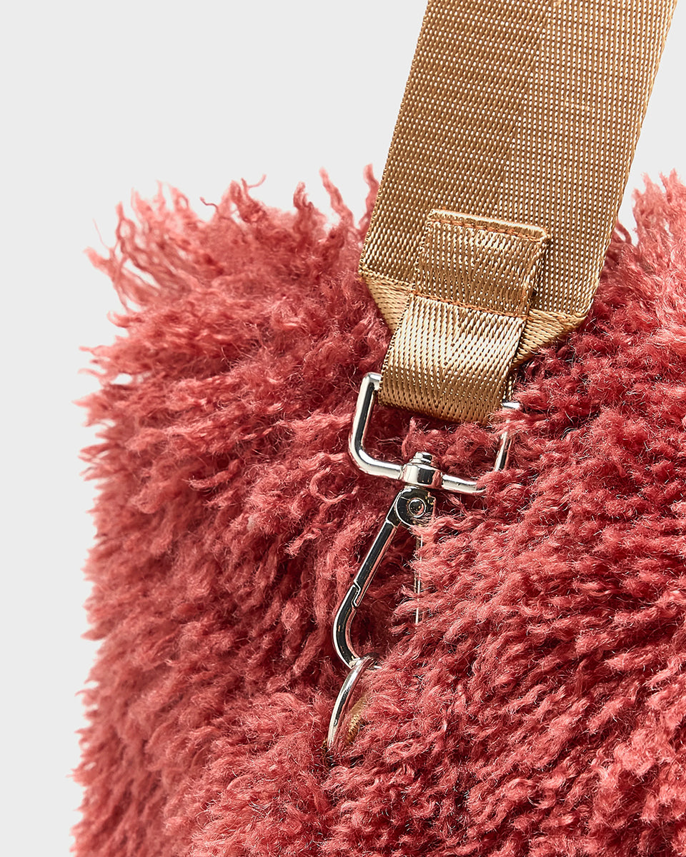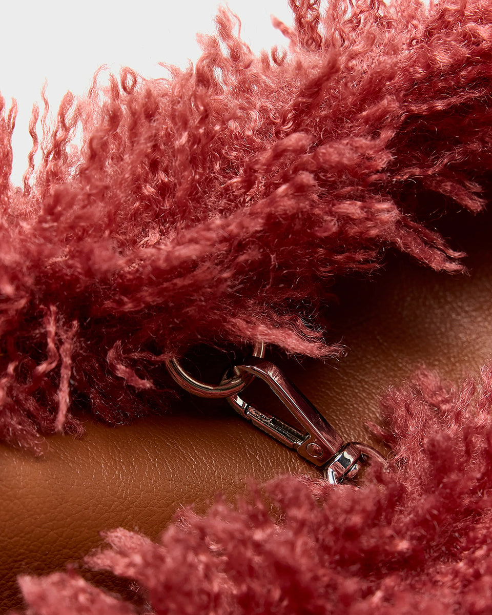 The large, reversible Hela Bellerose bag features two straps – a wide, long, and detachable one, and a shorter drawstring handle. One side is made of fluffy faux fur, while the other is made of brown eco-leather. It features a small zippered pocket for essentials. It fastens at the top with a snap hook.