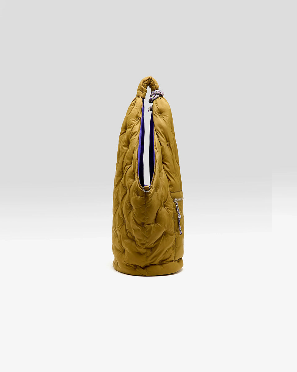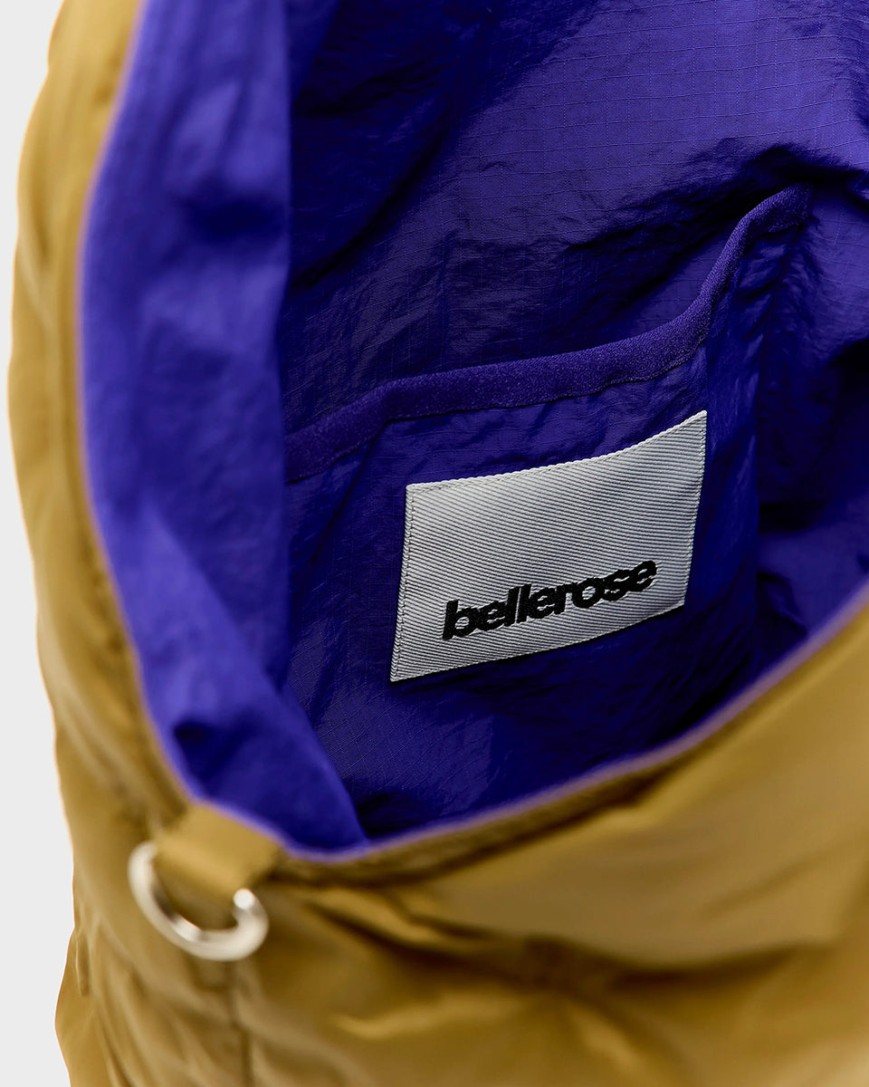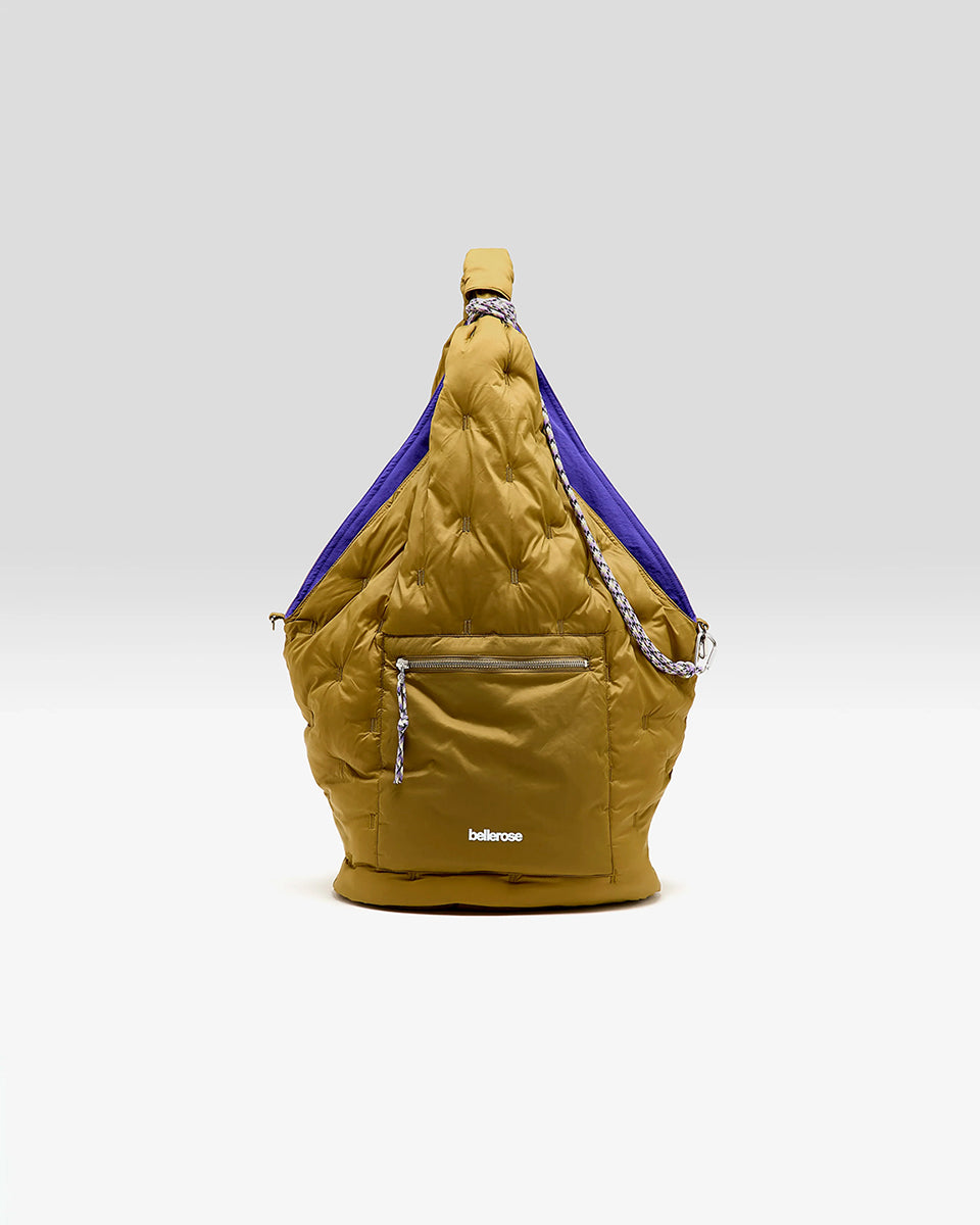 The large, quilted Hozim Bellerose sports bag is made of soft, down-filled fabric. It features a small interior pocket for essentials and is trimmed with a contrasting fabric. The bag fastens at the top with a strap and snap hook, and has an exterior zippered pocket featuring a small brand logo. Perfect for everyday use, the gym, or a weekend getaway.
