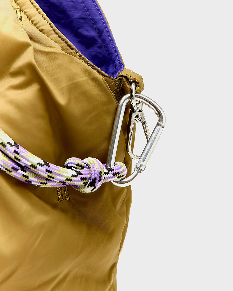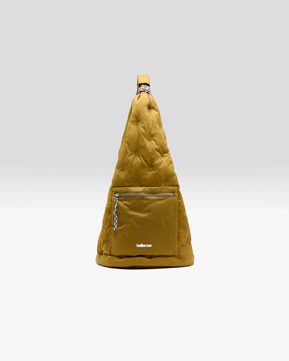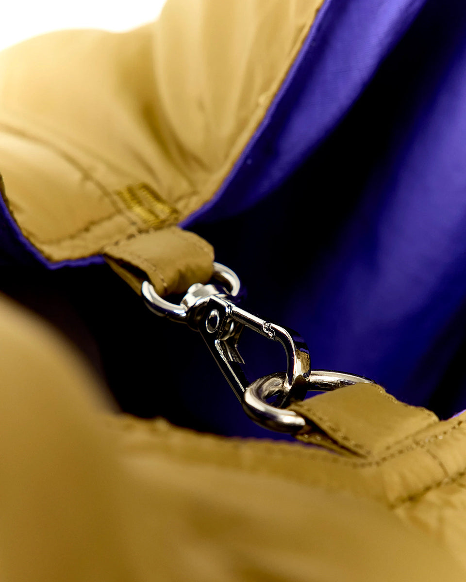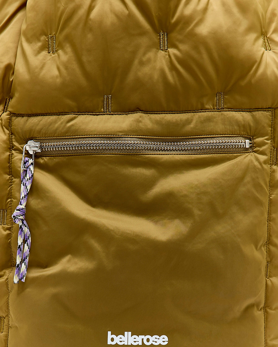 The large, quilted Hozim Bellerose sports bag is made of soft, down-filled fabric. It features a small interior pocket for essentials and is trimmed with a contrasting fabric. The bag fastens at the top with a strap and snap hook, and has an exterior zippered pocket featuring a small brand logo. Perfect for everyday use, the gym, or a weekend getaway.