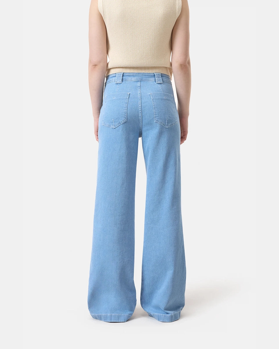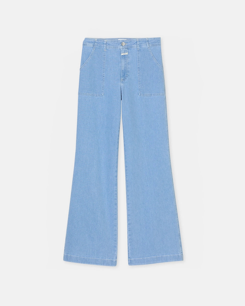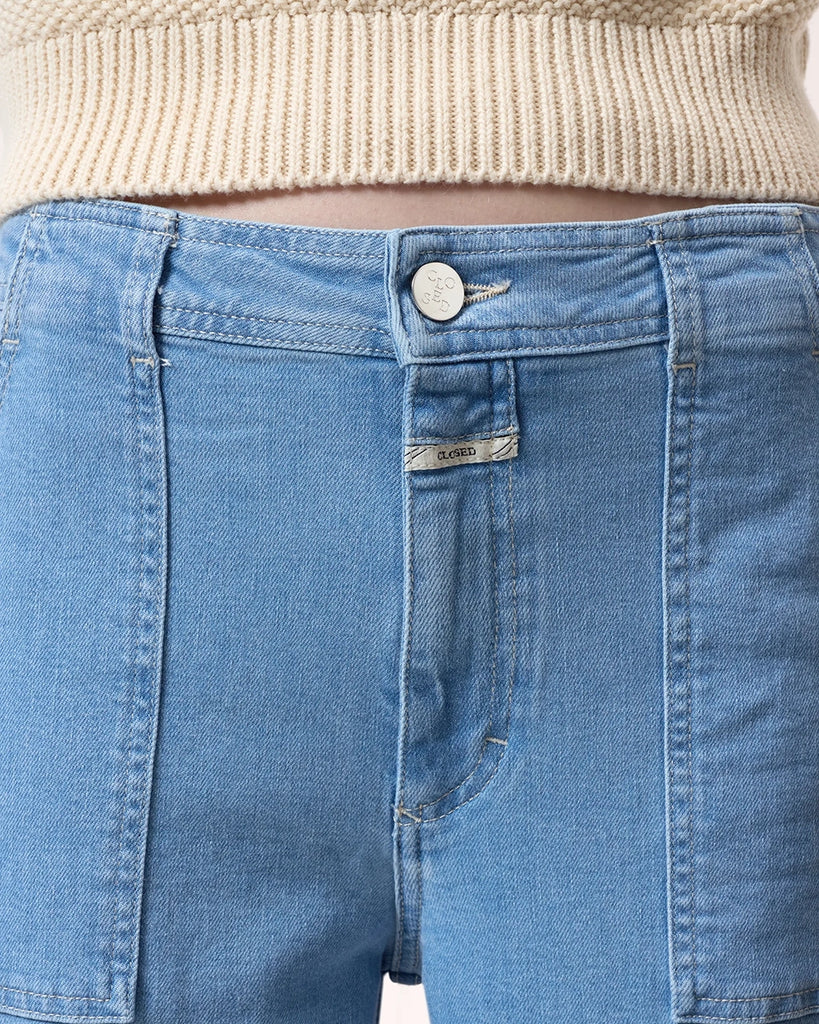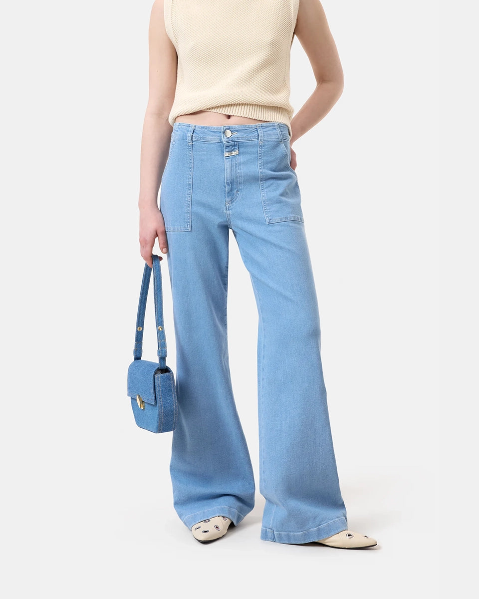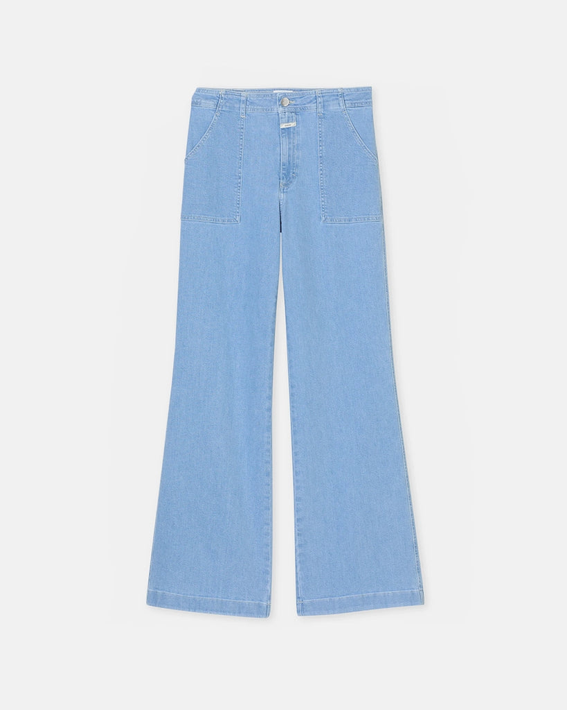 Aria CLOSED blue flared jeans with a high waist and a flared leg at the bottom. Tight on the hips and thighs. Made of very soft denim with stretch and delicate abrasions. The trousers have two front and two back pockets.