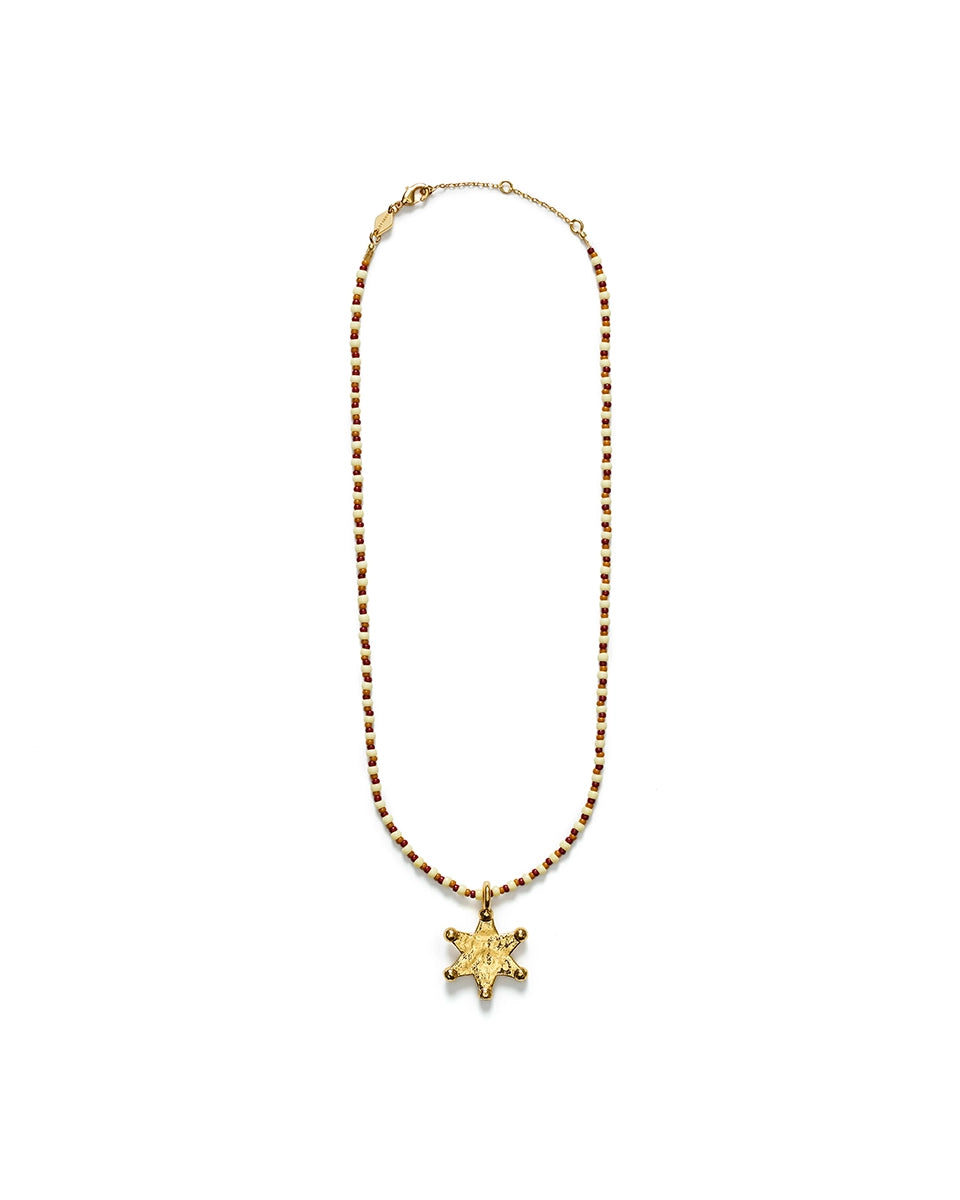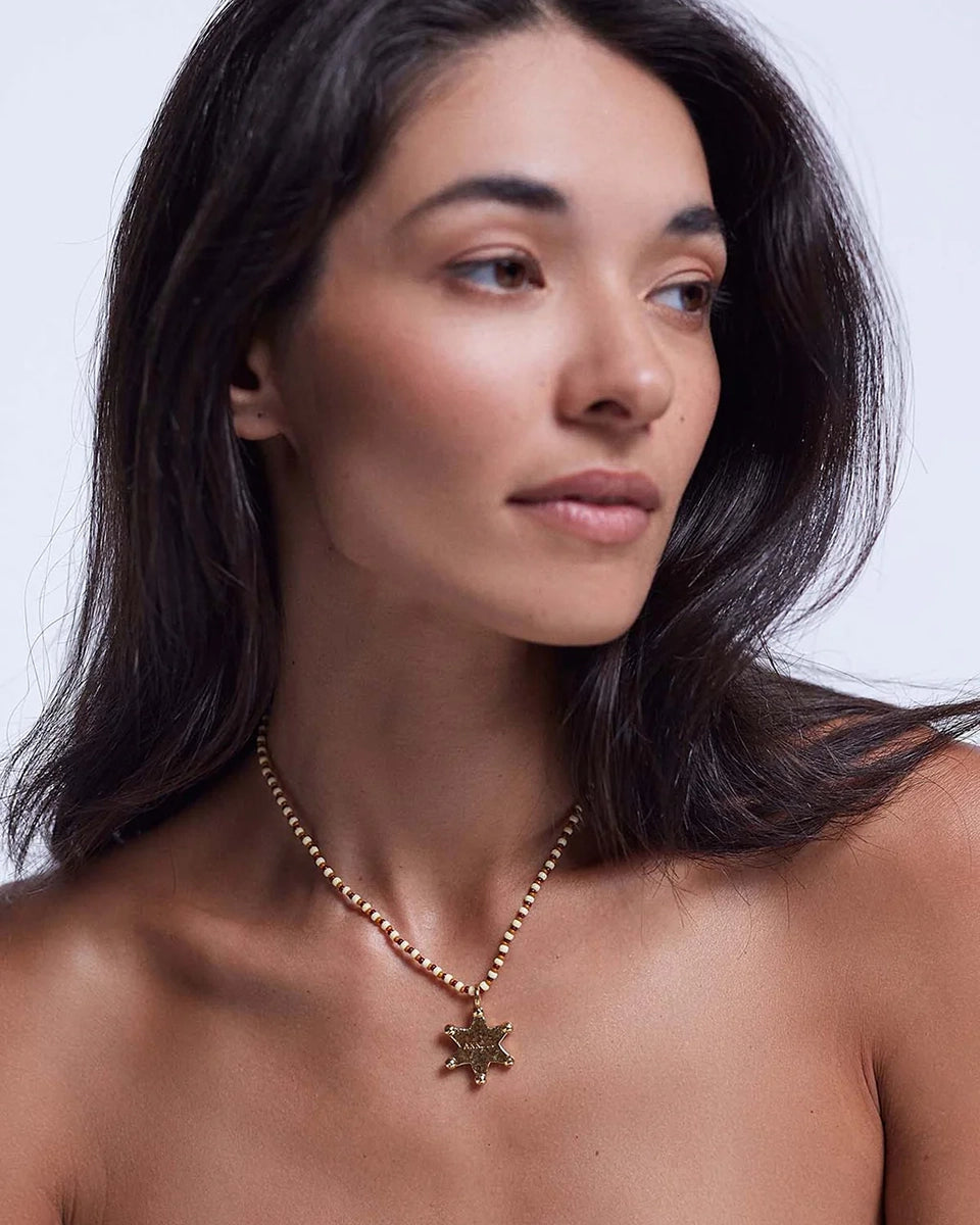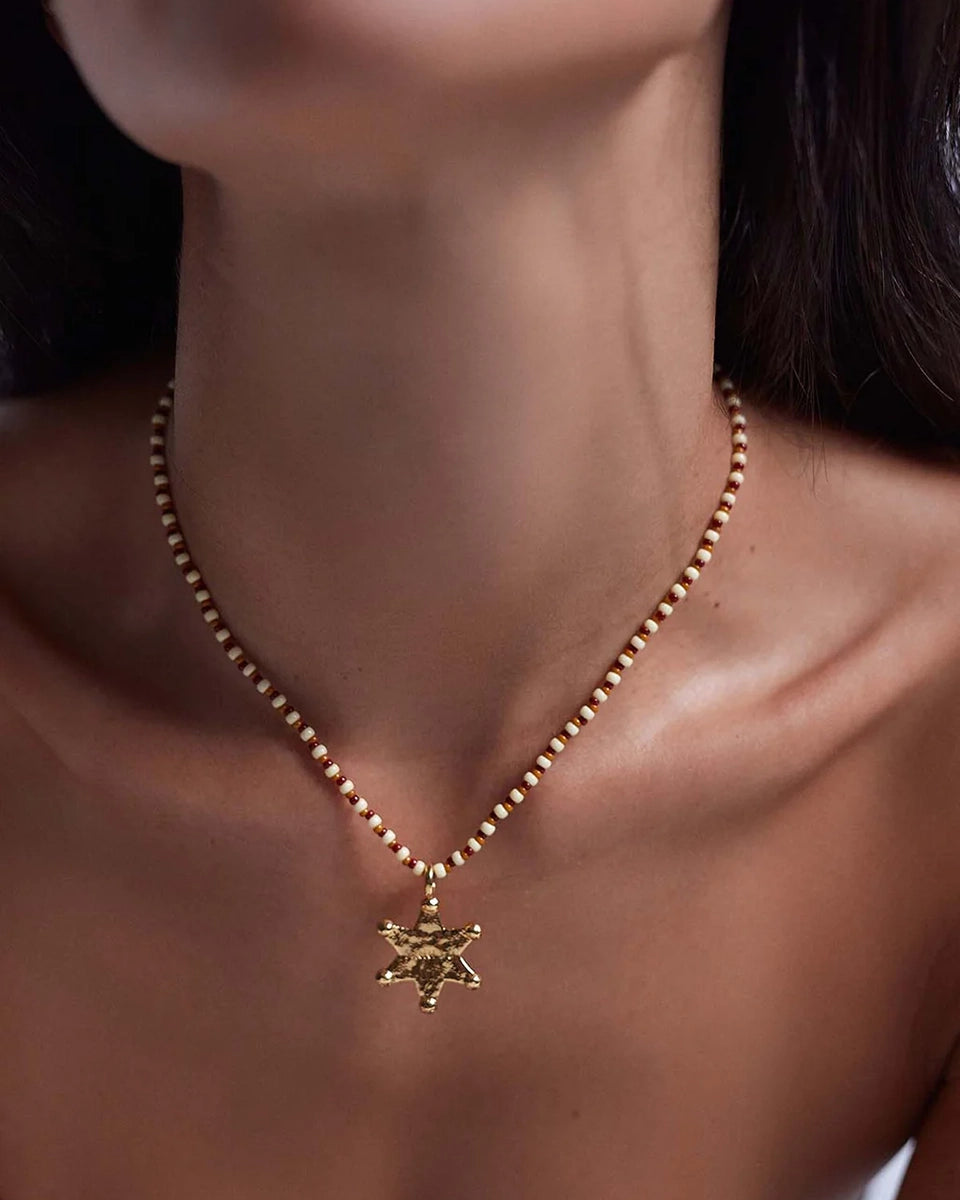 Anni Lu Lucky Star necklace features small beads in contrasting colors and a striking, large, gold-plated star-shaped pendant. Finished with a thin, gold-plated, adjustable chain.