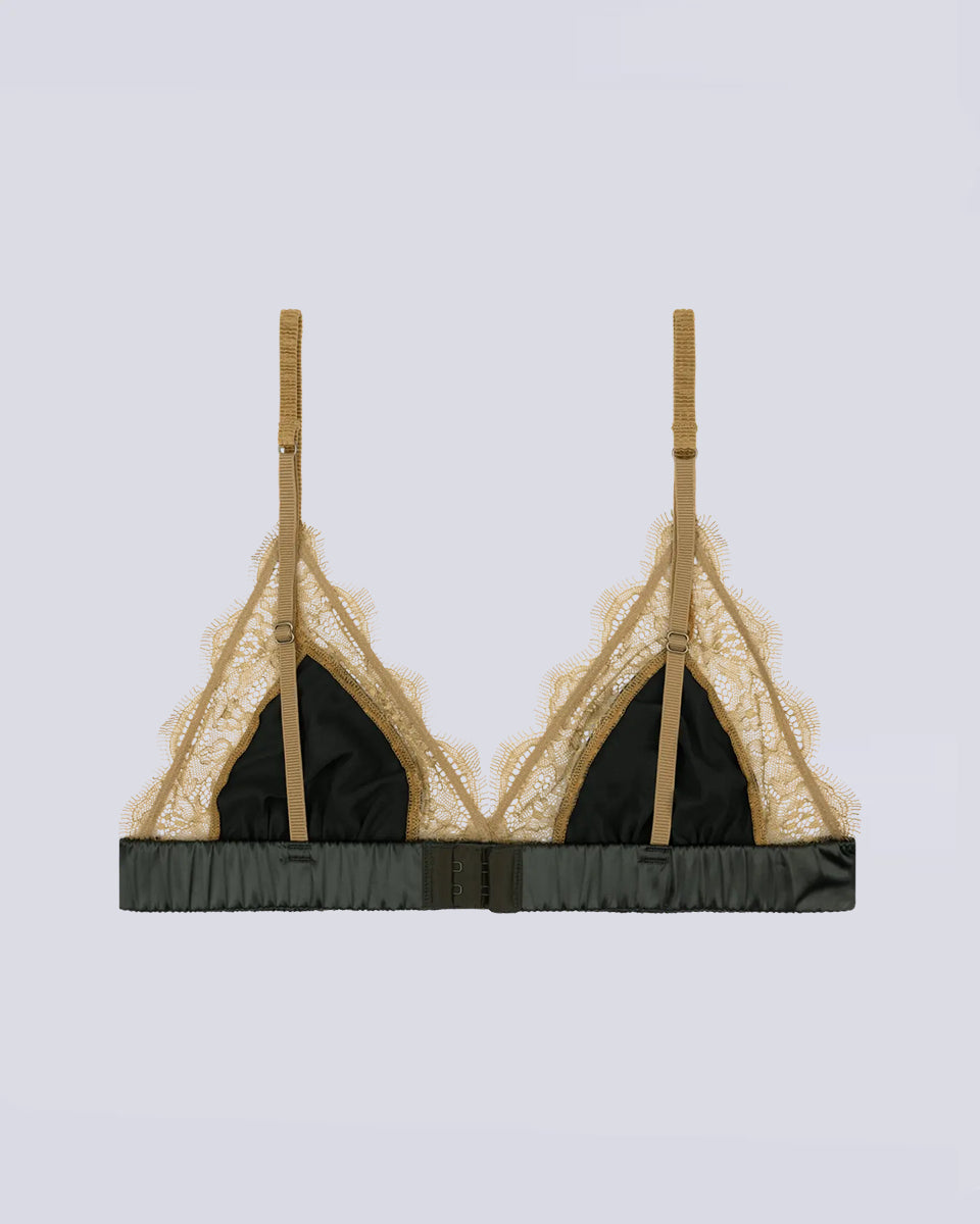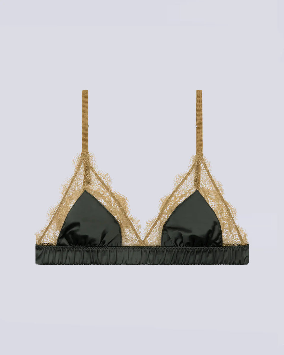 Delicate, soft bra with triangular cups Love Lace Love Stories. Made of dark green, satin fabric in off-white. The cups are trimmed with delicate lace. The bra has a wide elastic band under the bust and adjustable, ruched straps. Fastened at the back with hooks.